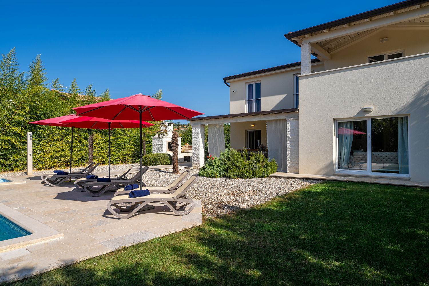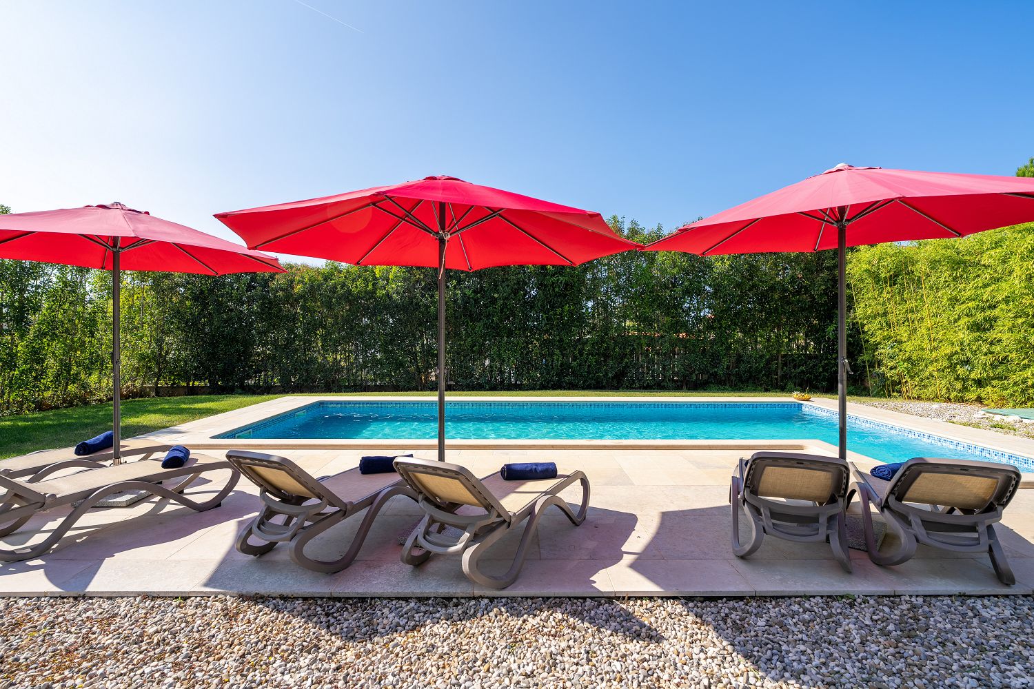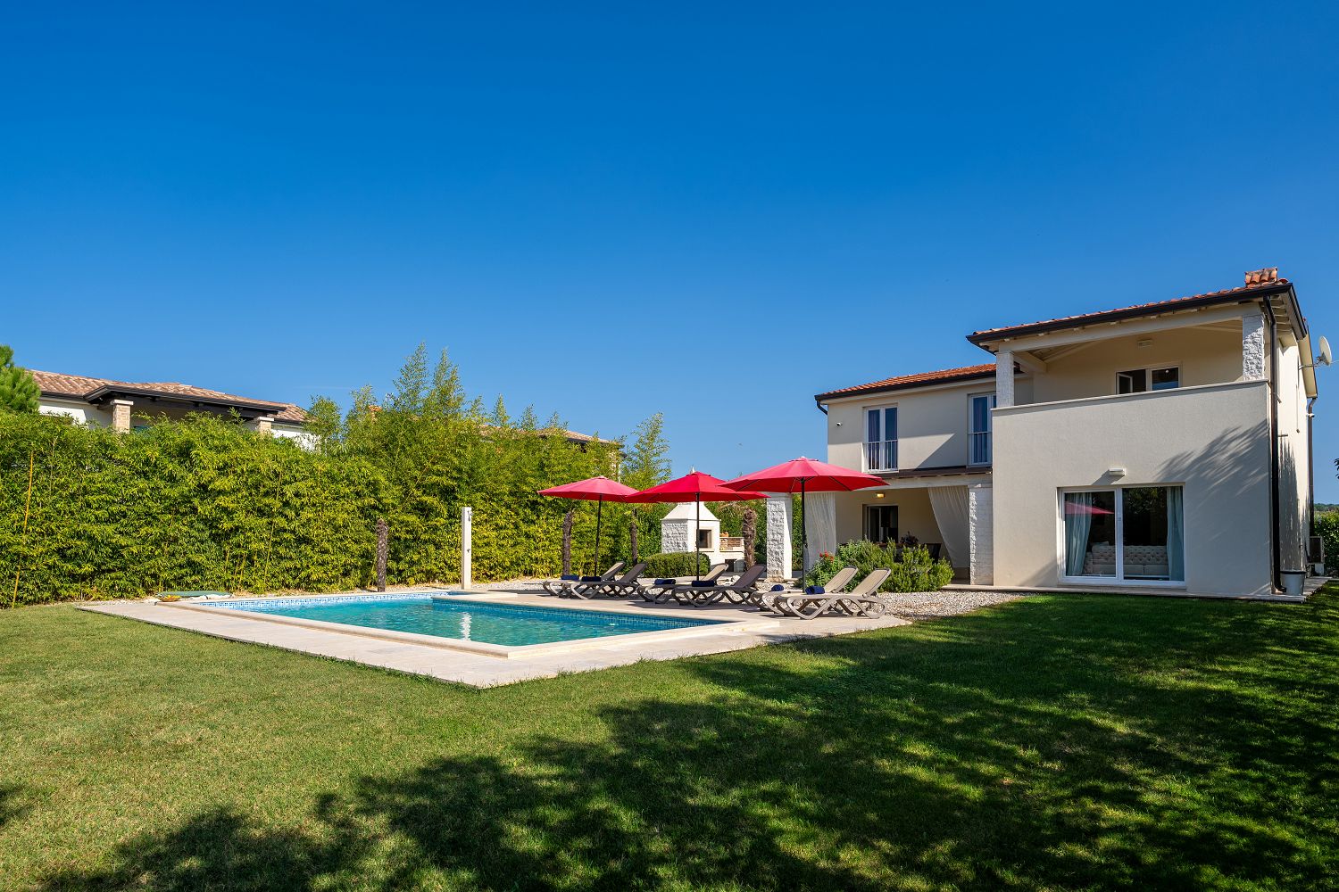 Die neu erbaute Villa mit Pool liegt am Rande des Ortes Labinci, unweit von Porec. In Kaštelir, nur 2–3 Autominuten entfernt, gibt es viele nützliche Einrichtungen, darunter ein Lebensmittelgeschäft (500 m vom Haus entfernt) sowie typische Restaurants, Kaffeebars, Agrotourismusbetriebe und Weinstraßen. Die nächsten Kiesstrände sowie Sport- und Freizeiteinrichtungen befinden sich im 9 km entfernten Touristenort Lanterna. Das Haus verfügt über einen eigenen, ca. 1.100 m² großen, gepflegten Garten, der ruhig gelegen ist und einen wunderschönen Panoramablick auf das Meer bietet. Im Außenbereich bietet die Villa Domenica Exclusive ihren Gästen einen privaten, überdachten Parkplatz für zwei Fahrzeuge, einen 40 m² großen Pool mit Liegestühlen und Sitzgarnitur, eine überdachte Terrasse mit Sitzgelegenheiten sowie einen gemauerten Grill. Die Villa ist 200 m² groß, voll klimatisiert und für acht Personen ausgelegt. Sie erstreckt sich über zwei Etagen. Im Erdgeschoss befinden sich eine Küche mit Esstisch, ein geräumiges Wohnzimmer mit Zugang zu einer überdachten Terrasse und Pool sowie ein Schlafzimmer mit Dusche/WC. Im Flur steht eine weitere Dusche/WC zur Verfügung. Im ersten Stock befinden sich drei geräumige Schlafzimmer mit Doppelbetten und jeweils eigener Dusche/WC, eines davon mit Balkon und wunderschönem Panoramablick auf das Meer. Haustiere sind erlaubt. Jugendgruppen sind nicht gestattet.