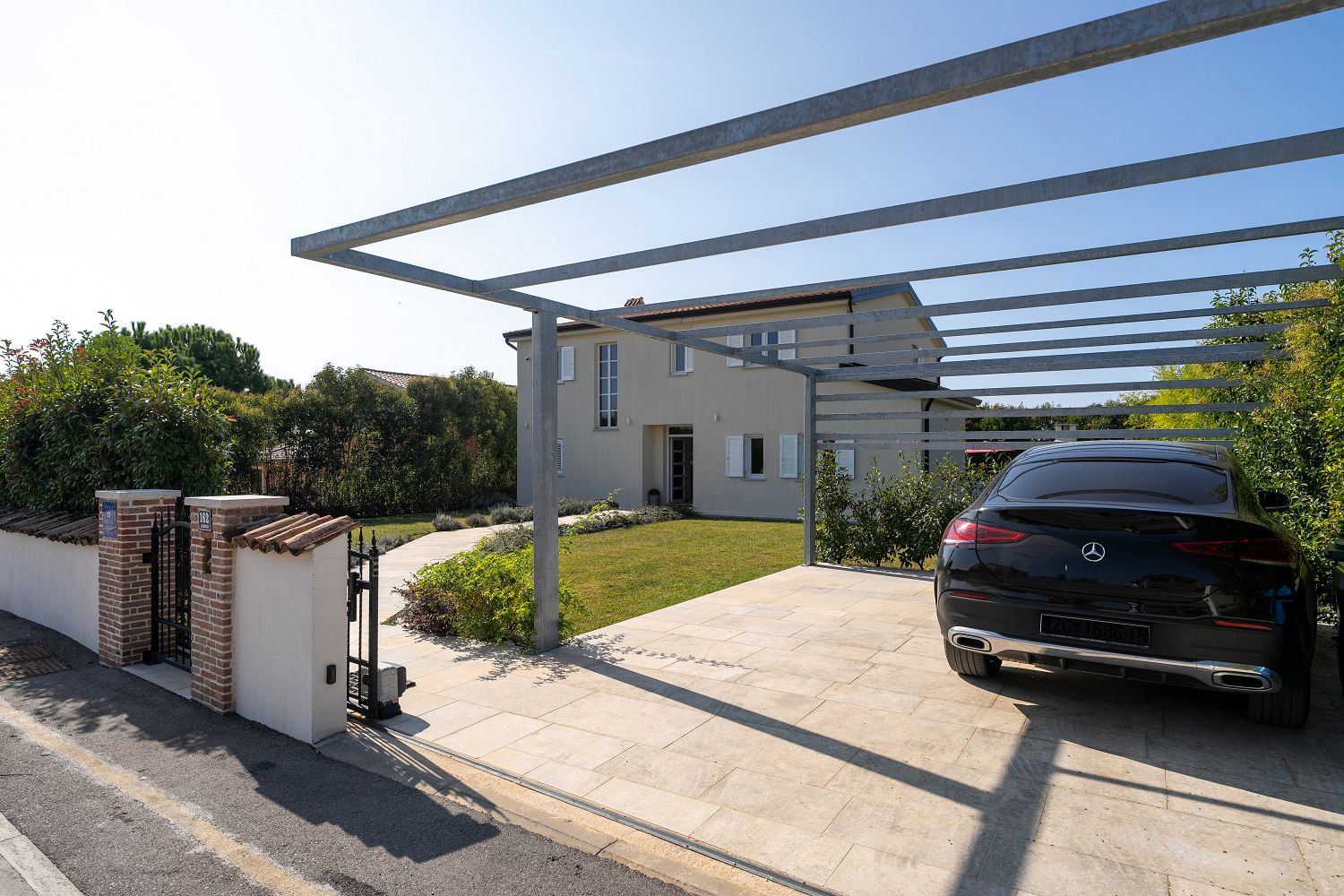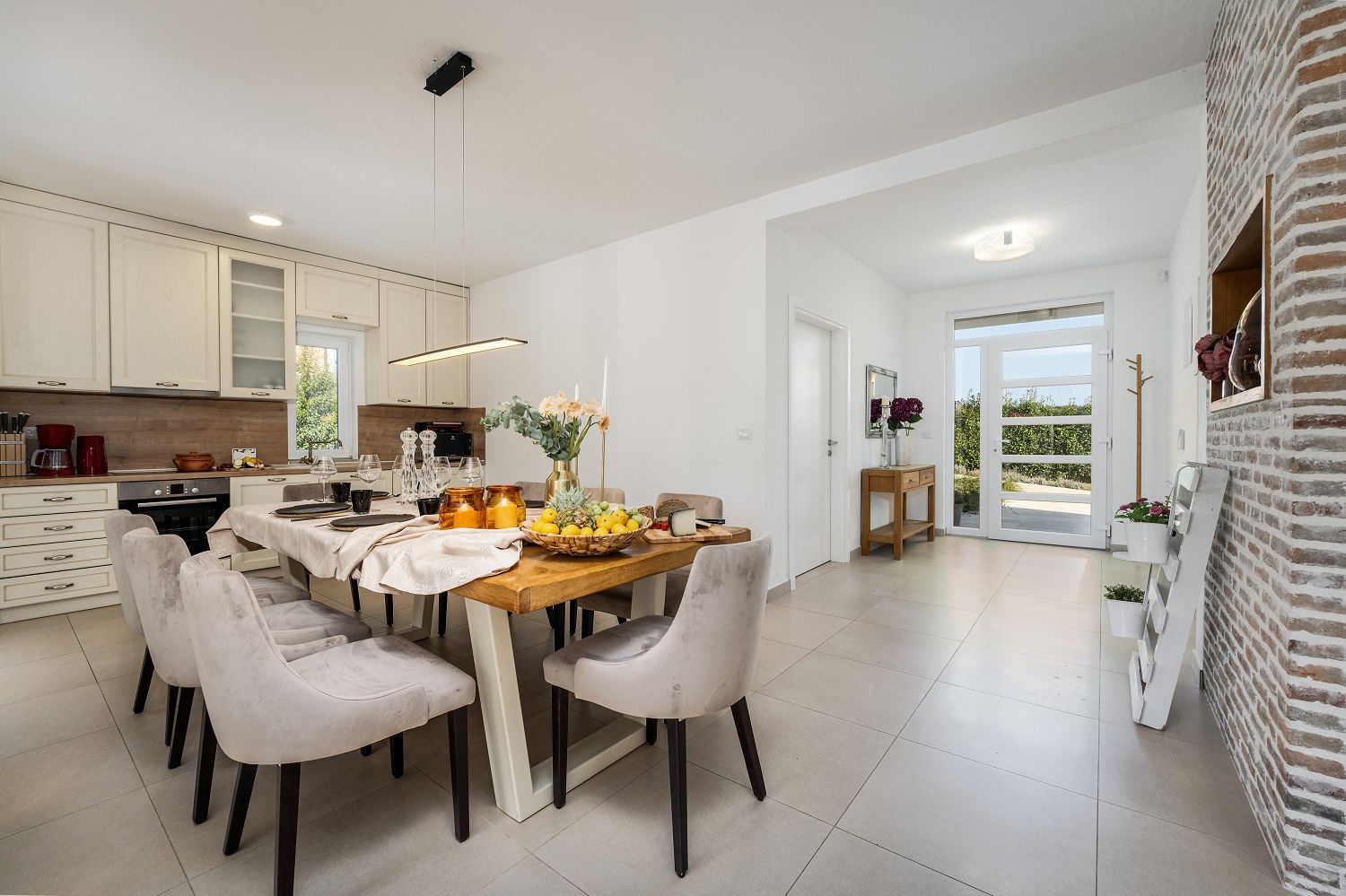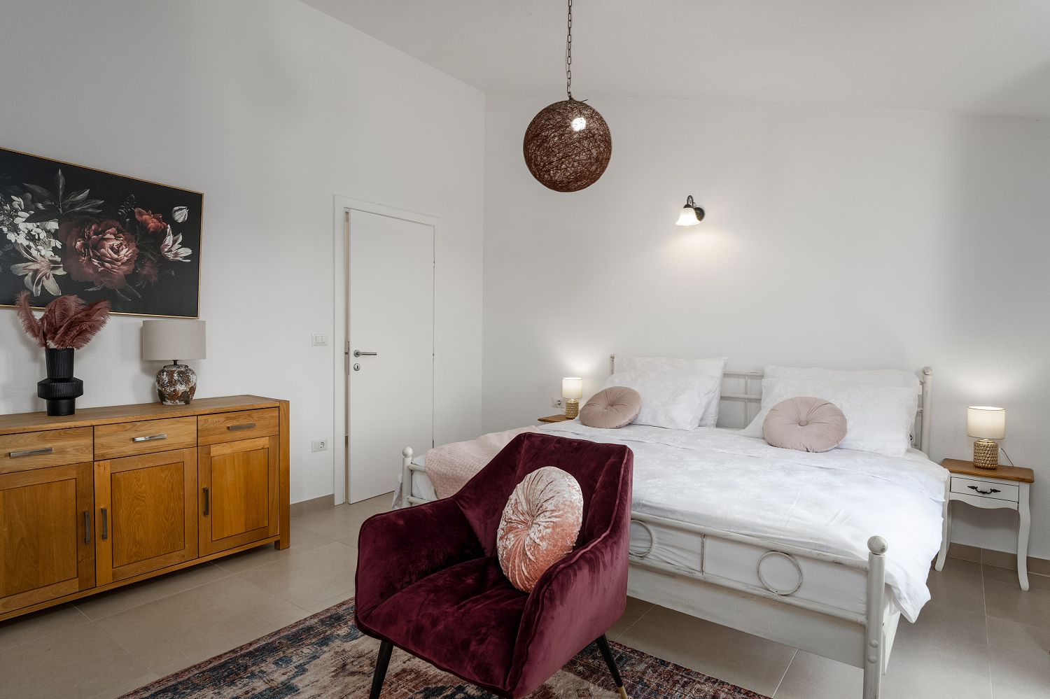 Die neu erbaute Villa mit Pool liegt am Rande des Ortes Labinci, unweit von Porec. In Kaštelir, nur 2–3 Autominuten entfernt, gibt es viele nützliche Einrichtungen, darunter ein Lebensmittelgeschäft (500 m vom Haus entfernt) sowie typische Restaurants, Kaffeebars, Agrotourismusbetriebe und Weinstraßen. Die nächsten Kiesstrände sowie Sport- und Freizeiteinrichtungen befinden sich im 9 km entfernten Touristenort Lanterna. Das Haus verfügt über einen eigenen, ca. 1.100 m² großen, gepflegten Garten, der ruhig gelegen ist und einen wunderschönen Panoramablick auf das Meer bietet. Im Außenbereich bietet die Villa Domenica Exclusive ihren Gästen einen privaten, überdachten Parkplatz für zwei Fahrzeuge, einen 40 m² großen Pool mit Liegestühlen und Sitzgarnitur, eine überdachte Terrasse mit Sitzgelegenheiten sowie einen gemauerten Grill. Die Villa ist 200 m² groß, voll klimatisiert und für acht Personen ausgelegt. Sie erstreckt sich über zwei Etagen. Im Erdgeschoss befinden sich eine Küche mit Esstisch, ein geräumiges Wohnzimmer mit Zugang zu einer überdachten Terrasse und Pool sowie ein Schlafzimmer mit Dusche/WC. Im Flur steht eine weitere Dusche/WC zur Verfügung. Im ersten Stock befinden sich drei geräumige Schlafzimmer mit Doppelbetten und jeweils eigener Dusche/WC, eines davon mit Balkon und wunderschönem Panoramablick auf das Meer. Haustiere sind erlaubt. Jugendgruppen sind nicht gestattet.