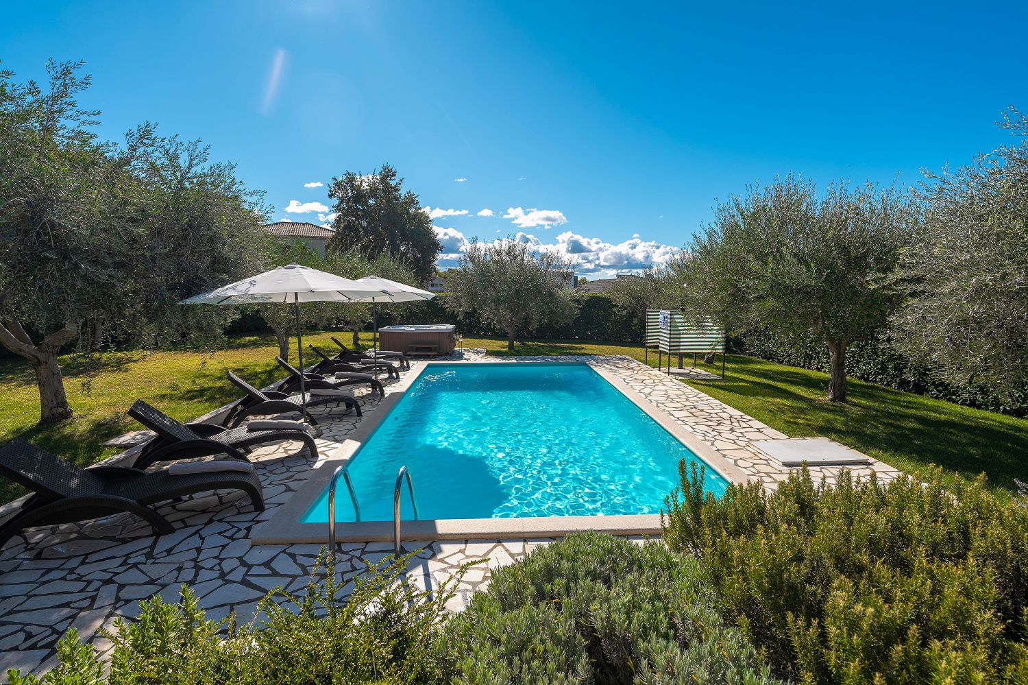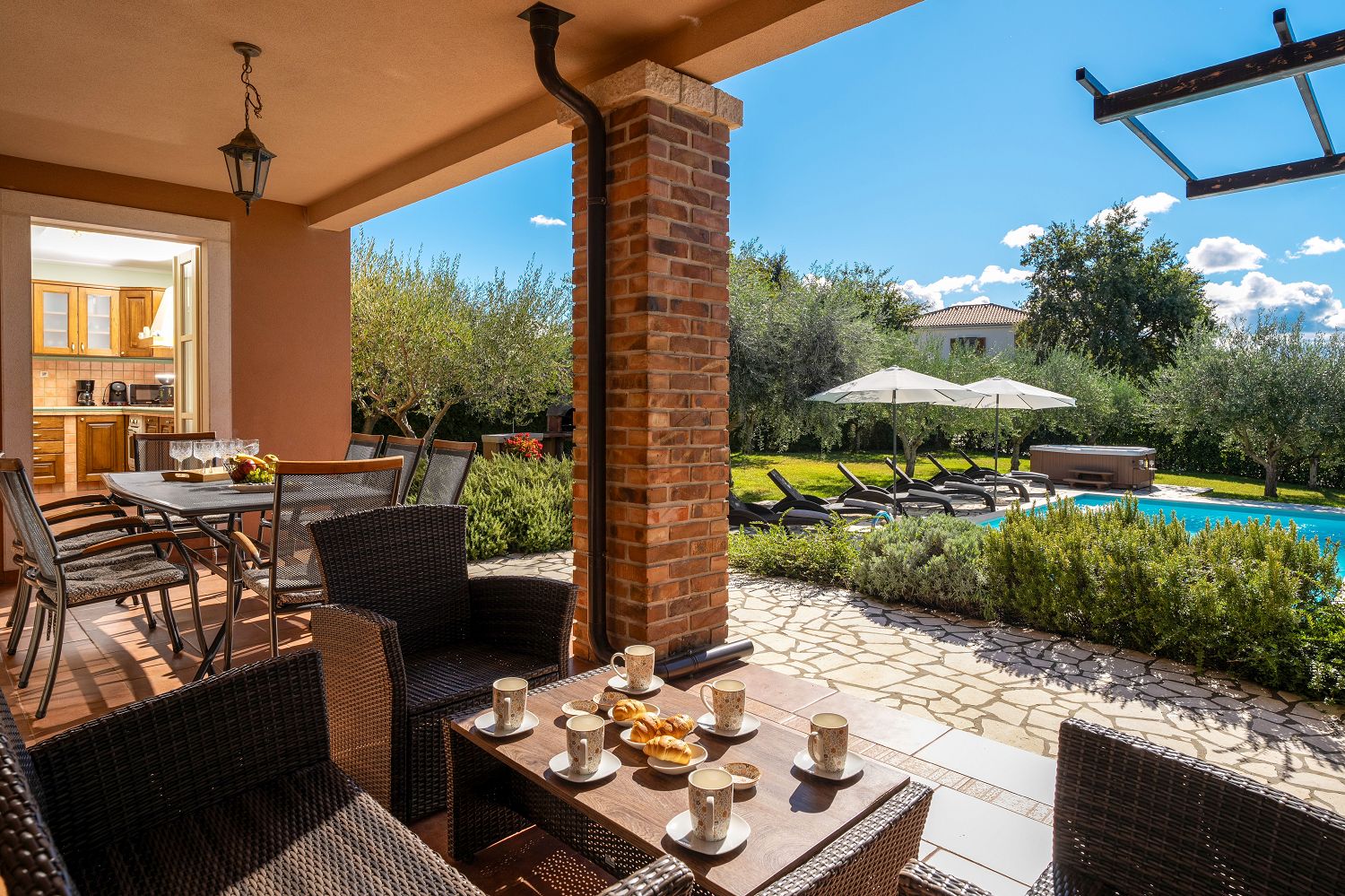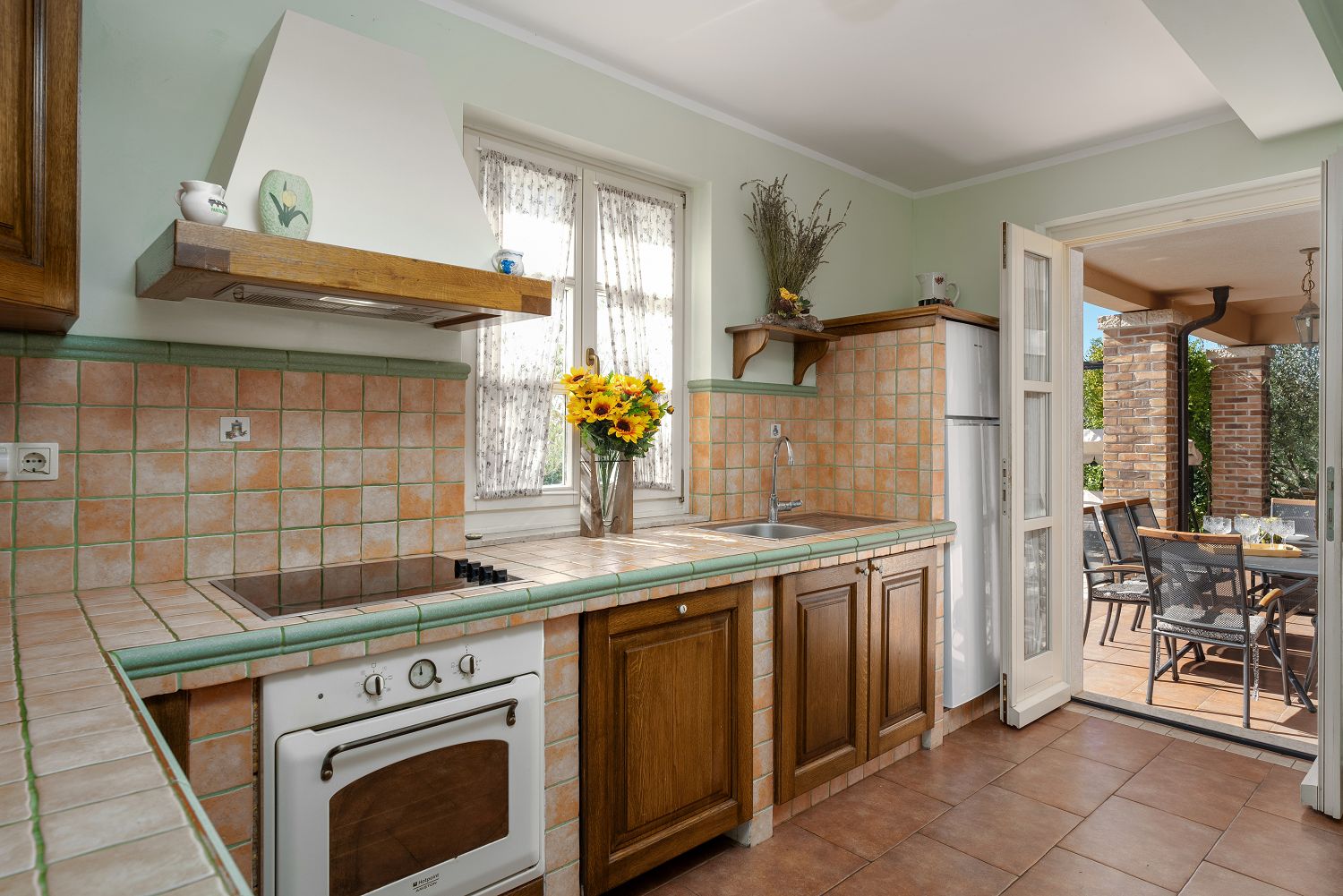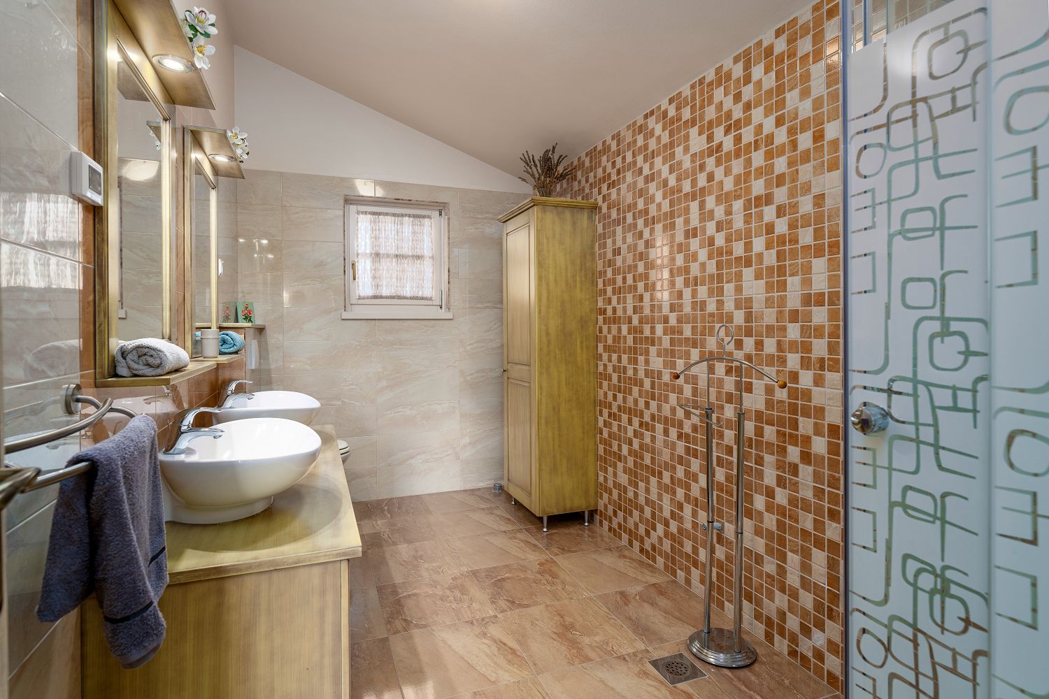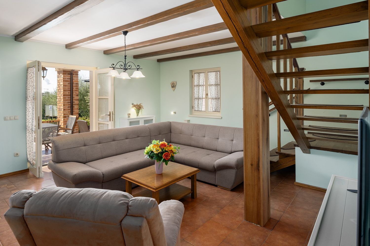 Diese Casa ist ein wunderschönes, im Jahr 2015 erbautes Ferienhaus im ländlichen Stil. Es befindet sich im Ort Kastelir, nur 8 km vom Meer und 350 m vom Stadtzentrum entfernt. In der Nähe gibt es ein Geschäft, ein Restaurant, eine Pizzeria, einen Geldautomaten und weitere Annehmlichkeiten. Das Haus verfügt über einen eigenen, teilweise eingezäunten, gepflegten Garten mit einer Fläche von ca. 1.000 m², einen Swimmingpool und einen Jacuzzi. Es ist von einem Olivenhain umgeben und bietet einen Grill sowie einen Parkplatz für zwei Fahrzeuge. Das für acht Personen ausgelegte Ferienhaus erstreckt sich über zwei Etagen und bietet auf 164 m² folgende Ausstattung: Im Erdgeschoss befinden sich eine voll ausgestattete Küche mit Esszimmer, ein Wohnzimmer mit Zugang zur schönen überdachten Terrasse mit Esstisch, ein Schlafzimmer mit zwei getrennten Betten und Dusche/WC sowie eine separate Toilette. Im ersten Stock befinden sich ein geräumiges Doppelzimmer mit Zugang zu einem Balkon mit herrlichem Panoramablick auf das Meer, ein Badezimmer mit Dusche und Massagewanne, ein kleineres Zimmer mit einem Bett für eine Person sowie ein Dreibettzimmer mit eigenem Bad mit Dusche und WC. Jugendgruppen sind nicht zugelassen.
