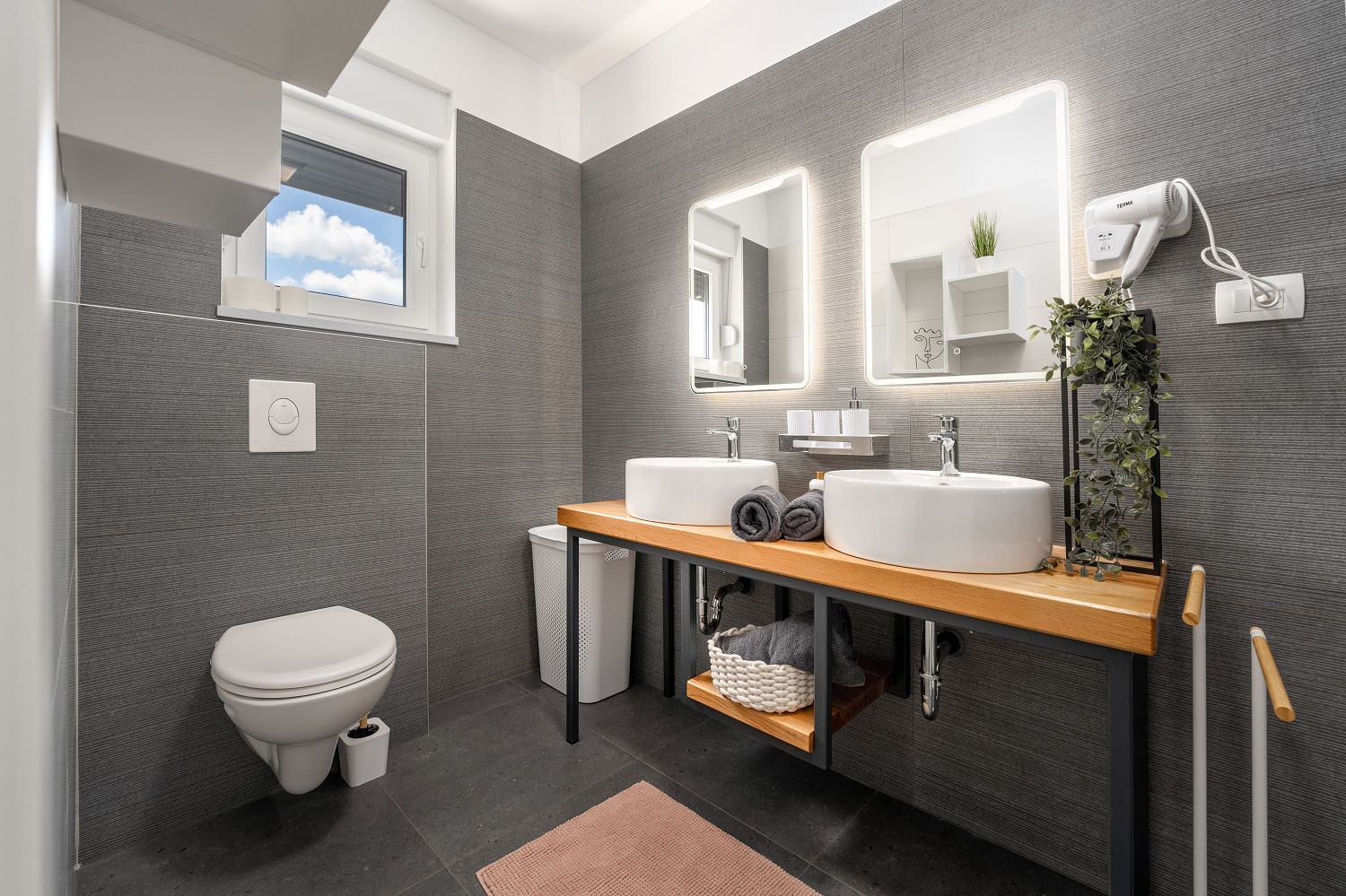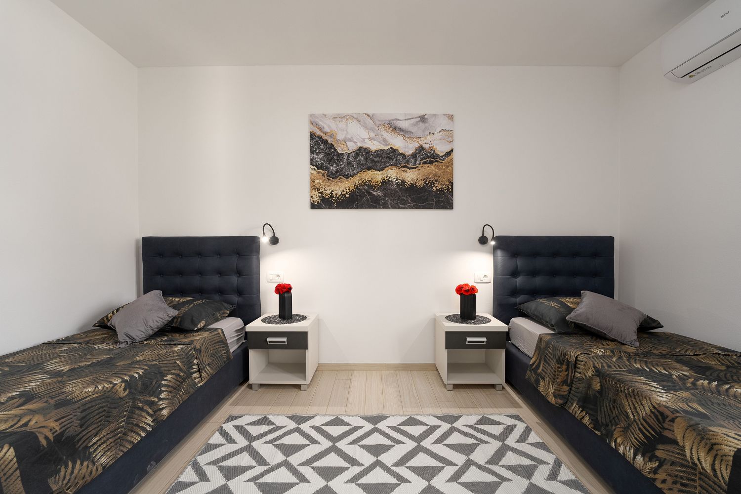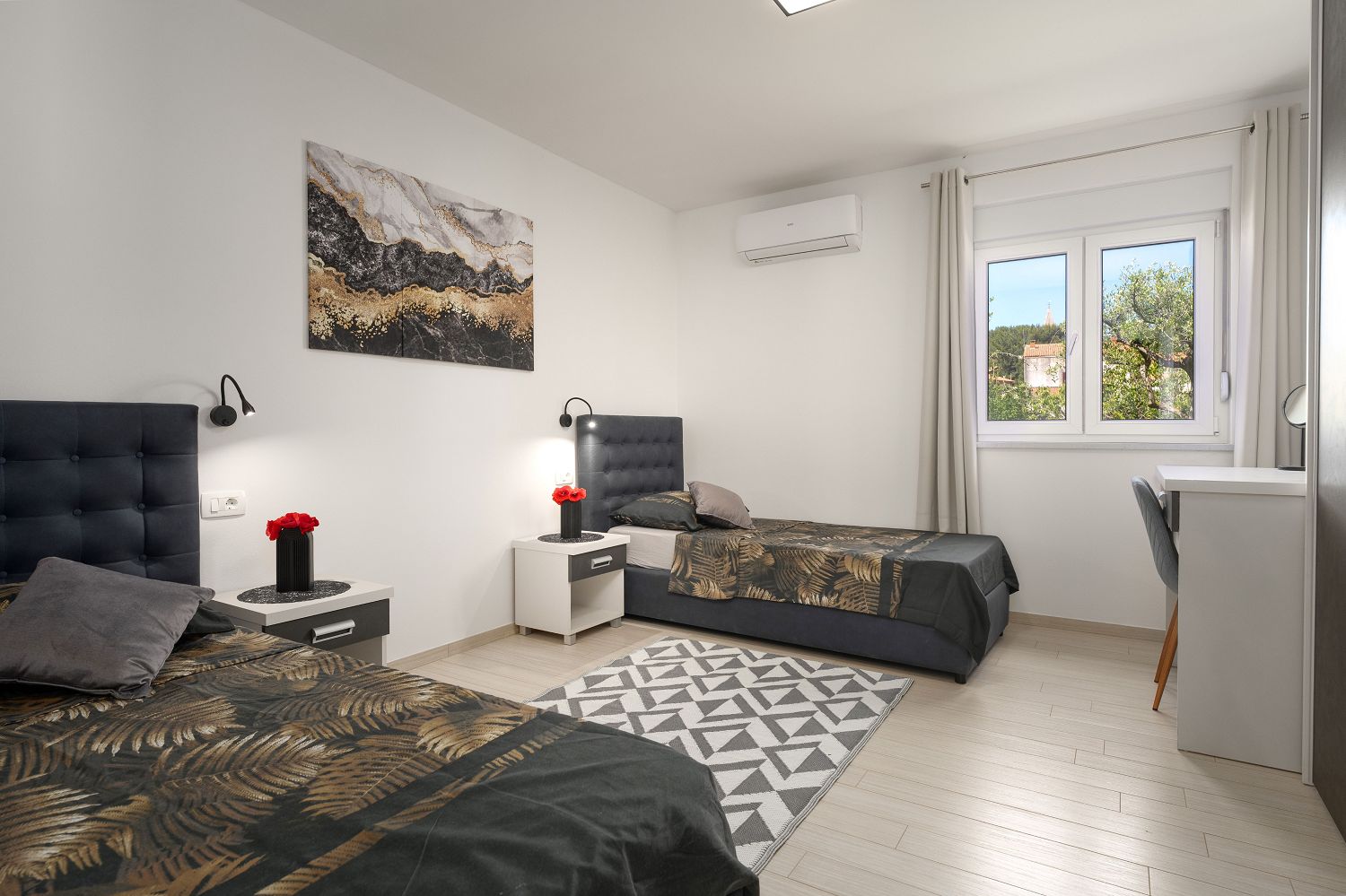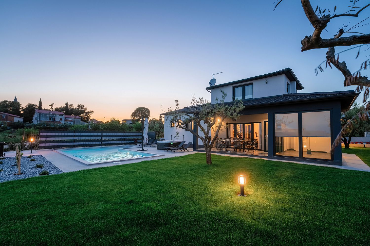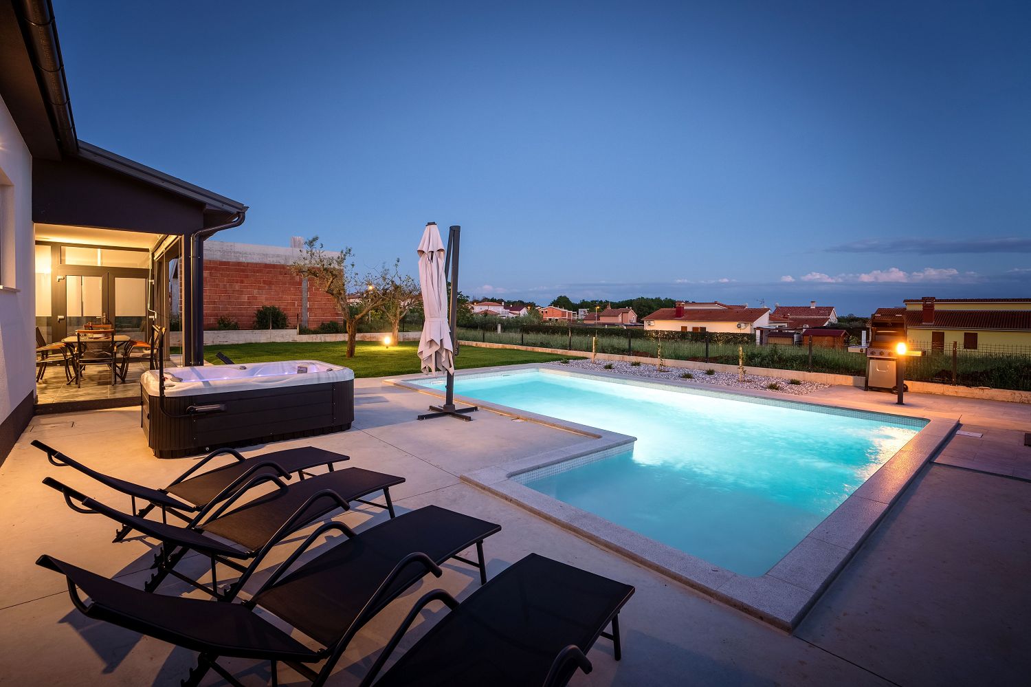 Die Villa ist ein neugebautes Ferienhaus in Kastelir, das ca. 12 km von Porec und 8 km vom Meer entfernt liegt. In der Nähe befinden sich ein Geschäft, ein Restaurant, eine Pizzeria, ein Geldautomat und weitere Einrichtungen. Das Haus steht auf einem 950 m² großen, eingezäunten Grundstück mit angelegtem Rasen und Olivenbäumen. Das 2023 erbaute Haus bietet einen wunderschönen Panoramablick auf das Meer und die Umgebung. Im Außenbereich stehen den Gästen ein Pool mit Sonnenliegen, ein Jacuzzi, eine Sauna, eine separate Toilette, eine überdachte Terrasse mit Gartenmöbeln und Grill sowie zwei Parkplätze zur Verfügung. Das neue Ferienhaus für 6–7 Personen verfügt über 160 m² Wohnfläche auf zwei voll klimatisierten Etagen und ist mit modernen Möbeln ausgestattet. Im Erdgeschoss befindet sich der Wohnbereich mit einer voll ausgestatteten Küche, einem Esstisch und einem Wohnzimmer mit Zugang zur überdachten Terrasse und zum Garten. Außerdem gibt es ein Doppelzimmer mit Dusche/WC und ein Schlafzimmer mit getrennten Betten und eigener Dusche/WC. Im Obergeschoss befindet sich ein geräumiges Doppelzimmer mit wunderschönem Panoramameerblick und ein Badezimmer mit Dusche/WC.