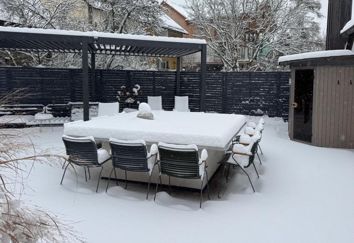 Pergola mit Lounge-Möbeln vom dänischen Designhaus Houe