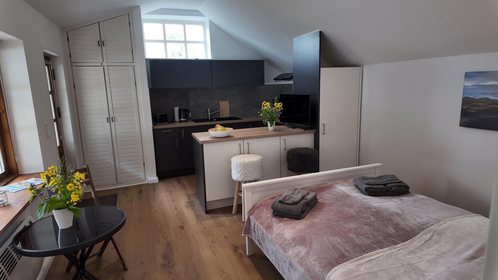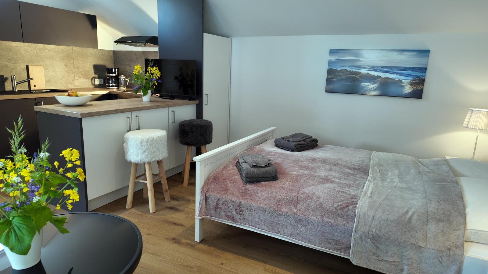 Das Kastanien-Cottage ist eine 1-Zimmer-Kombination aus Küchenzeile und Schlafraum sowie einem Bad mit Dusche und einer gemütlichenTerrasse. Ganz nach dem Motto "Klein aber fein" bietet das Cottage alles, was es für eine kleine oder auch größere Auszeit zu zweit braucht.