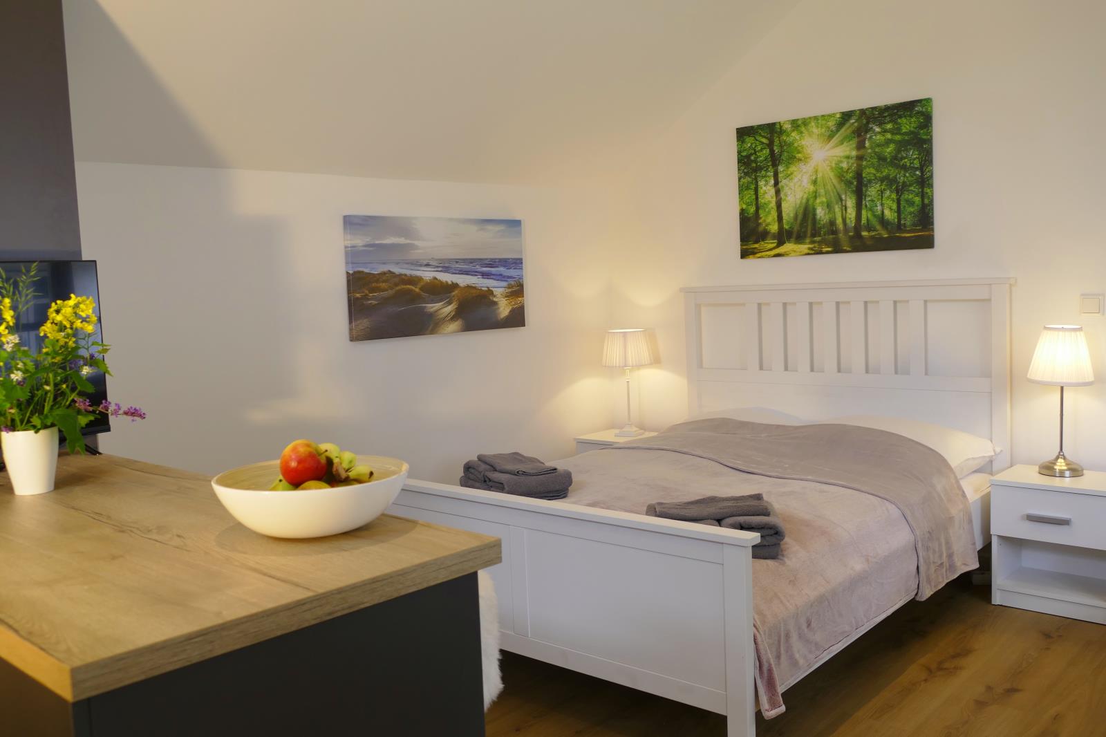 Die Küchenzeile ist mit allem ausgestattet, was zum Zubereiten Ihrer Mahlzeiten benötigt wird. Genießen Sie diese gleich direkt auf den gemütlichen Tresenstühlen der offenen Küche oder bei wärmeren Temperaturen auf der Terrasse direkt rechts vor dem Cottage. Der Küchenttresen teilt die Küche vom Rest des Wohnraumes, wo das große Doppelbett seinen Platz hat. Gleich nach dem Schlafplatz folgt eine Tür zum Bad mit einer Dusche, Waschbecken und WC.