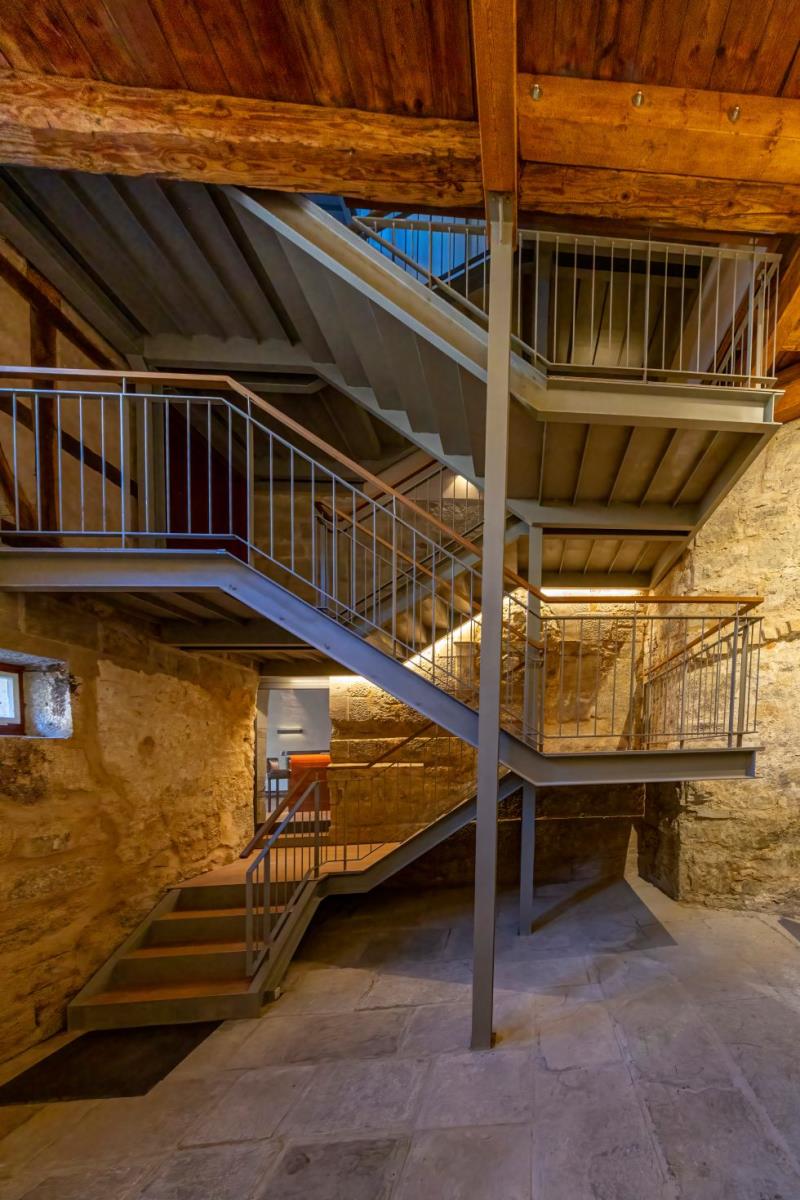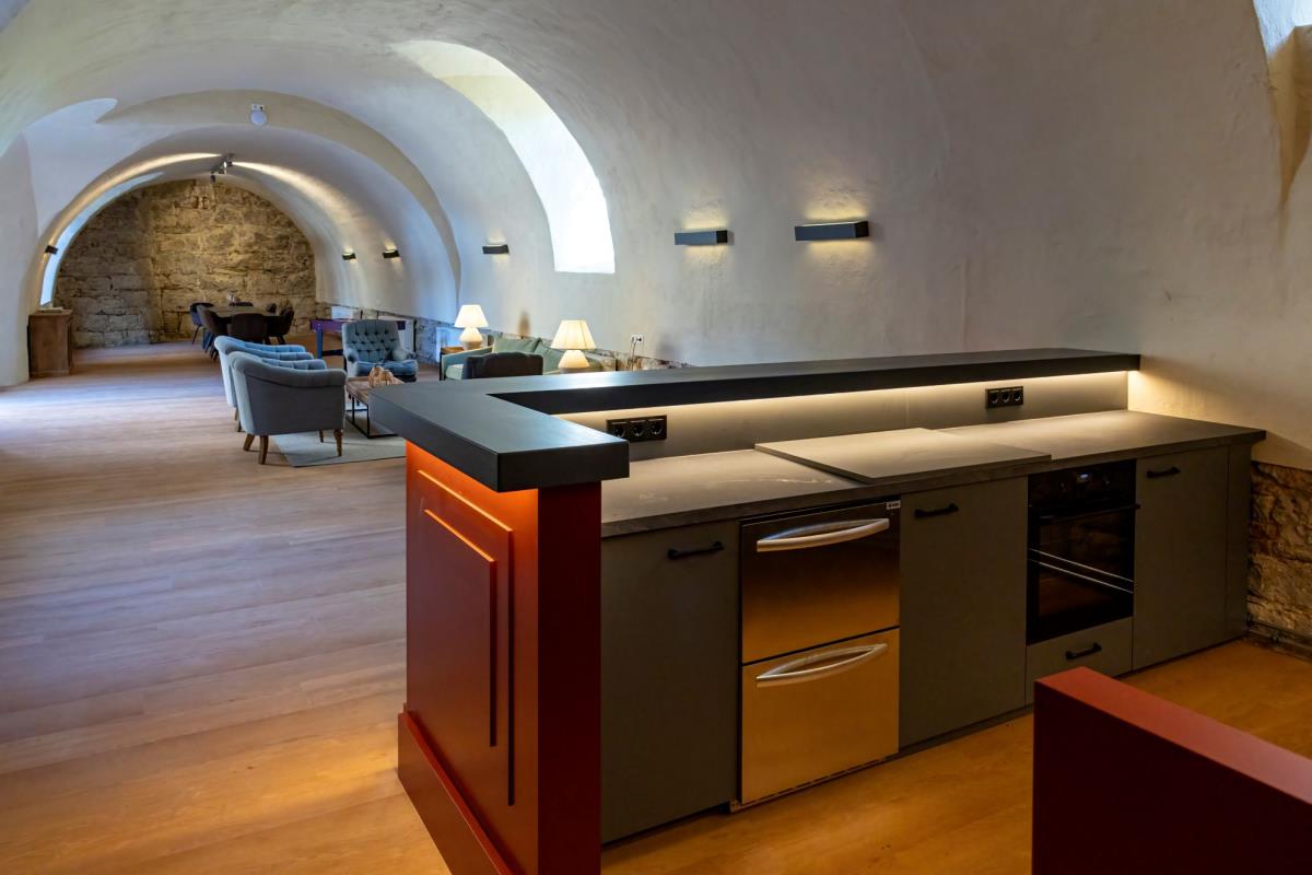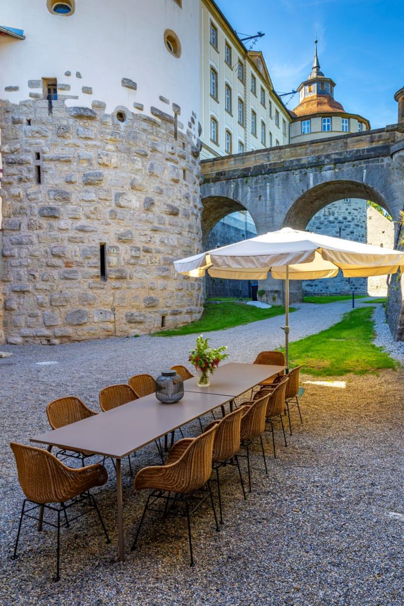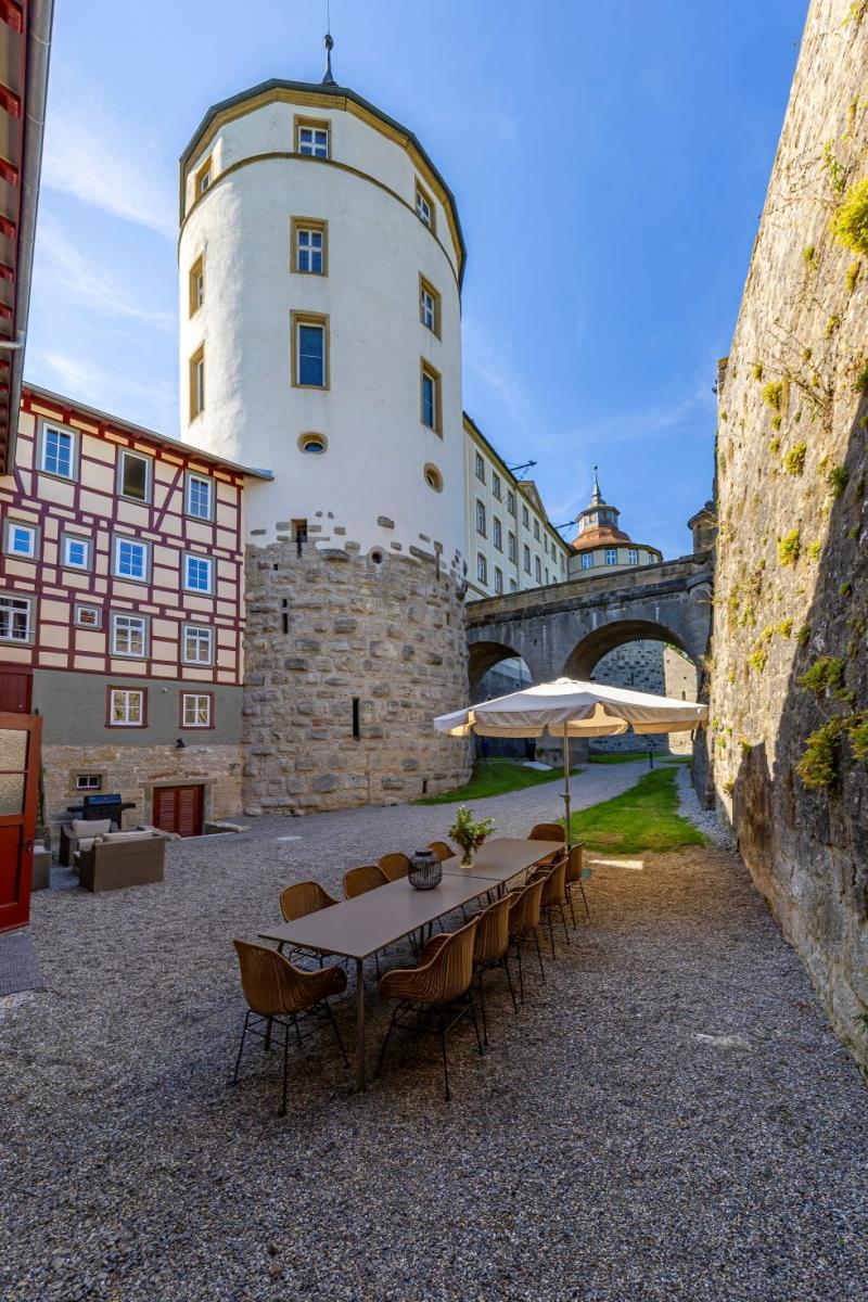 Von der Lounge aus öffnen sich die Türen zum Outdoor-Bereich im Schlossgraben: ein privates Refugium mit großem Esstisch, Grill, Outdoor-Lounge und Platz für Kinder zum Spielen. Während Sie ein Glas Wein genießen, fällt Ihr Blick immer wieder hinauf zum Schloss – ein Bild, das man nicht vergisst.