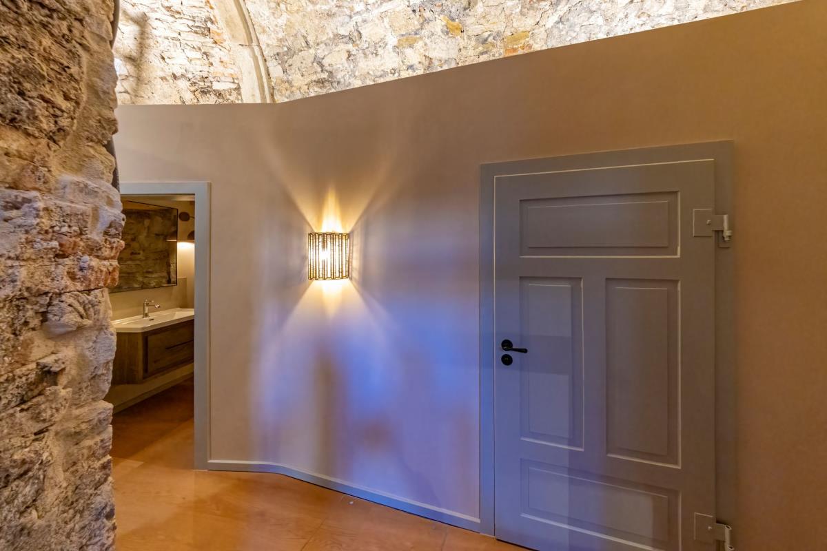 ein offenes Entrée, von stimmungsvoll beleuchteten Mauern umrahmt