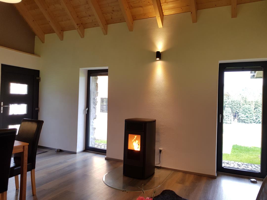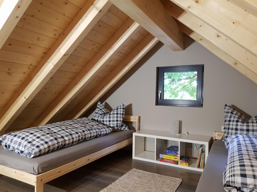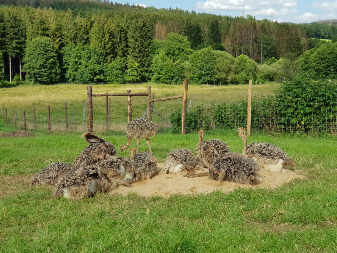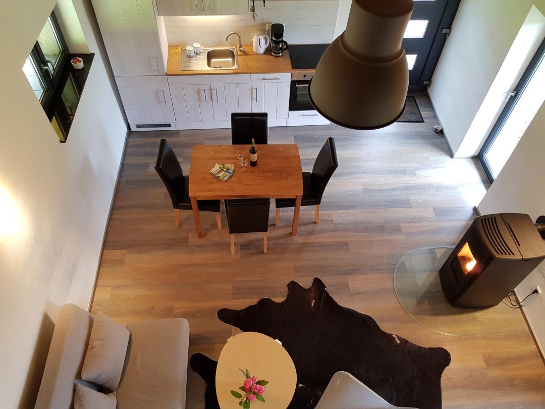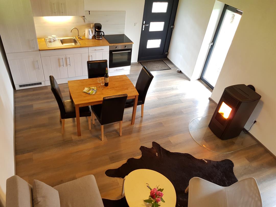 Endlich Urlaub! Im Jahr 2021 ist unser Ferienhaus nach Fertigstellung bereit für die Vermietung. Freuen Sie sich auf einen schönen Aufenthalt im zeitgemäß gestalteten Ferienhaus Hohensayn auf unserem Straussenhof. Das modern eingerichtete Ferienhaus bietet auf ca. 55 qm Wohnfläche inkl. Empore Platz für bis zu 4 Personen. Lassen Sie den Abend auf Ihrer überdachten Terrasse ausklingen. Ein PKW-Stellplatz steht natürlich zur Verfügung, E-bikes und Räder können Sie bei uns sicher unterstellen. Während der Sommermonate ist an schönen Wochenenden unser Hofcafe für Wanderer und Radfahrer geöffnet. Während der Öffnungszeiten werden zusätzliche Gäste unseren Hof besuchen. Das Ferienhaus verfügt über einen separaten Gartenanteil. Im Erdgeschoss finden Sie eine moderne Küche mit Backofen, Kühlschrank und Gefriermöglichkeit, Kaffeemaschine und Wasserkocher etc. Der Wohn-Essbereich ist mit einer Essgruppe, einer Wohn-Couch, einem Flachbild-TV - schwenkbar für Wohn-und Schlafbereich - und Pellet-Ofen ausgestattet. Im Schlafbereich im EG finden Sie ein Doppelbett (160x200cm). Das Badezimmer im EG ist mit Regendusche, Haartrockner und WC ausgestattet. Im Obergeschoss/Empore verfügt unsere FeWo über ein weiteres Schlafzimmer mit zwei Einzelbetten (Deckenhöhe max. 175 cm). Haustiere sind leider nicht erlaubt. Buchen Sie gerne ein Wäschepaket für 7 Euro pro Person dazu. Wir wünschen Ihnen einen schönen Aufenthalt in unserem geschmackvollen Ferienhaus.
