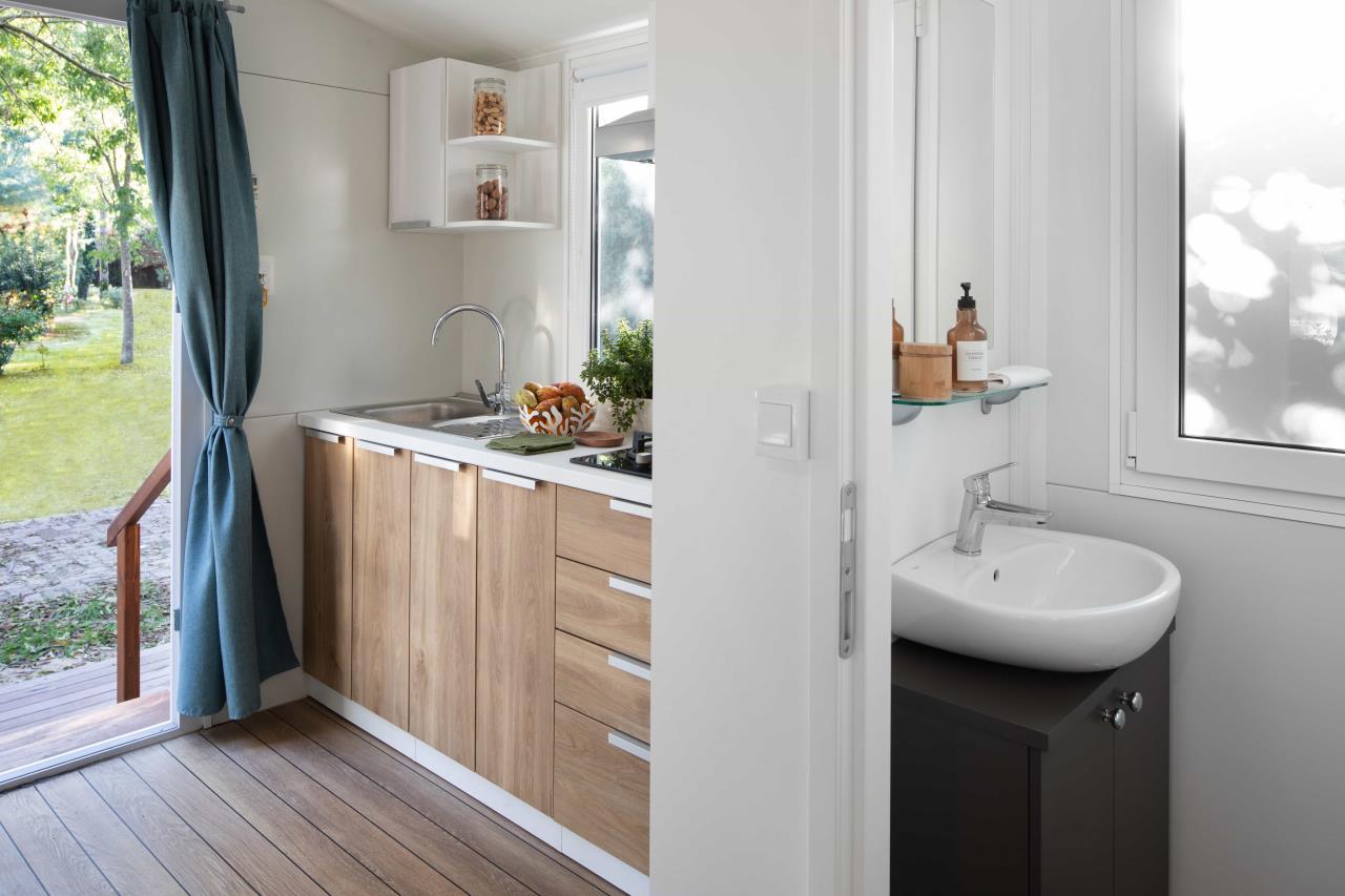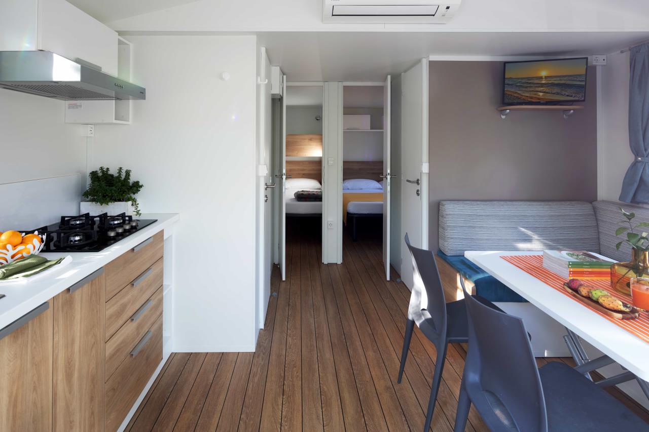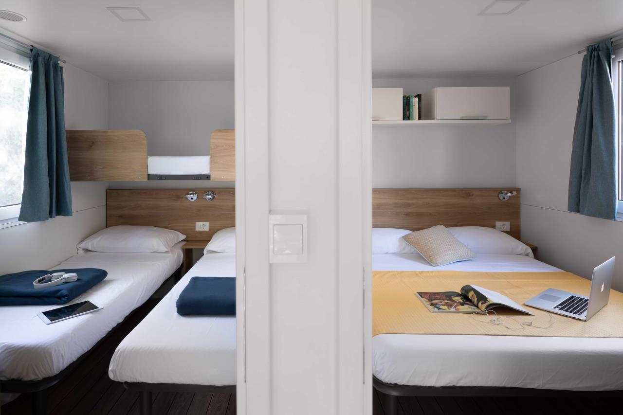 Die Unterkunft für max. 6 Personen (wovon 2 Personen bis max. 12 Jahre) besteht aus einem Elternschlafzimmer mit Doppelbett, sowie einem Schlafzimmer mit zwei Einzelbetten und einem Hochbett (Hochbett für Kinder bis ca. 12 Jahre geeignet; 177x60). Im Wohnbereich hat es ein Bettsofa welches einem Kind Platz bietet (132x87). Die gut eingerichtete Küche befindet sich im Wohnbereich und verfügt über Geschirr, Besteck, Pfannen, Mikrowelle und Kühlschrank mit Eisfach. TV und Safe vorhanden. Das Badezimmer verfügt über eine Dusche sowie ein Waschbecken. Ein WC mit Waschbecken ist separat. Der Sitzplatz mit Tisch und Stühlen lädt zum gemütlichen Entspannen ein, während die Kinder sich auf dem Spielplatz oder am Pool austoben können.Grillen erlaubt. Fahrzeit ab ital. Grenze ca. 4h. Hinweis Wenn Sie mehr als eine Unterkunft benötigen, ist dies bei uns in der Regel möglich, da wir über mehrere Objekte des gleichen Haustyps verfügen.