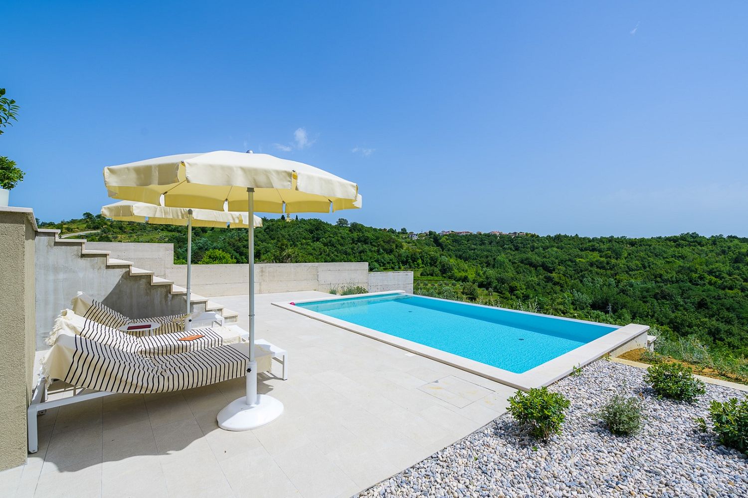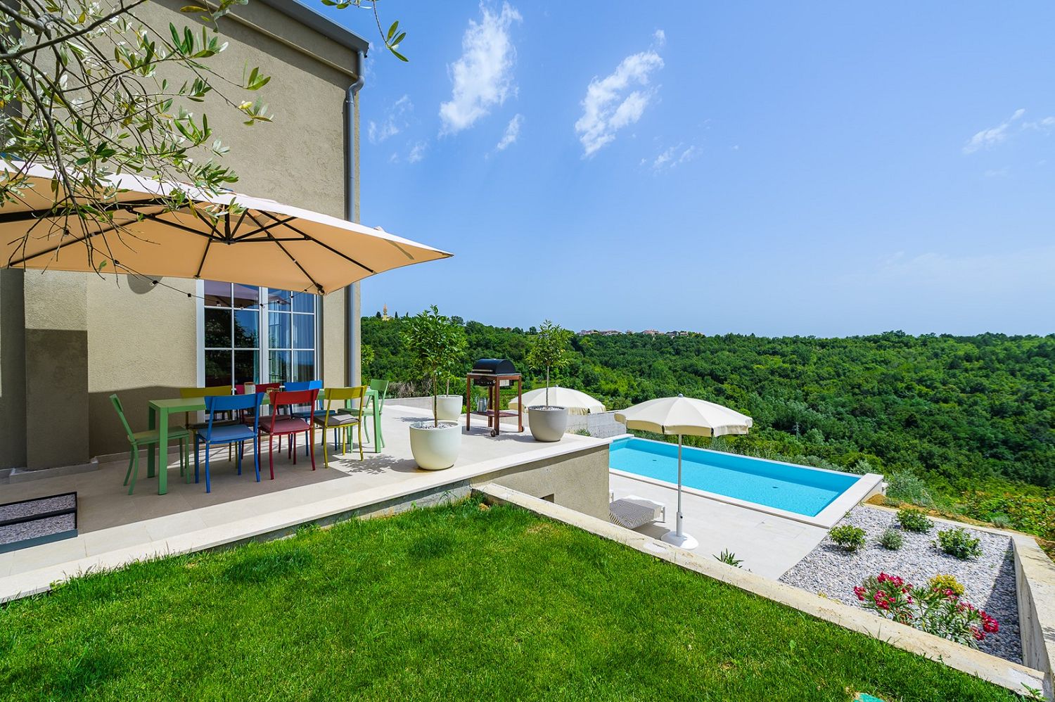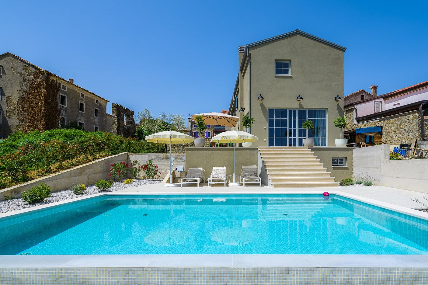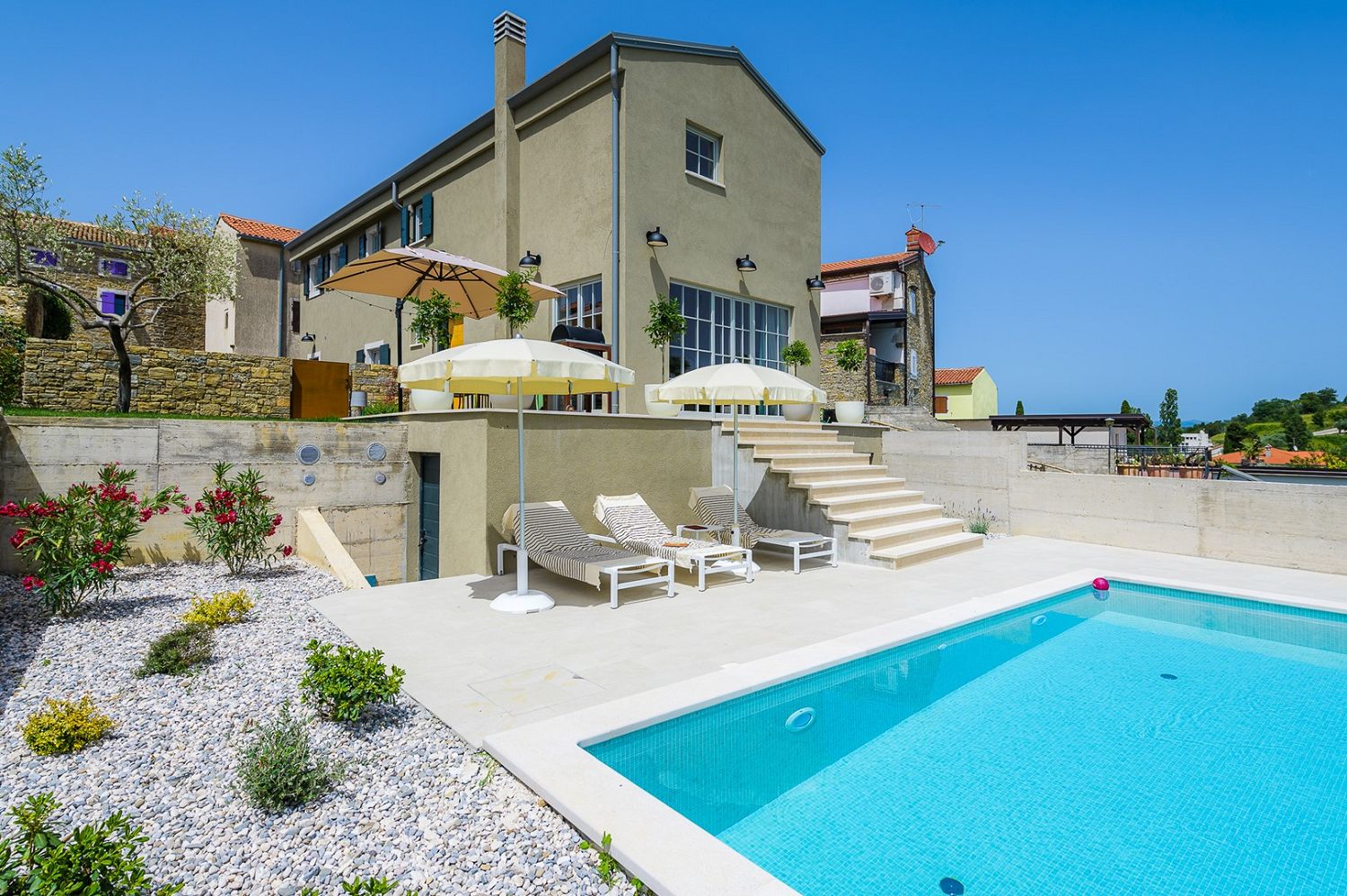 Die Villa verfügt im ersten Stock über zwei komfortable Schlafzimmer und ein Badezimmer. Eines der Schlafzimmer ist mit einem Kingsize-Bett, das andere mit zwei Einzelbetten ausgestattet. Letztere können bei Bedarf leicht zu einem Doppelbett zusammengestellt werden. Im Erdgeschoss befindet sich ein großzügiger, offener Raum mit Küche, Essbereich und Wohnzimmer. Große Glastüren führen direkt auf die Terrasse und in den Garten mit Pool, von wo aus sich ein atemberaubender Blick auf die grünen istrischen Hügel bietet. Zur Ausstattung der Villa gehören ein privater Parkplatz für ein Auto, ein beheizter Pool mit Sonnenterrasse, Liegestühlen und Sonnenschirmen sowie ein eingezäunter Garten. In der Villa sind Ihre vierbeinigen Freunde herzlich willkommen. Für Haustiere wird ein Aufpreis berechnet. Wenn Sie einen Ort suchen, von dem aus Sie unsere Halbinsel entdecken und einen wunderbaren Urlaub verbringen können, dann haben Sie ihn hier gefunden.