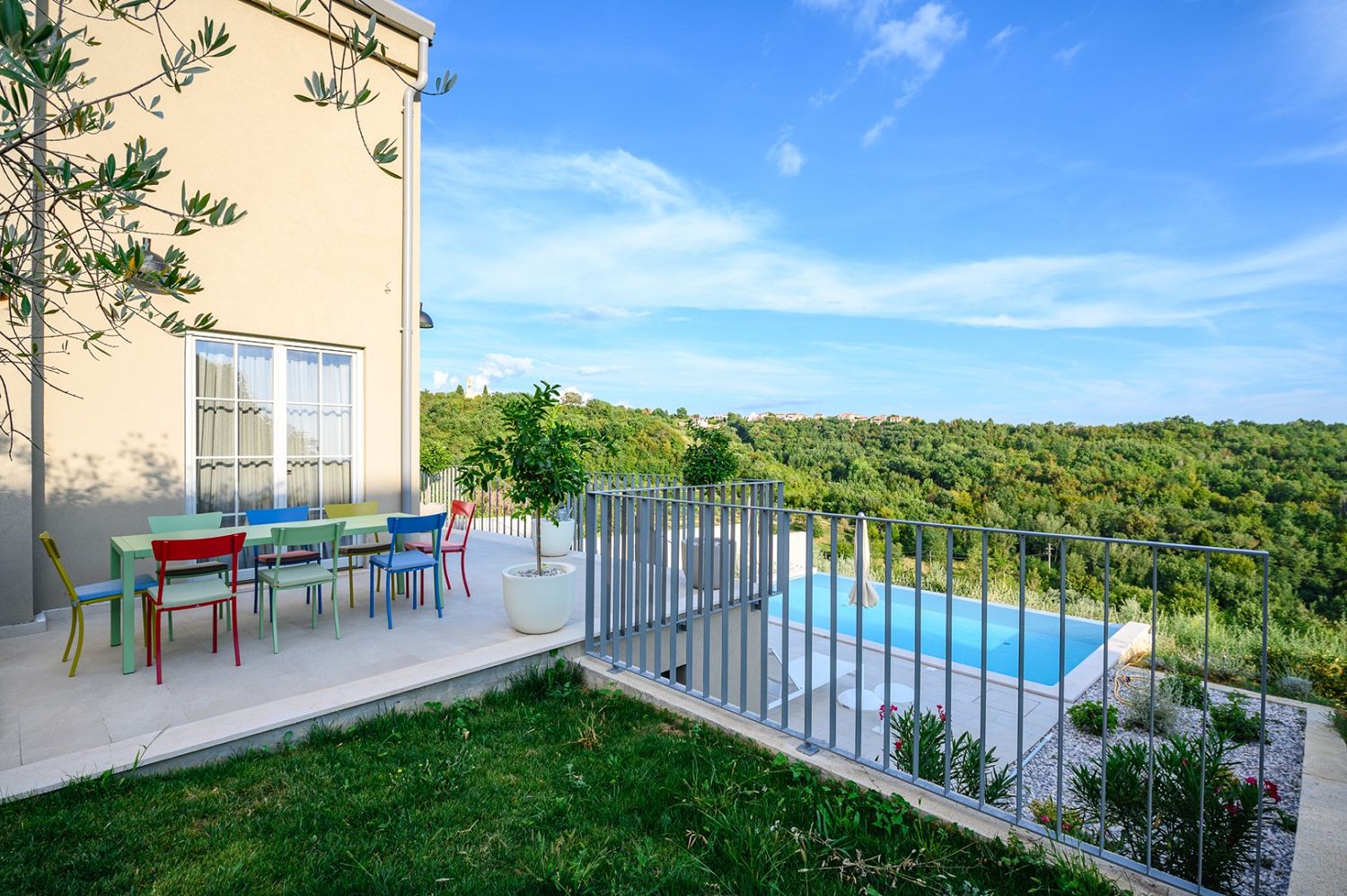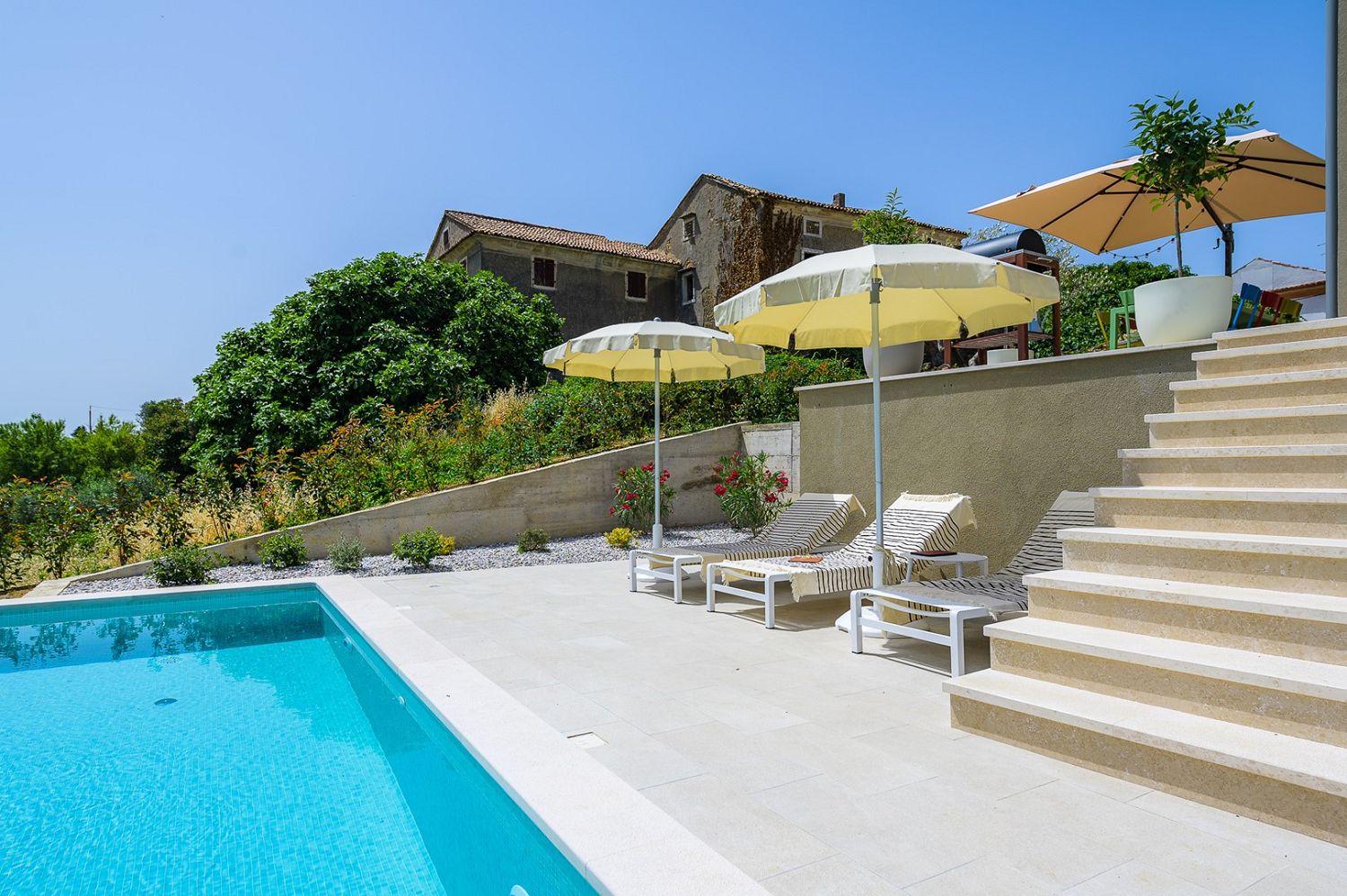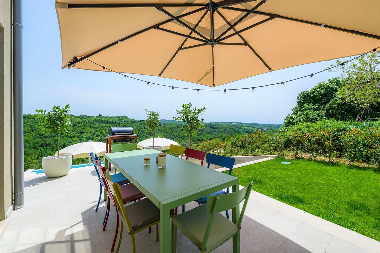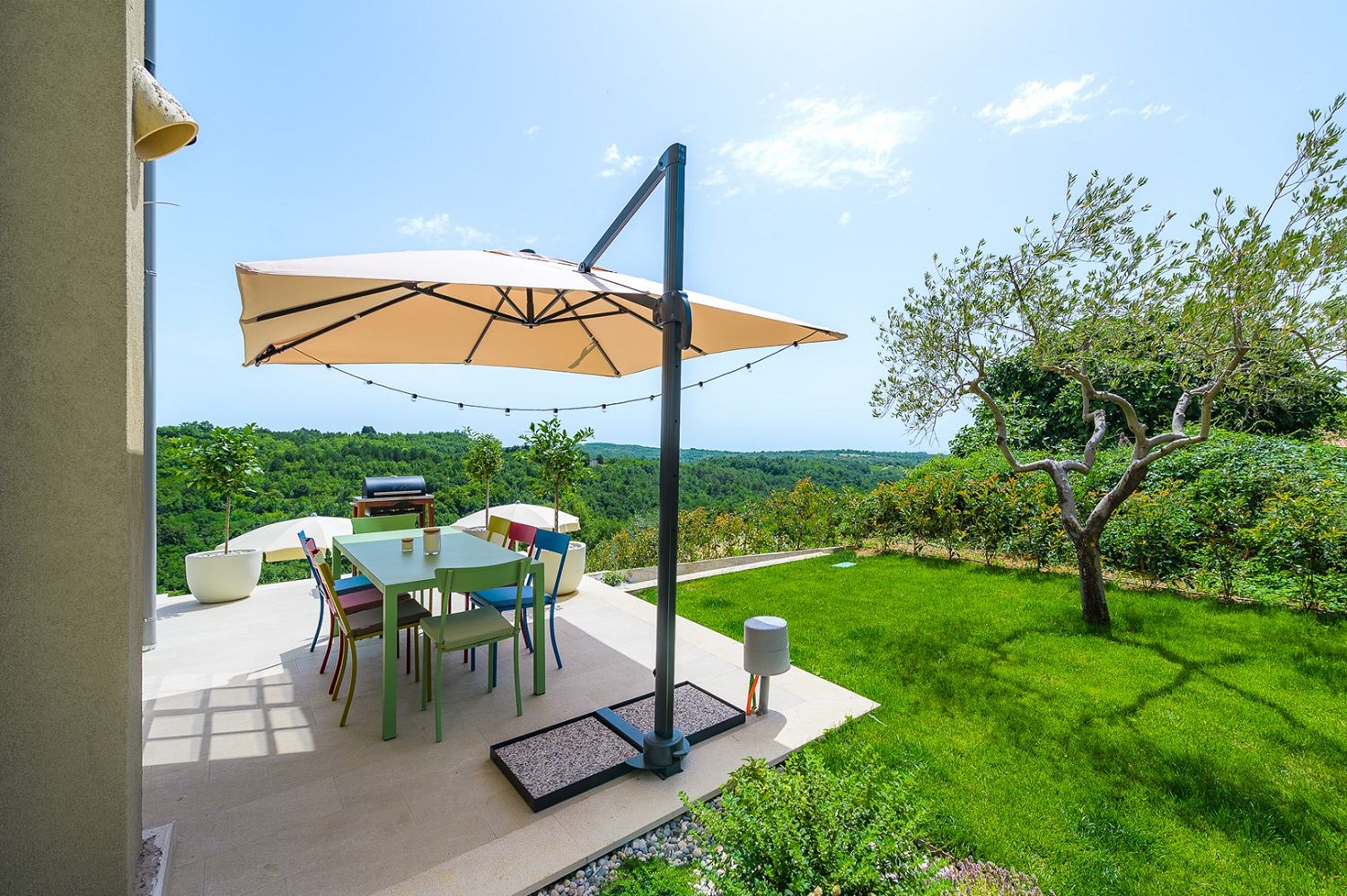 Die Villa verfügt im ersten Stock über zwei komfortable Schlafzimmer und ein Badezimmer. Eines der Schlafzimmer ist mit einem Kingsize-Bett, das andere mit zwei Einzelbetten ausgestattet. Letztere können bei Bedarf leicht zu einem Doppelbett zusammengestellt werden. Im Erdgeschoss befindet sich ein großzügiger, offener Raum mit Küche, Essbereich und Wohnzimmer. Große Glastüren führen direkt auf die Terrasse und in den Garten mit Pool, von wo aus sich ein atemberaubender Blick auf die grünen istrischen Hügel bietet. Zur Ausstattung der Villa gehören ein privater Parkplatz für ein Auto, ein beheizter Pool mit Sonnenterrasse, Liegestühlen und Sonnenschirmen sowie ein eingezäunter Garten. In der Villa sind Ihre vierbeinigen Freunde herzlich willkommen. Für Haustiere wird ein Aufpreis berechnet. Wenn Sie einen Ort suchen, von dem aus Sie unsere Halbinsel entdecken und einen wunderbaren Urlaub verbringen können, dann haben Sie ihn hier gefunden.