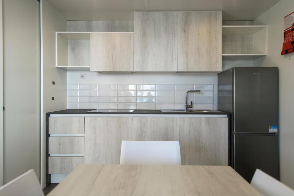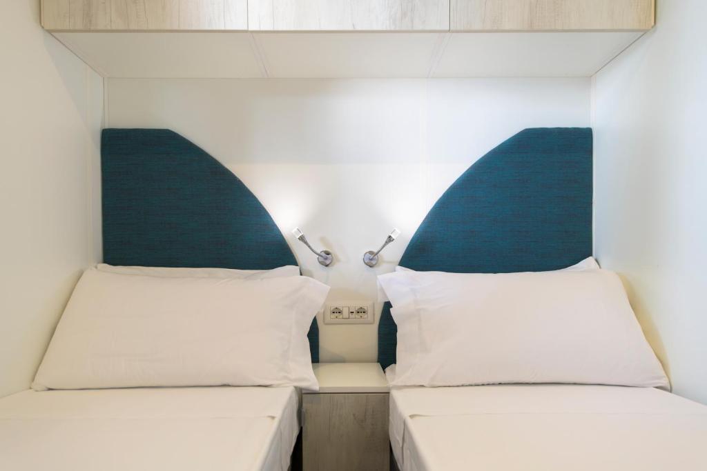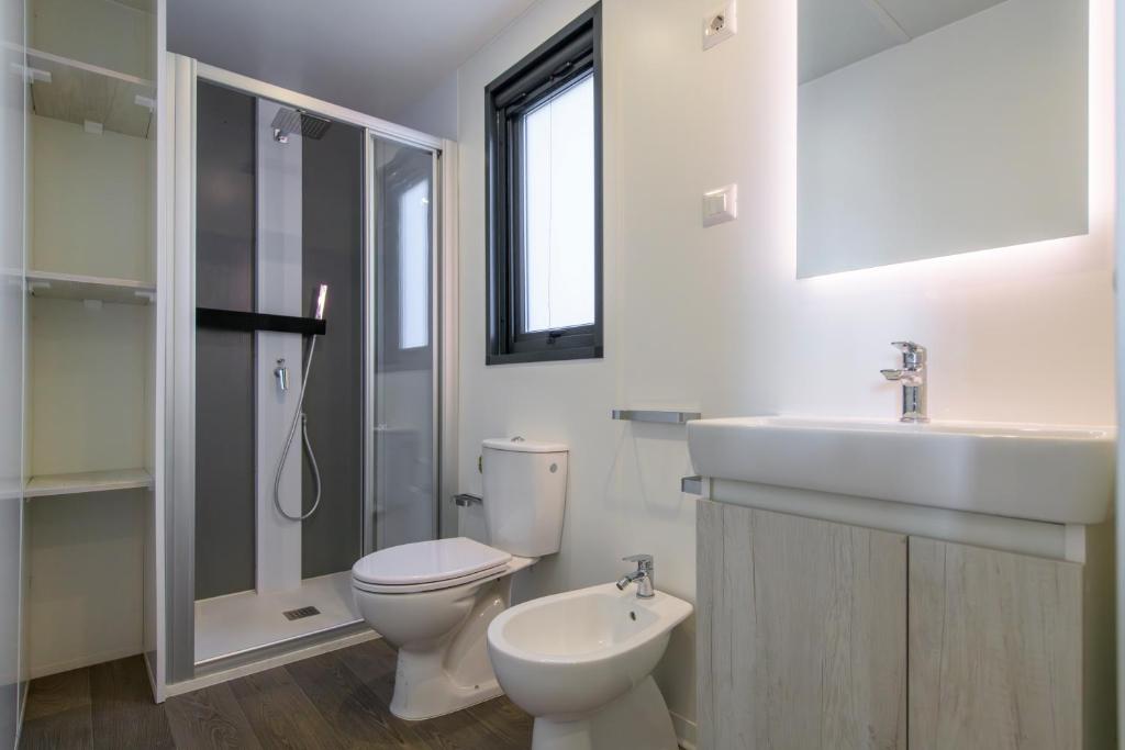 Das Mobilehome Villa Jade bietet Platz für 5 Personen und besteht aus einem Hauptschlafzimmer mit Doppelbett (160cm x 200cm) sowie einem Schlafzimmer mit zwei Einzelbetten (80cm x 200cm). Eine weitere Schlafgelegenheit bietet das Schlafsofa im Wohnzimmer. Die gut eingerichtete Küche befindet sich im Wohnbereich und verfügt über einen Induktionsherd, Geschirr, Besteck und Kochtöpfe sowie Kühlschrank mit Eisfach. Eine Klimaanlage und SAT-TV sind vorhanden. Die beiden Badezimmer verfügen über eine Dusche, Waschbecken und WC; eines ist zusätzlich mit einem Bidet ausgestattet. Die überdachte Holzterrasse mit Tisch, Stühlen und Liegestuhl lädt zum gemütlichen Entspannen ein, während die Kinder sich auf dem Spielplatz oder am Pool austoben können. Grillen ist erlaubt. Fahrzeit ab ital. Grenze ca. 2h. Hinweis: Wenn Sie mehr als eine Unterkunft benötigen, ist dies bei uns in der Regel möglich, da wir über mehrere Objekte des gleichen Haustyps verfügen.