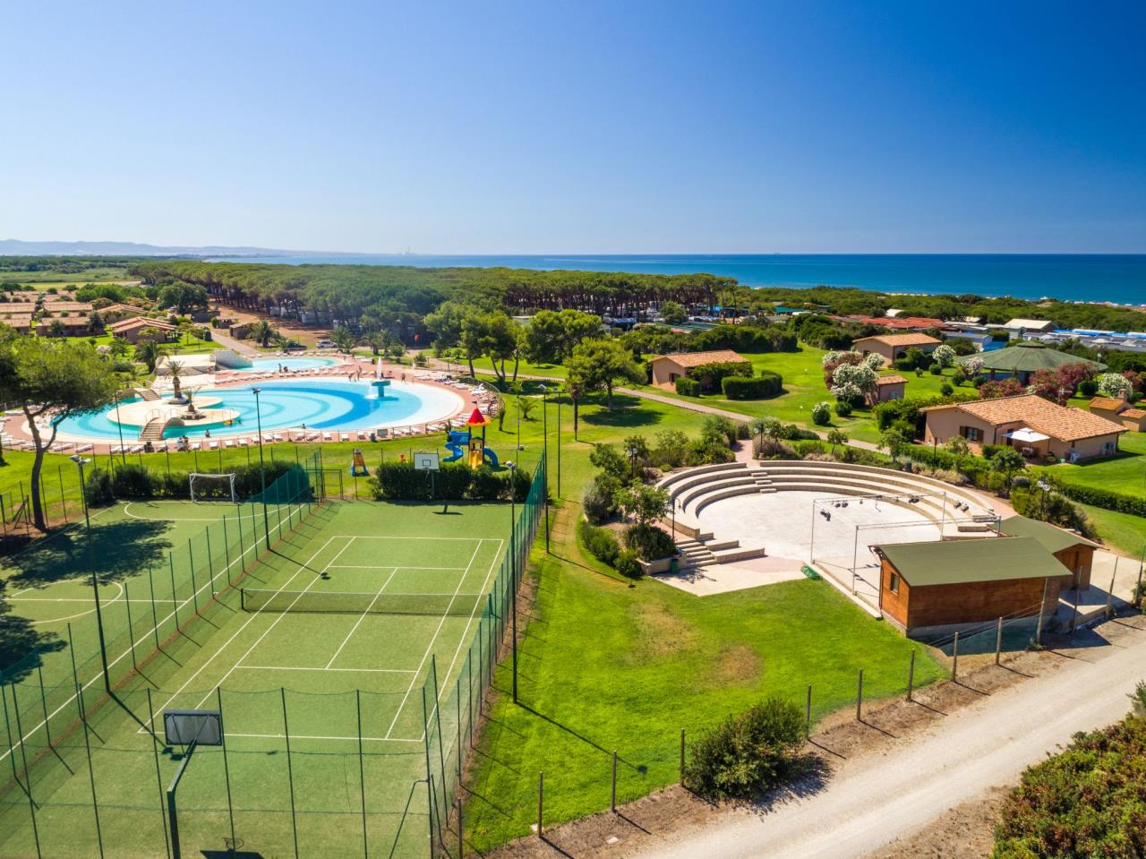 Die Unterkunft befindet sich im Feriendorf California und liegt in der bekannten und beliebten Region Maremma in der Nähe des Ortes Montalto di Marina direkt am Meer. Die Unterkünfte der Anlage sind alle umgeben von viel Grün und harmonieren wunderbar mit der Natur. Die Poolanlage hat einen Strandeffekt, Whirlpoolmassagedüsen, Wasserfälle sowie ein Wasserspiel und Rutschen. Ein Team von erfahrenen Animateuren begleitet Sie während Ihres Aufenthaltes mit einem vielfältigen Unterhaltungsprogramm, sodass unvergessliche Urlaubsmomente mit der Familie garantiert sind! Weiter stehen den Gästen diverse Sportanlagen zur Verfügung: Tennisplätze, Bocciaplätze, Hallenfussball und Bogenschiessen. Der sandige rund 2 Hektar grosse Privatstrand wird laufend gepflegt und ist mit Sonnenschirmen, Strandliegen, Liegestühlen, Tretbooten, Wasserschlitten, Kanus, Beach Volleyfelder und Bar-Self Service-Kiosk ausgestattet. Selbstverständlich gibt es auch einen Spielplatz und einen Miniclub (in der Hochsaison) zum Austoben für die kleinen Gäste. Das Restaurant verwöhnt Sie sowohl mit regionalen als auch mit internationalen und kulinarischen Gerichten.