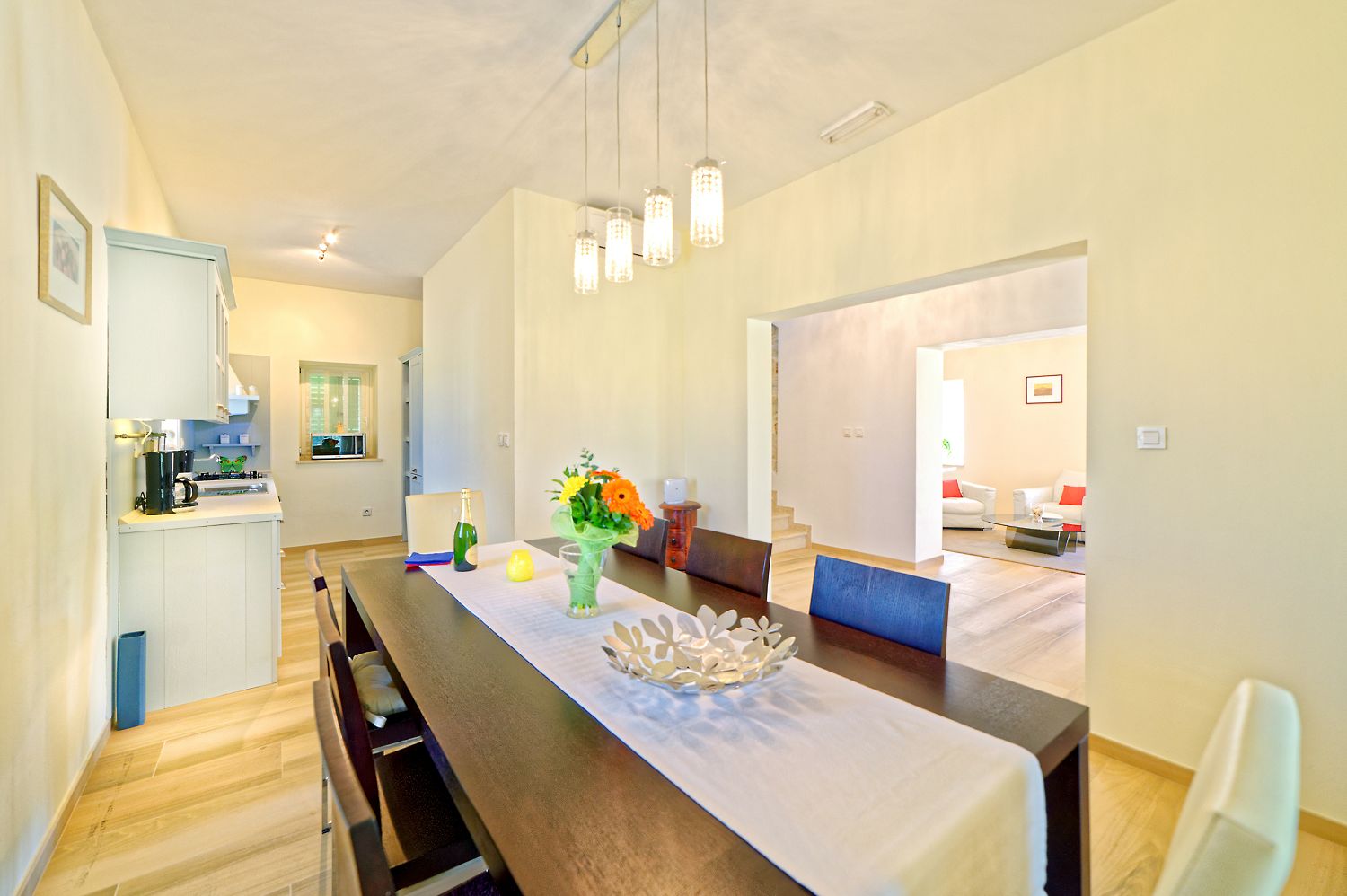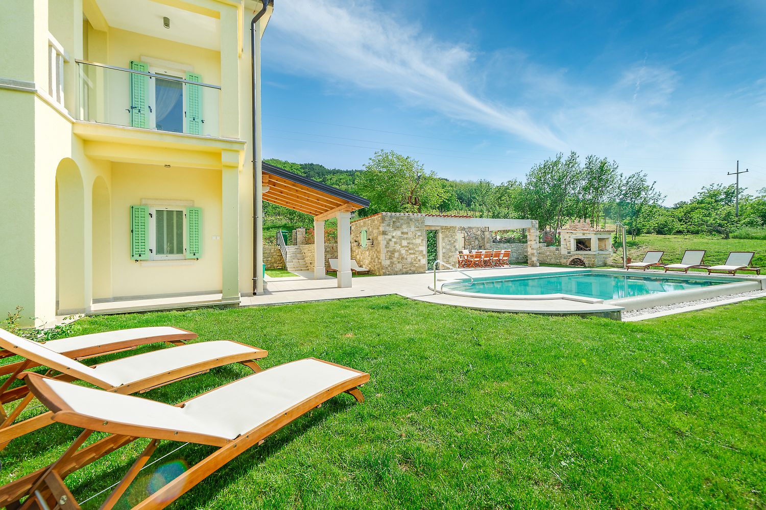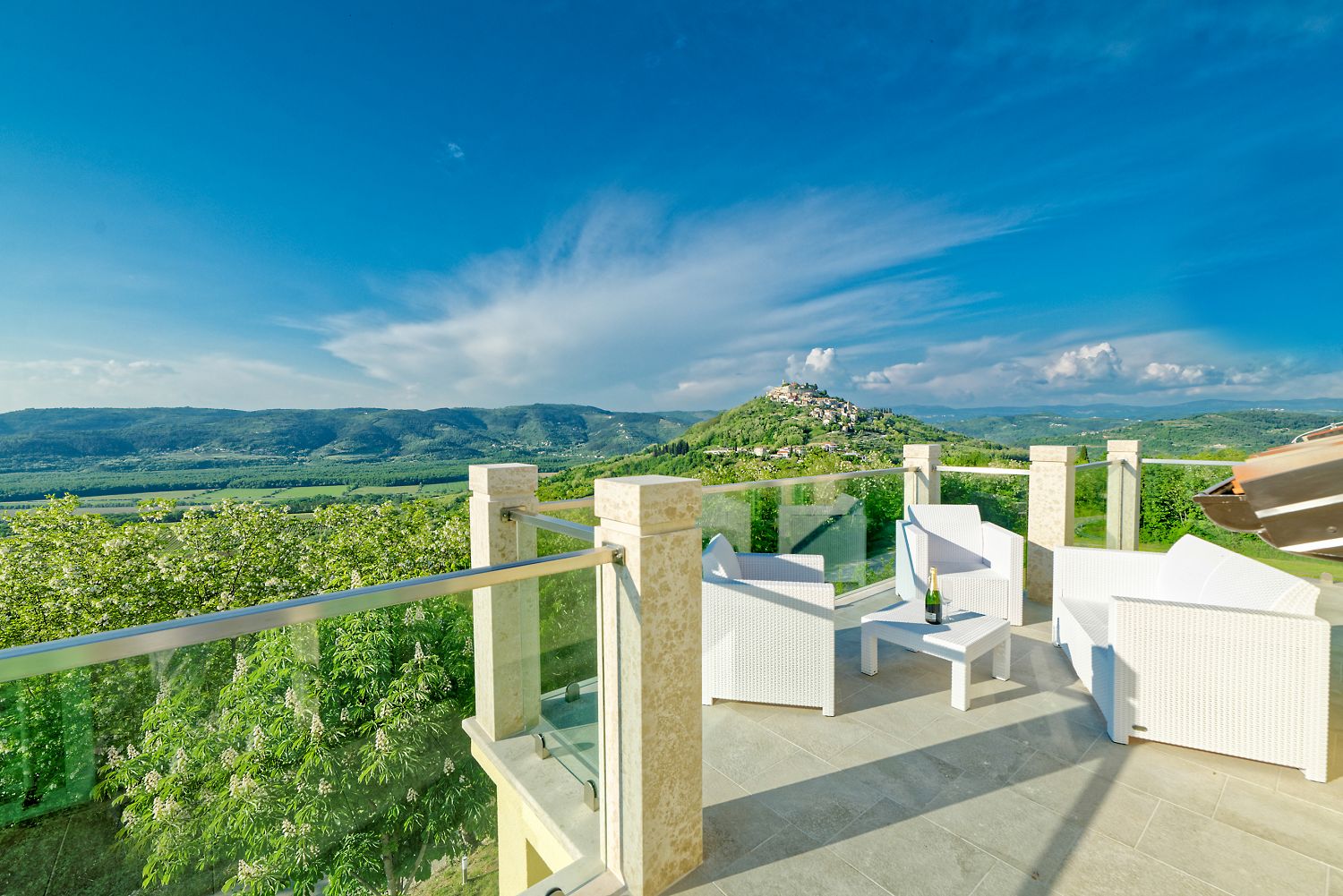 Die Villa steht allein im Grünen, nur einen Kilometer von Motovun entfernt. Von der Villa aus erstreckt sich ein einzigartiger Blick auf Motovun, das malerische Städtchen an der Spitze des Hügels, das auch eines der Symbole Istriens ist. Nur wenige Minuten zu Fuß entfernt befindet sich ein landwirtschaftlicher Betrieb, in dem einfache Gerichte aus biologisch gezüchteten Zutaten serviert werden. Ein Geschäft ist 2 km entfernt, Strände und verschiedene Sport- und Freizeitangebote 25 km. Die Villa bietet auf dem 1000 m² großen Grundstück einen 40 m² großen Infinity-Pool, eine überdachte Terrasse mit Grillkamin und Esstisch, Billard, Tischtennis und mehrere Parkplätze. Der Pool ist außerhalb der Sommersaison beheizt. Die Villa bietet Platz für acht Personen und verfügt über eine Gesamtwohnfläche von 259 m², die sich auf drei Etagen verteilt. Im Erdgeschoss des Hauses befindet sich eine voll ausgestattete Küche mit Esszimmer, ein Wohnzimmer mit Ausgang zum Poolbereich und Garten sowie eine Toilette mit Waschmaschine. Im ersten Stock befinden sich zwei Schlafzimmer mit jeweils einem Doppelbett, einem eigenen Badezimmer und einem Ausgang zur überdachten Terrasse mit Gartenmöbeln und wunderschönem Ausblick. Im zweiten Stock bietet diese Villa noch zwei Schlafzimmer, eines davon mit Doppelbett und Badezimmer, und ein Zweibettzimmer mit Badezimmer. Beide haben Zugang zu einem Balkon mit Gartenmöbeln und wunderschöner Aussicht auf das charmante Motovun und das schöne istrische Binnenland. Die gesamte Villa ist klimatisiert und verfügt über WLAN.