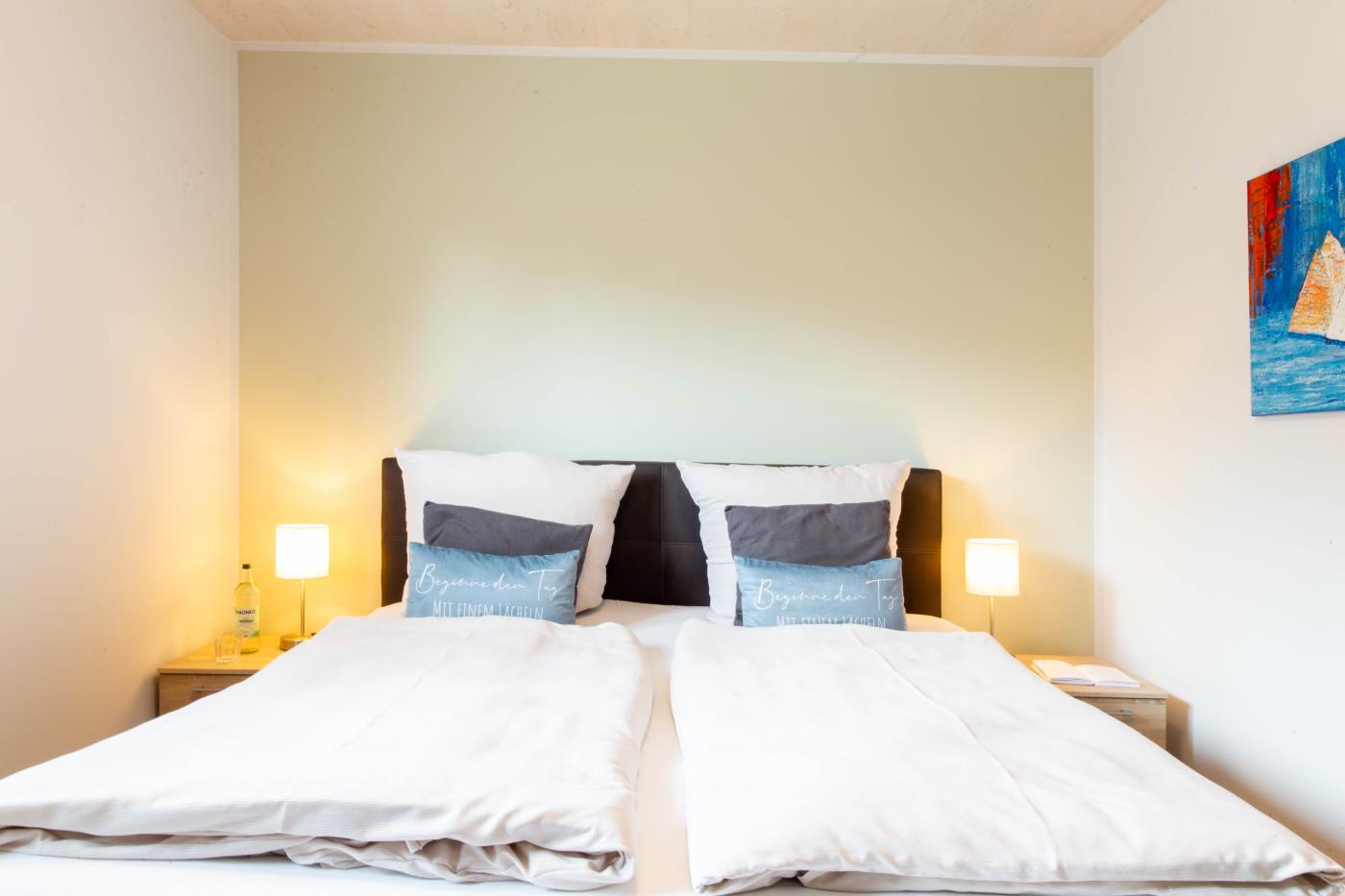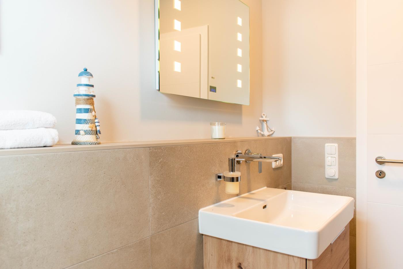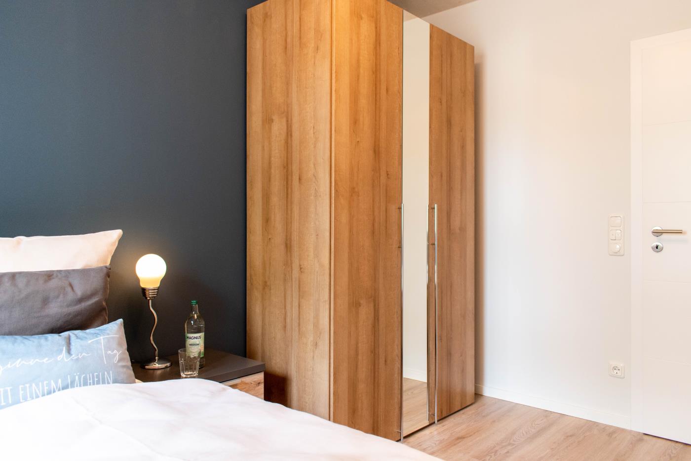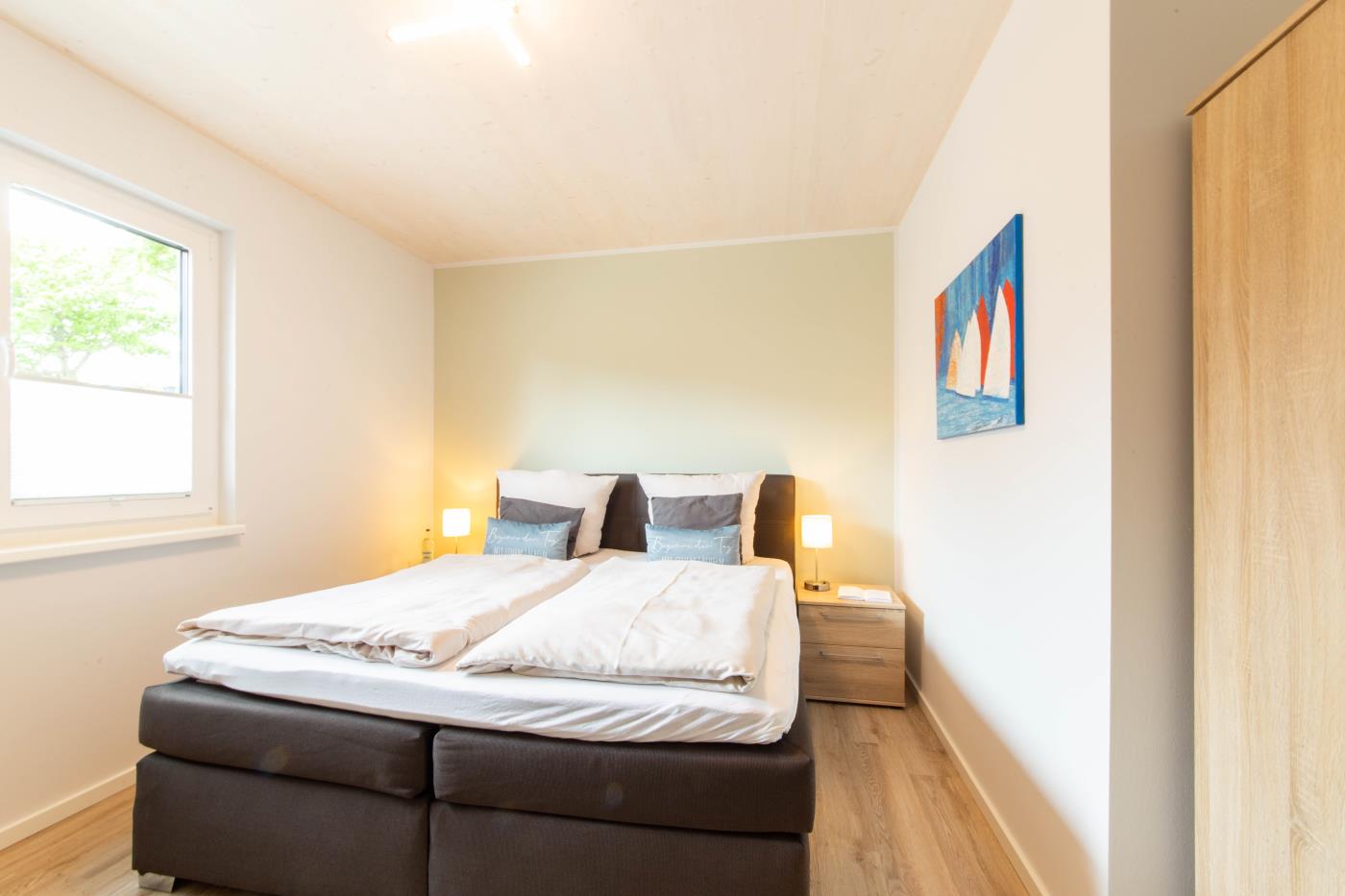 Hier bieten wir Ihnen auf 78 m² mit zwei separaten Schlafzimmern einen Neubau für vier Gäste. Eine bodentiefe Fensterfront im Wohnzimmer sorgt den ganzen Tag für eine helle und freundliche Atmosphäre. Die großzügige Sitzecke lädt zum geselligen Verweilen oder gemütlichen Entspannen ein. Der stilvolle Essbereich bietet viel Platz und ist geschickt in den Raum integriert, am großen Esstisch trifft man sich gerne zu jeder Tageszeit. Die Küche bildet mit der schicken Kochinsel das Herzstück der modernen Ferienwohnung. Die beiden Schlafzimmer sind mit gemütlichen Doppelbetten (1,80er und 1,40er Breite), Flat-TVs, Kommoden und Kleiderschränken ausgestattet. Das große Badezimmer verfügt über eine geräumige Raindance Dusche und einen Handtuchhalter. Sonnige Stunden lassen sich auf der Terrasse und im Garten genießen, das gesamte Haus ist Richtung Süden ausgerichtet.