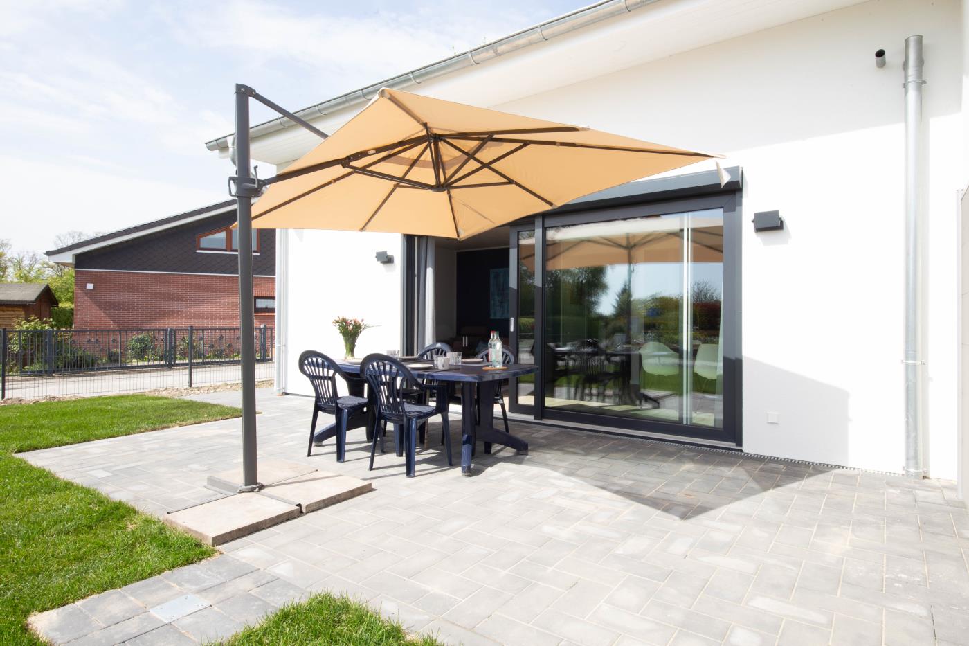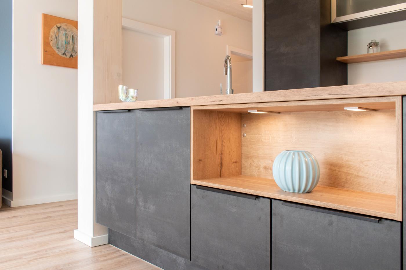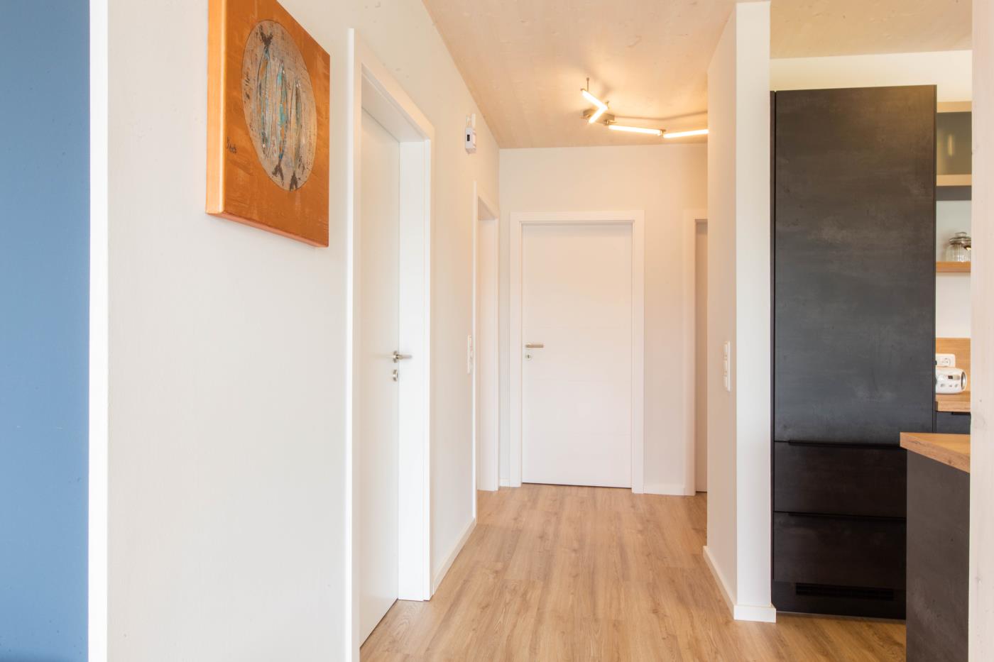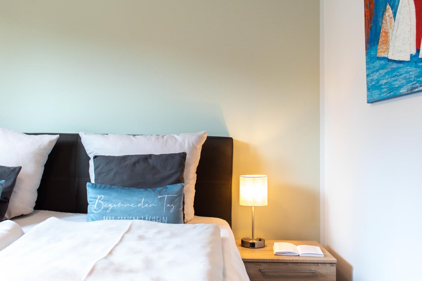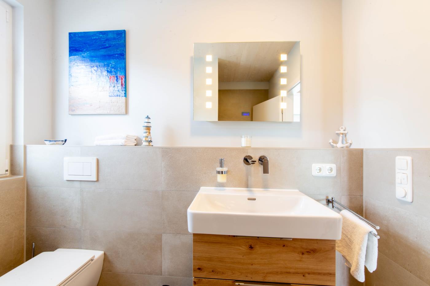 Hier bieten wir Ihnen auf 78 m² mit zwei separaten Schlafzimmern einen Neubau für vier Gäste. Eine bodentiefe Fensterfront im Wohnzimmer sorgt den ganzen Tag für eine helle und freundliche Atmosphäre. Die großzügige Sitzecke lädt zum geselligen Verweilen oder gemütlichen Entspannen ein. Der stilvolle Essbereich bietet viel Platz und ist geschickt in den Raum integriert, am großen Esstisch trifft man sich gerne zu jeder Tageszeit. Die Küche bildet mit der schicken Kochinsel das Herzstück der modernen Ferienwohnung. Die beiden Schlafzimmer sind mit gemütlichen Doppelbetten (1,80er und 1,40er Breite), Flat-TVs, Kommoden und Kleiderschränken ausgestattet. Das große Badezimmer verfügt über eine geräumige Raindance Dusche und einen Handtuchhalter. Sonnige Stunden lassen sich auf der Terrasse und im Garten genießen, das gesamte Haus ist Richtung Süden ausgerichtet.
