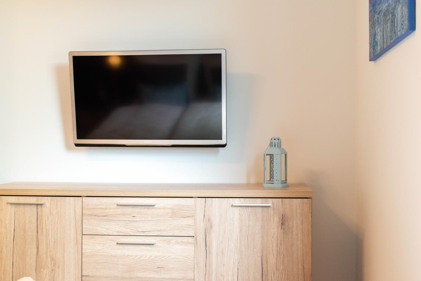 Sowohl der Wohnraum als auch die beiden Schlafzimmer sind mit Flat-TVs ausgestattet, zwei davon mit Smartfunktion, natürlich ist auch WLAN vorhanden.