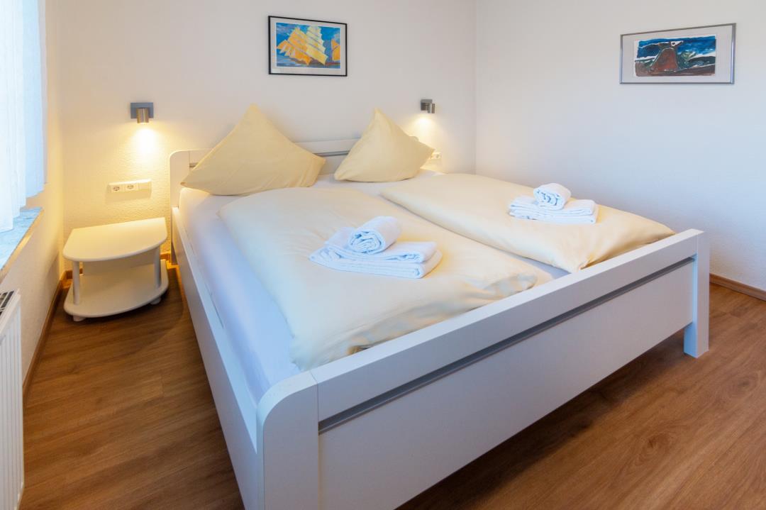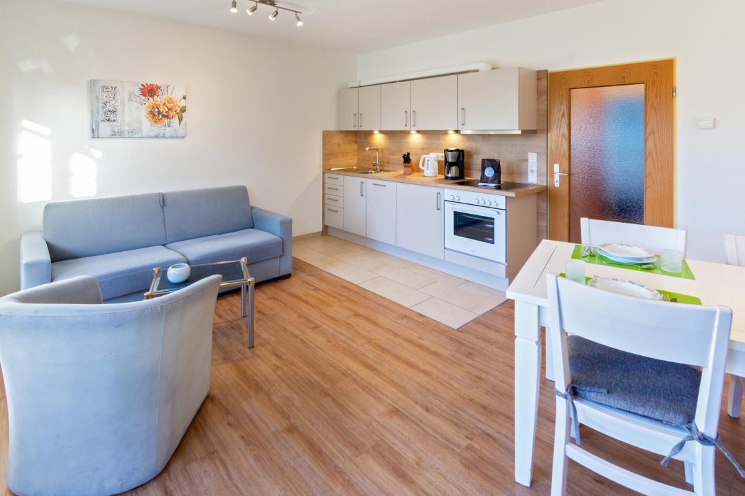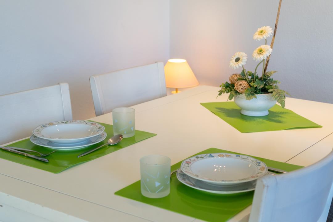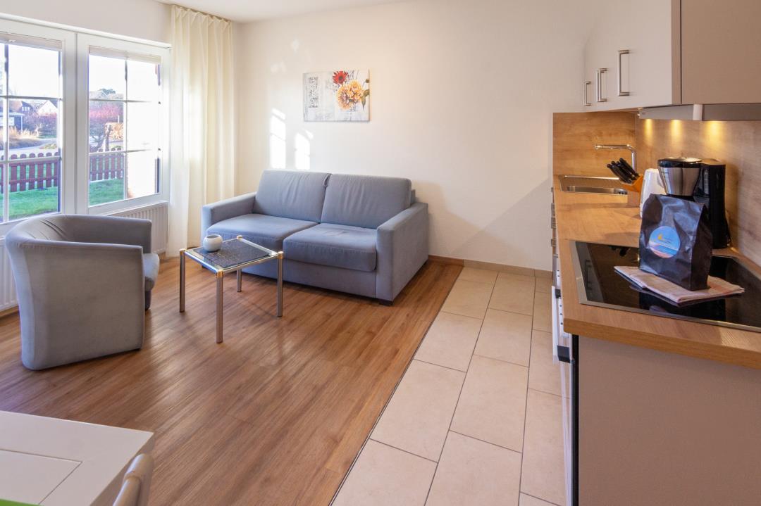 Das ruhig gelegene Schlafzimmer mit komfortablem Doppelbett sorgt für erholsame Nächte, während die moderne Küche mit Cerankochfeld, Backofen, Geschirrspüler, Kühlschrank mit Gefrierfach sowie Kaffeemaschine und Toaster perfekt für Selbstversorger ausgestattet ist. Das gepflegte Duschbad bietet ausreichend Platz und ist funktional gestaltet. Dank der Lage im Erdgeschoss ist die Wohnung besonders komfortabel erreichbar und ideal für Gäste, die barrierearme Zugänge bevorzugen.