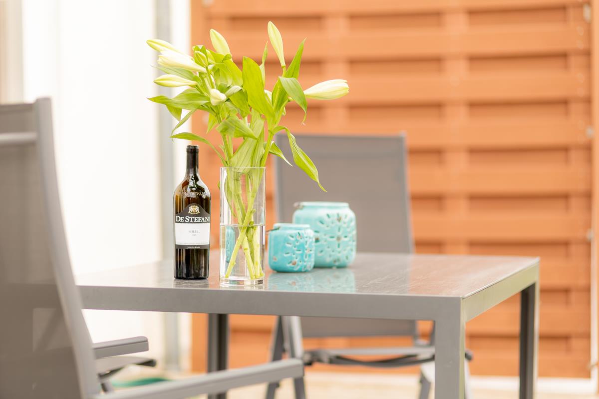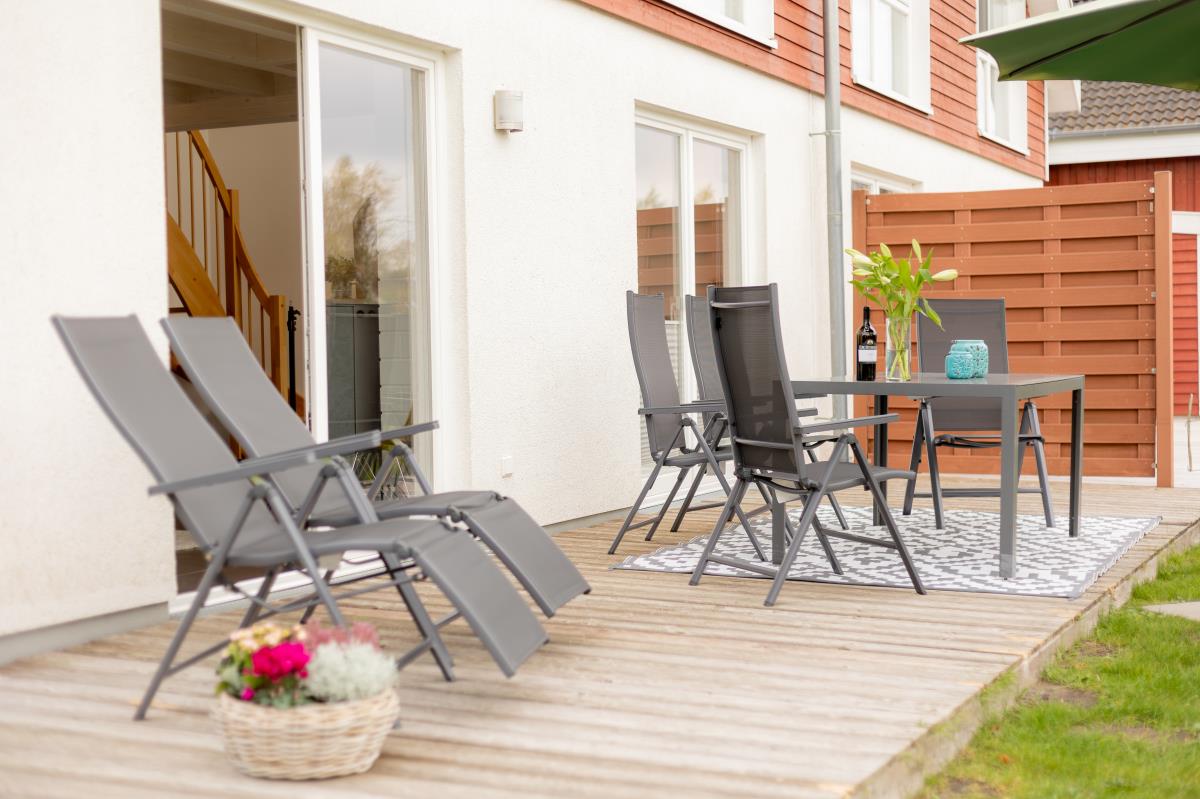 Die möblierte Holzterrasse mit Sonnenliegen, Esstisch und großem Sonnenschirm lädt zu erholsamen Stunden im Freien ein. Genießen Sie Ihr Frühstück mit Seeblick, ein Glas Wein in der warmen Abendsonne oder einfach den beruhigenden Blick aufs Wasser.