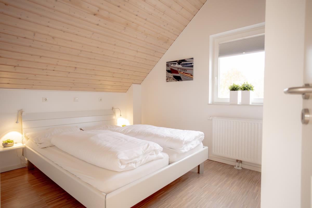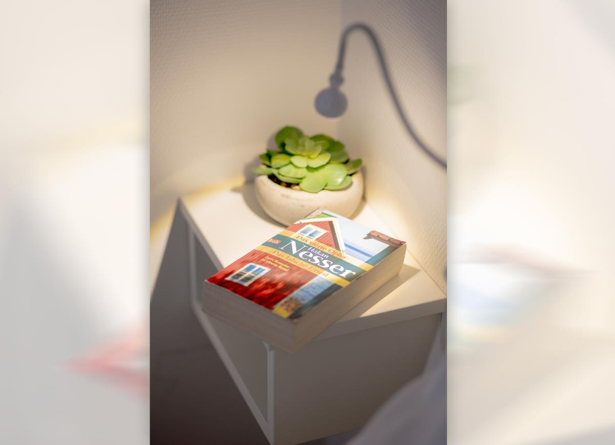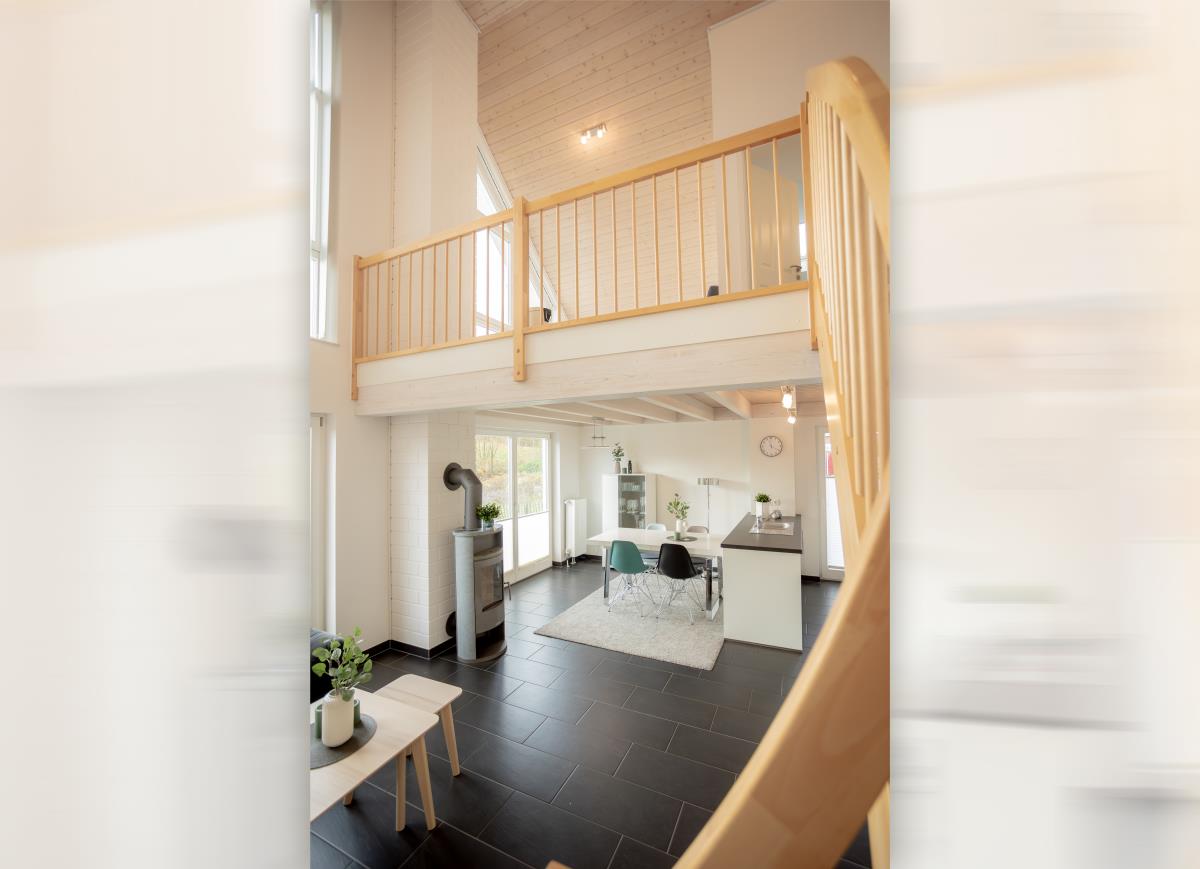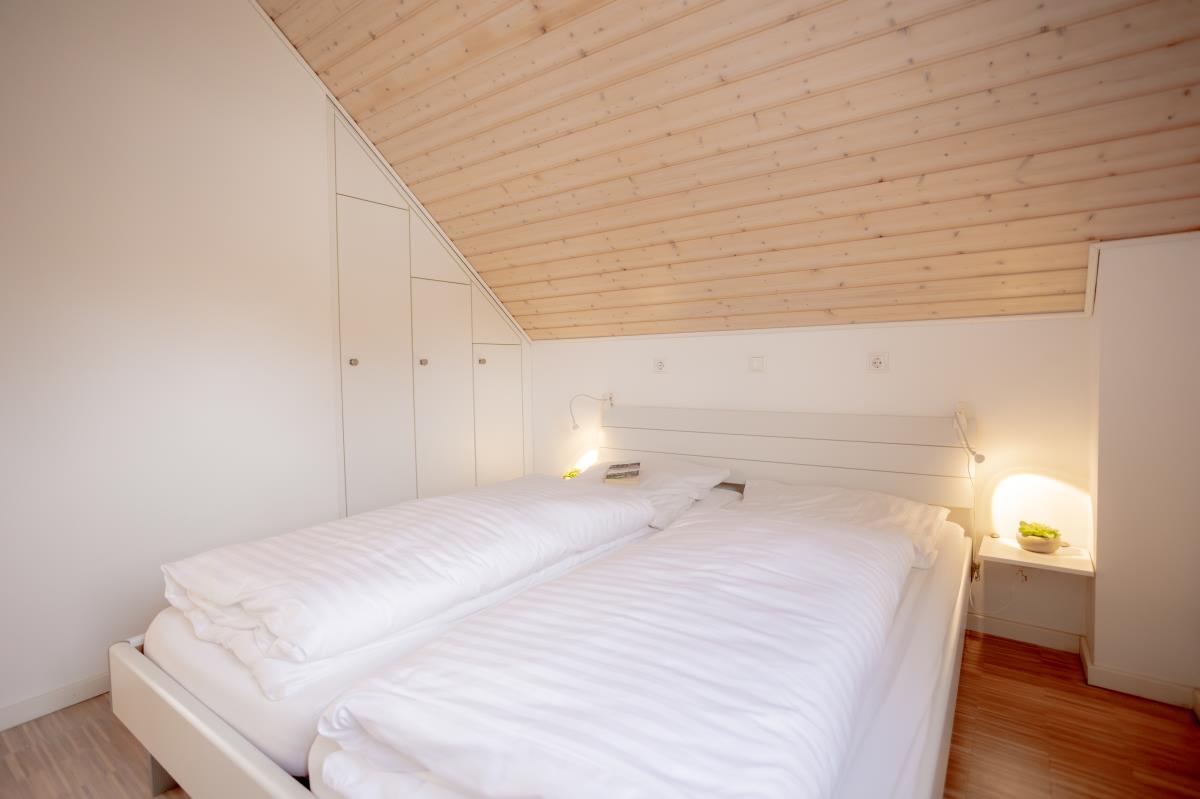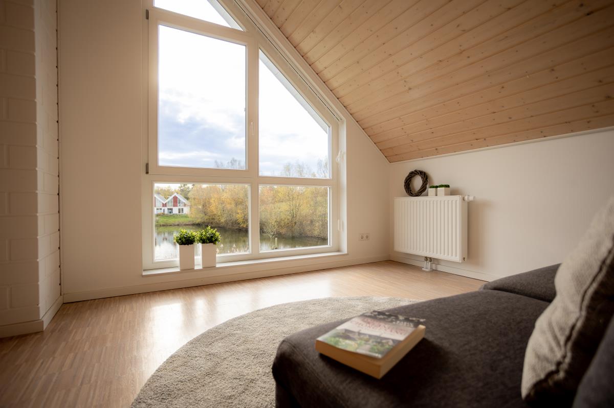 Im Obergeschoss befinden sich zwei komfortable Schlafzimmer mit hochwertigen Betten für bis zu vier Personen. Die offene Galerie ist ein weiterer Wohlfühlort mit Sesseln, die zu Relaxliegen und Panoramablick in den Garten und über das Wasser. Ein separates WC ergänzt die Etage und sorgt für zusätzlichen Komfort.