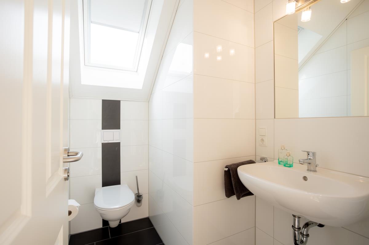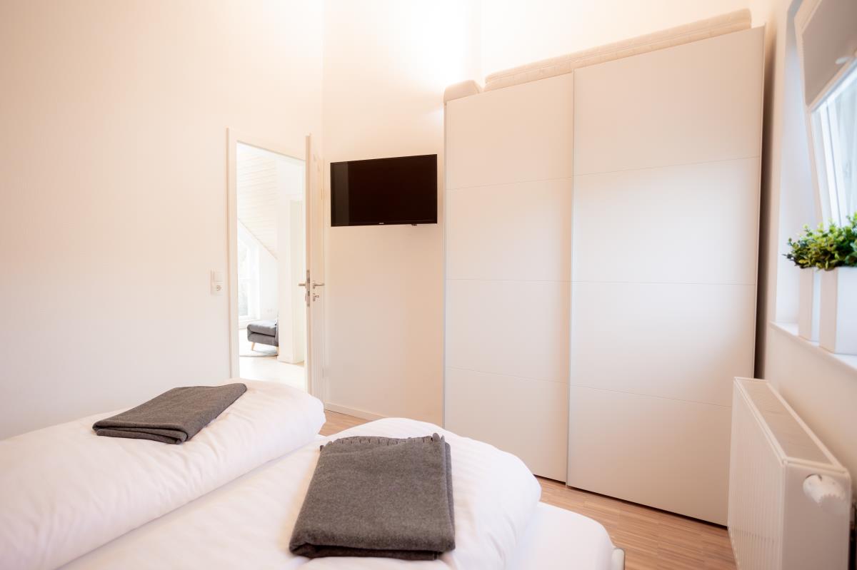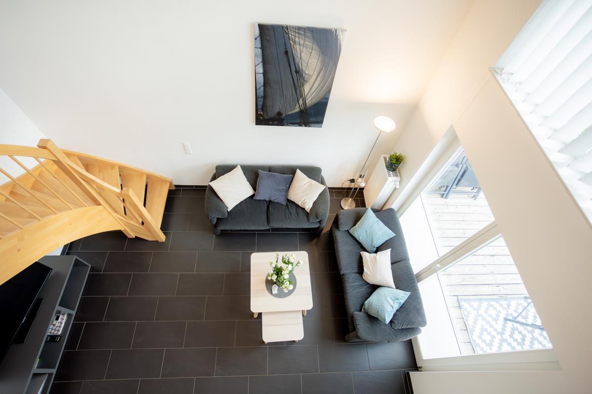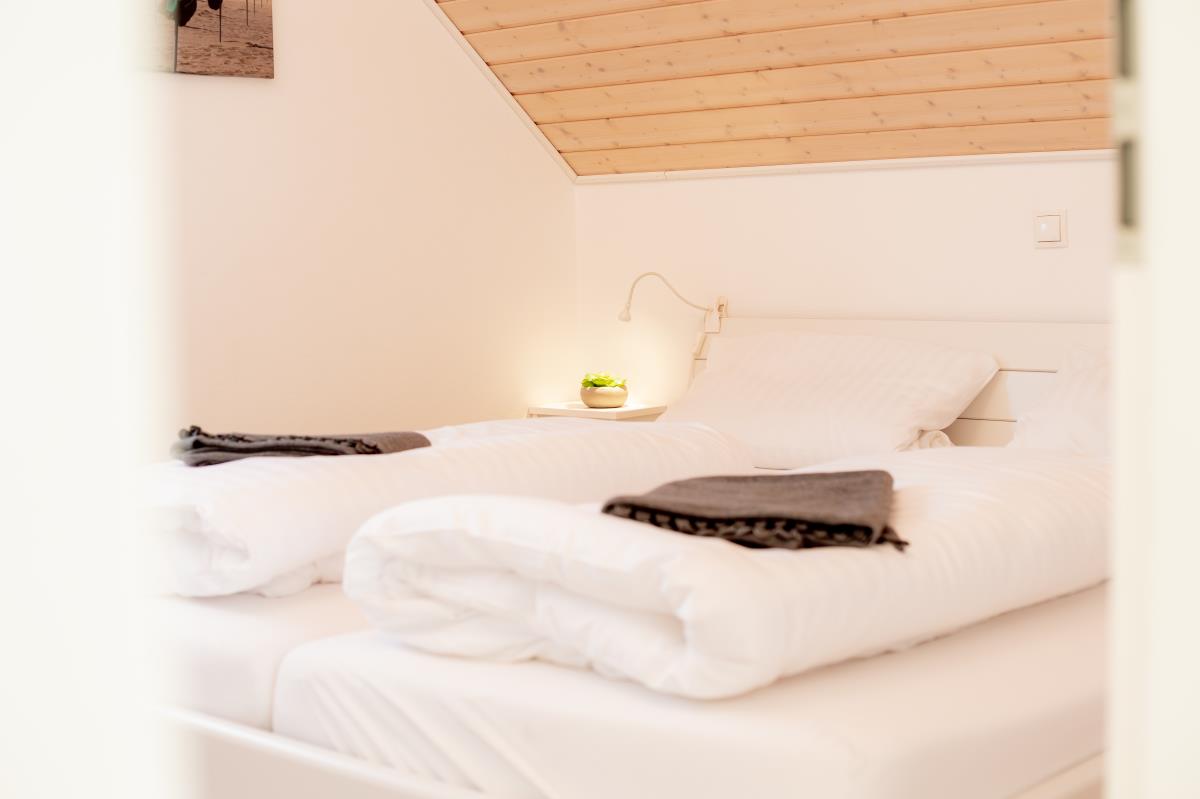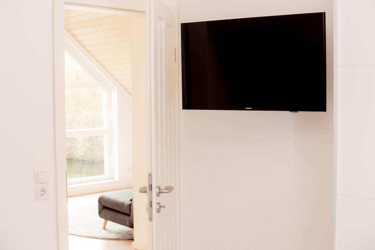 Im Obergeschoss befinden sich zwei komfortable Schlafzimmer mit hochwertigen Betten für bis zu vier Personen. Die offene Galerie ist ein weiterer Wohlfühlort mit Sesseln, die zu Relaxliegen und Panoramablick in den Garten und über das Wasser. Ein separates WC ergänzt die Etage und sorgt für zusätzlichen Komfort.
