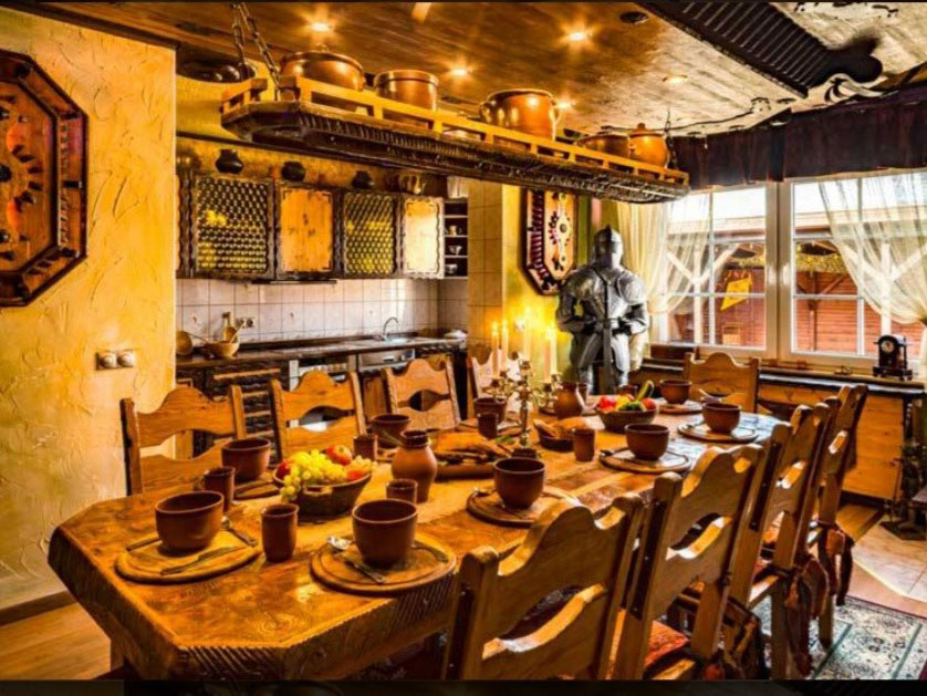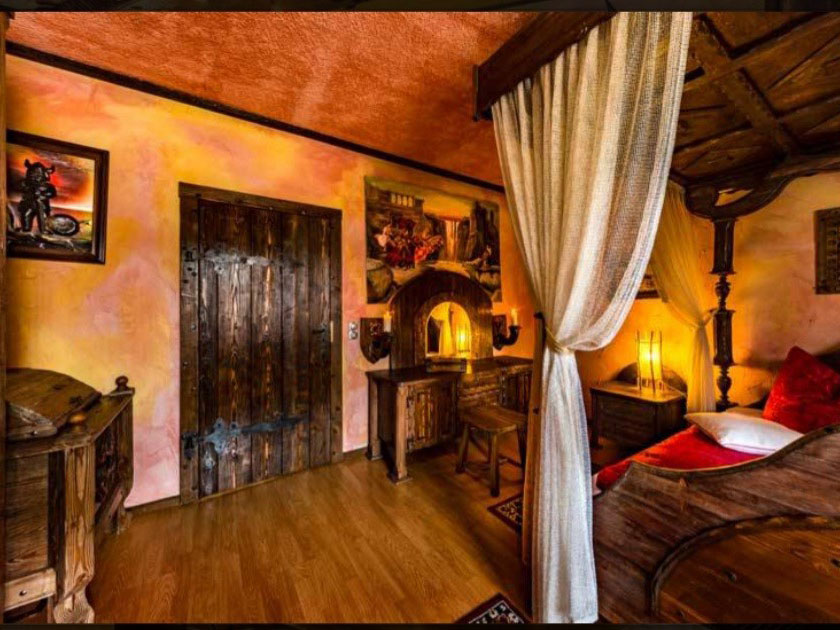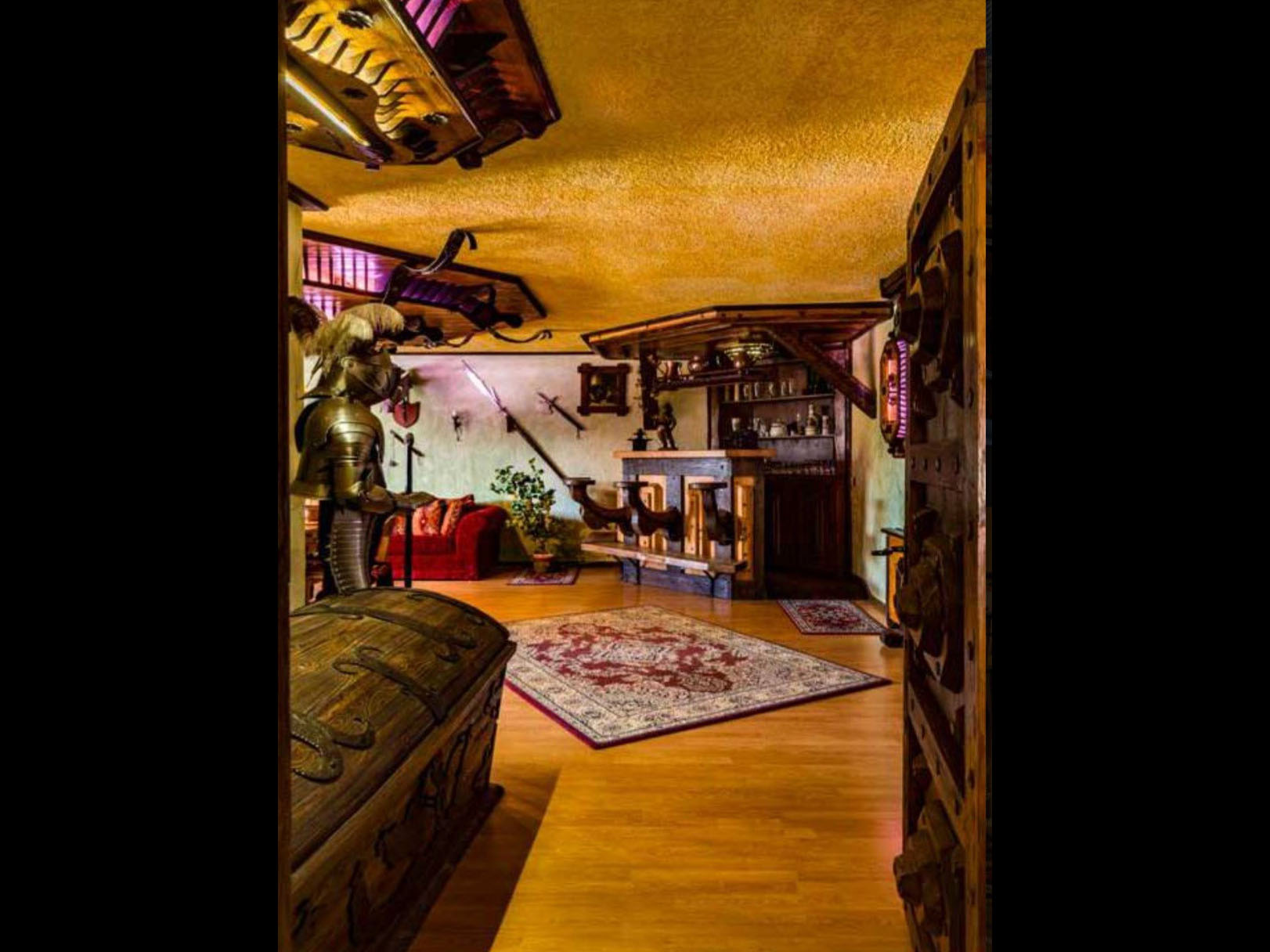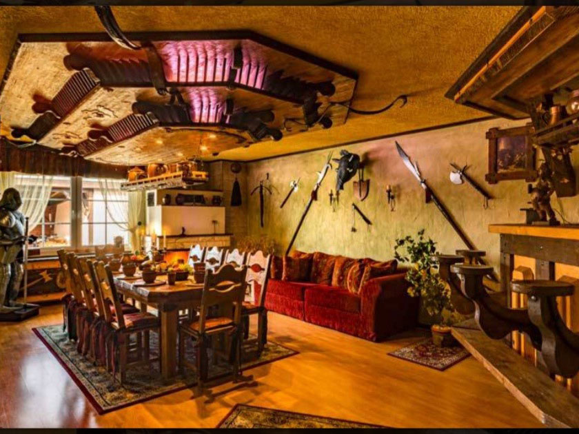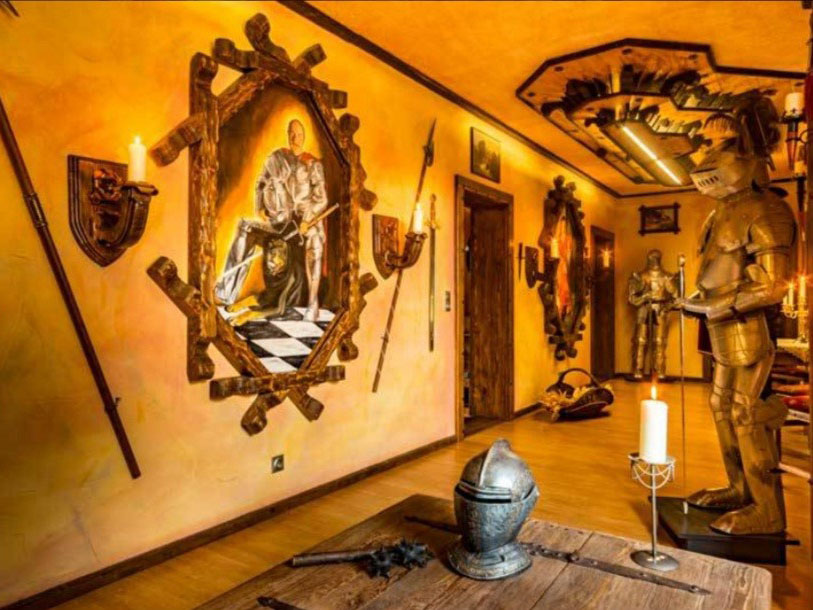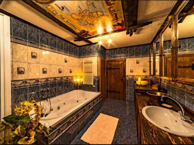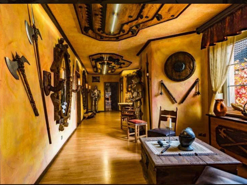 Leben wie die alten Ritter. Ritter waren Krieger. Schon beim Eintritt in die Ritterherberge begegnen uns Ritter in voller Eisenmontur mit Schild und Lanze. Aber keine Angst: Die Kerle, die damit Angst und Schrecken verbreiteten, sind nicht mehr da. Sicher, die alten Ritter hatten keine voll eingerichtete Küchenzeile inkl. E-Herd, Backofen, Kühlschrank, Gefriermöglichkeit, Kaffeemaschine, Mikrowelle, Spülmaschine, keinen Whirlpool und keine Dusche, wie in unserem schicken Badezimmer vorhanden, aber ein bisschen das Gefühl des Aufenthaltes in einer Ritterherberge vermittelt unser Ferienhaus schon. Da sind die schweren Holztüren, die nicht so ganz schließen (Holz arbeitet bekanntlich, das war früher auch schon so), die aus massivem Holz gestaltete Einrichtung, die Rittertafel für zwölf Personen im Rittersaal sowie das Himmelbett für die Eltern. Wenn Kinder oder Freunde mitkommen, stehen noch zwei Etagenbetten im Nachbarzimmer zur Verfügung, so können sechs Gäste bequem untergebracht werden. Eine weitere Person übernachtet gerne auf dem großen Sofa im Rittersaal(Wohnzimmer). Wenn es kalt wird, haben Sie als unsere Gäste noch einen großen Vorteil gegenüber den Rittern, denn neben dem Kamin im Rittersaal gibt es, gut hinter massiven Holzverkleidungen versteckt, moderne Heizkörper in allen Räumen. So müssen Sie nicht frieren, die Ritter hatten solchen Luxus nicht. Den Abend lassen Sie bei einem Glas Bier oder Wein in ihrer eigenen Ritter-Bar im Wohnzimmer ausklingen.