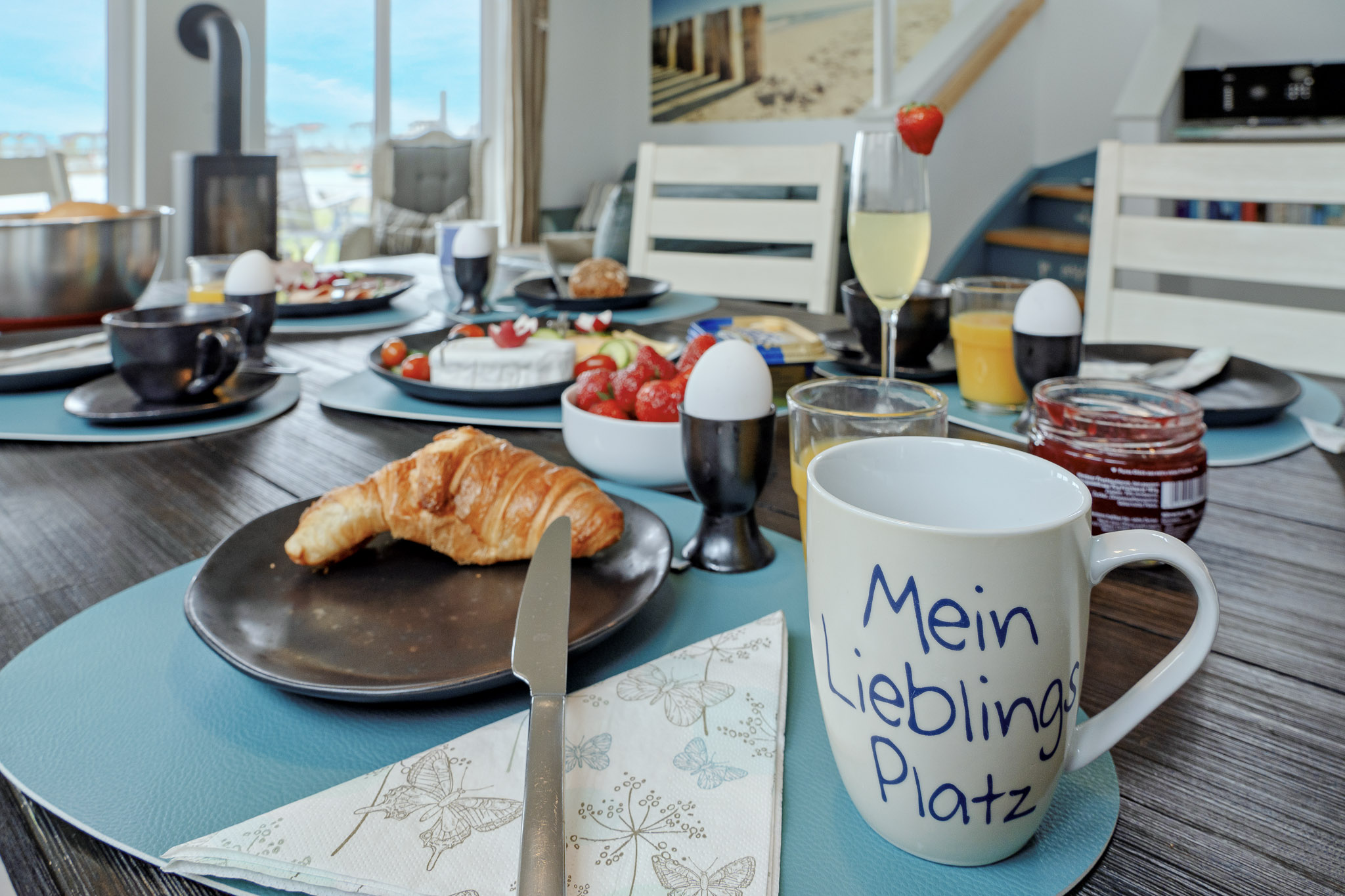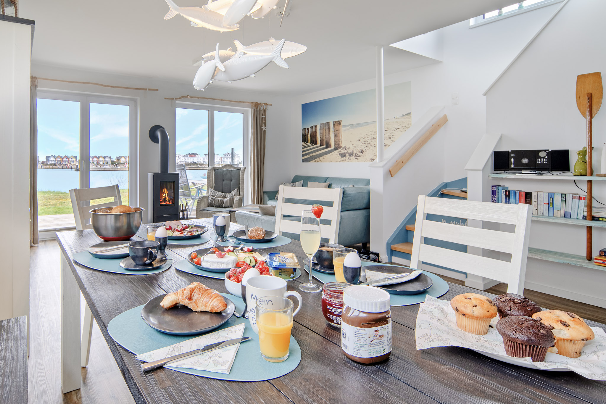 Das Ferienhaus Lieblingsplatz besticht durch eine liebevolle Einrichtung und eine familienfreundliche Ausstattung, die jeden begeistern wird. Der offene Wohn- und Essbereich im Erdgeschoss begeistert mit seiner Helligkeit und den bodentiefen Fenstern, die einen atemberaubenden Blick auf das Hafenbecken ermöglichen. Genießen Sie gemütliche Abende vor dem knisternden Kamin auf dem Ledersofa und entspannen Sie sich in dieser einladenden Atmosphäre. Gesellschaftsspiele und Bücher stehen für gemütliche Familienabende bereit.
