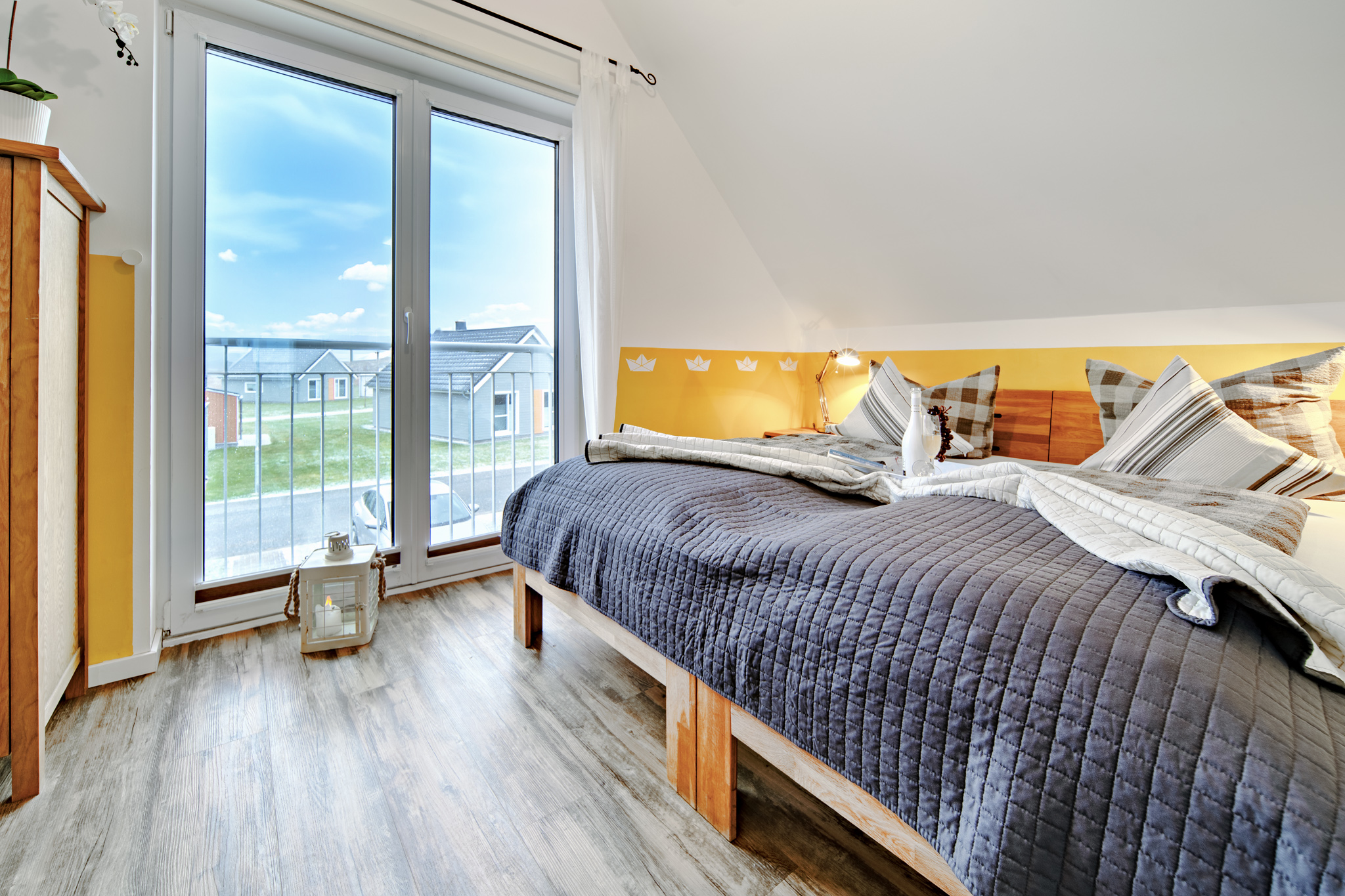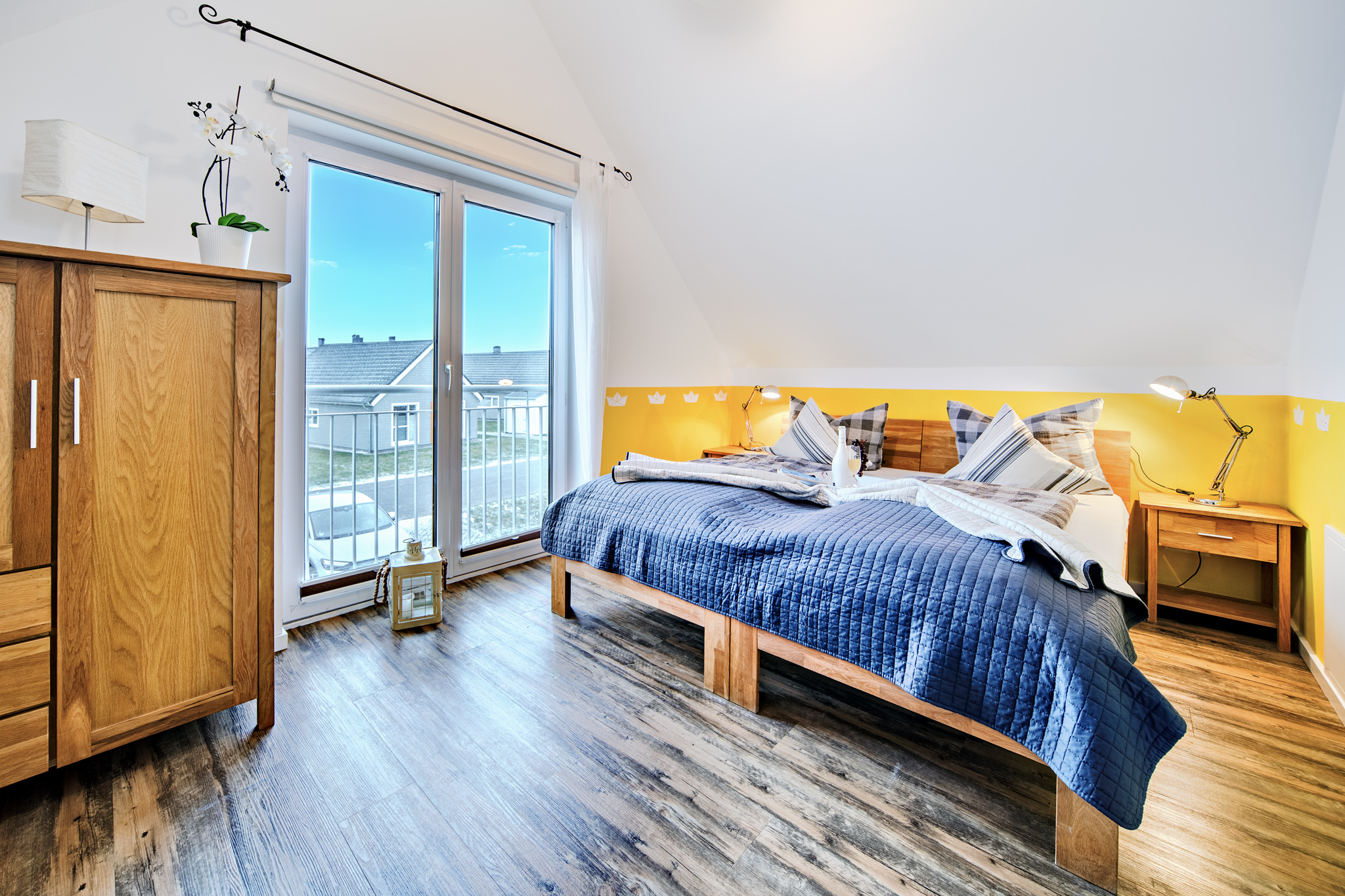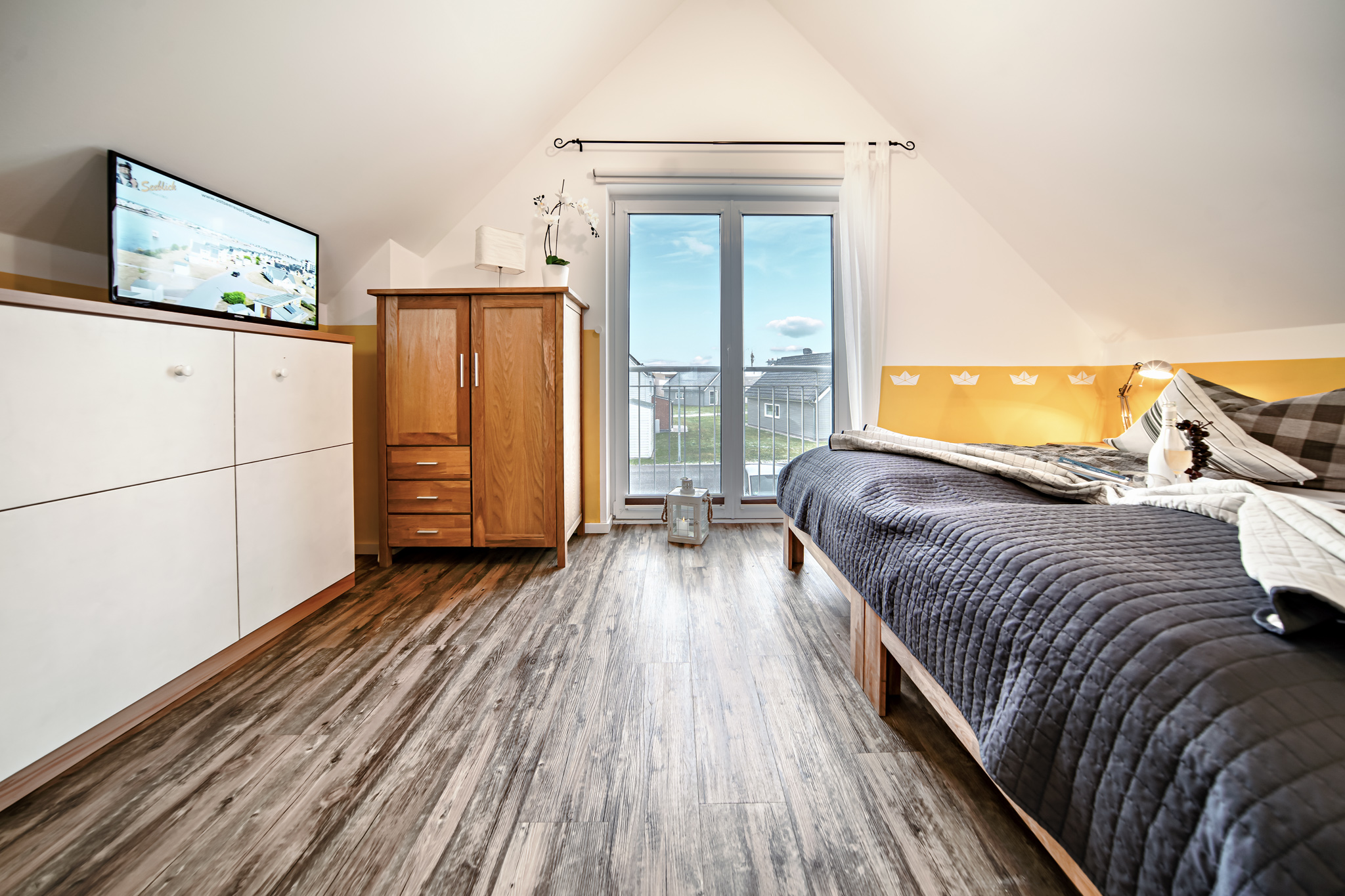 Im Obergeschoss des Ferienhauses finden Sie zwei Schlafzimmer vor, die zum Träumen einladen. Der Masterbedroom verwöhnt Sie mit einem komfortablen Doppelbett und einem atemberaubenden, direkten Wasserblick. Eine Deckenlampe mit Bluetoothfunktion sorgt nicht nur für angenehmes Licht, sondern ermöglicht es unseren Gästen auch, ihre Lieblingsmusik kabellos zu genießen. Ein 42-Zoll Android TV bietet zudem Unterhaltungsmöglichkeiten direkt vom Bett aus.