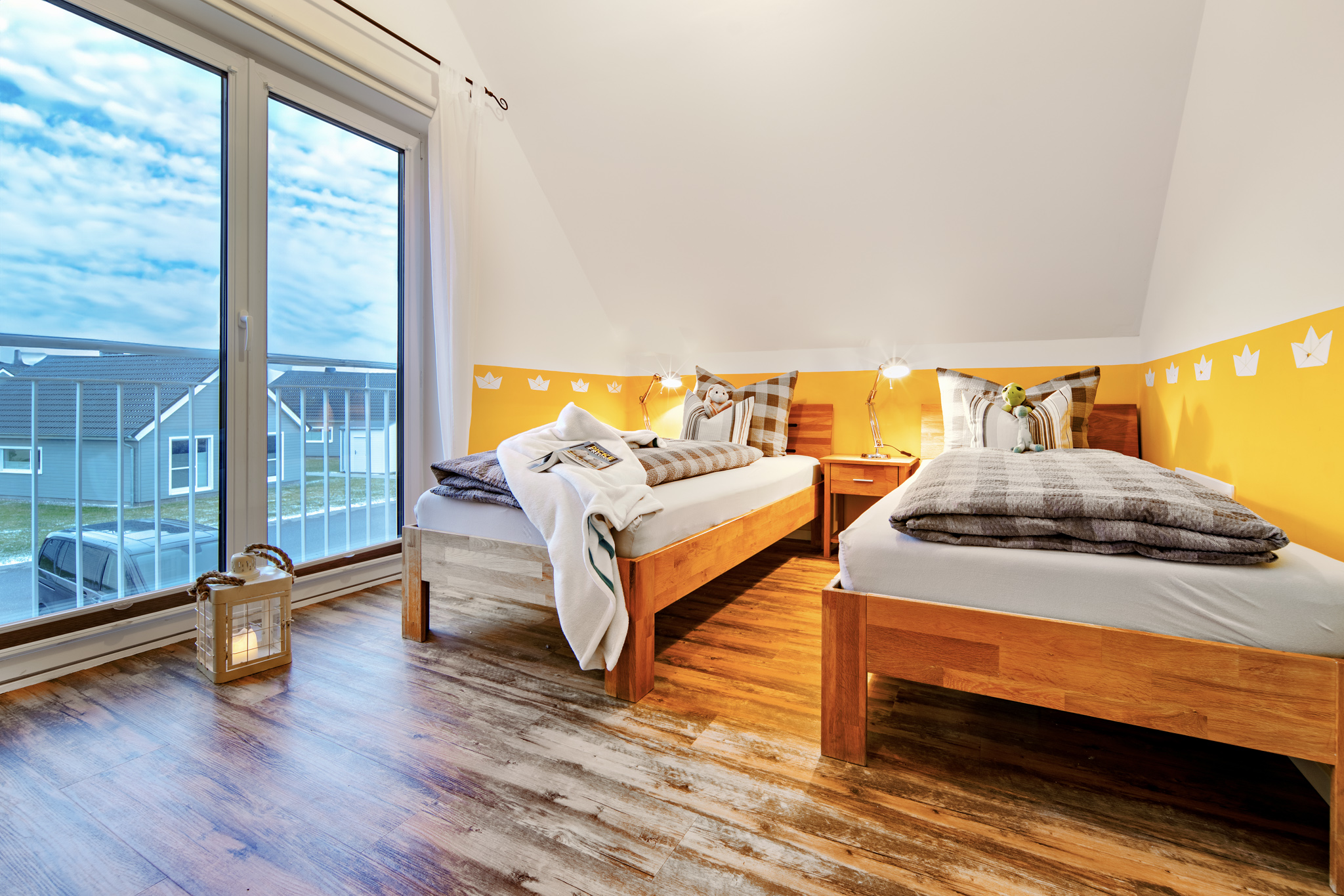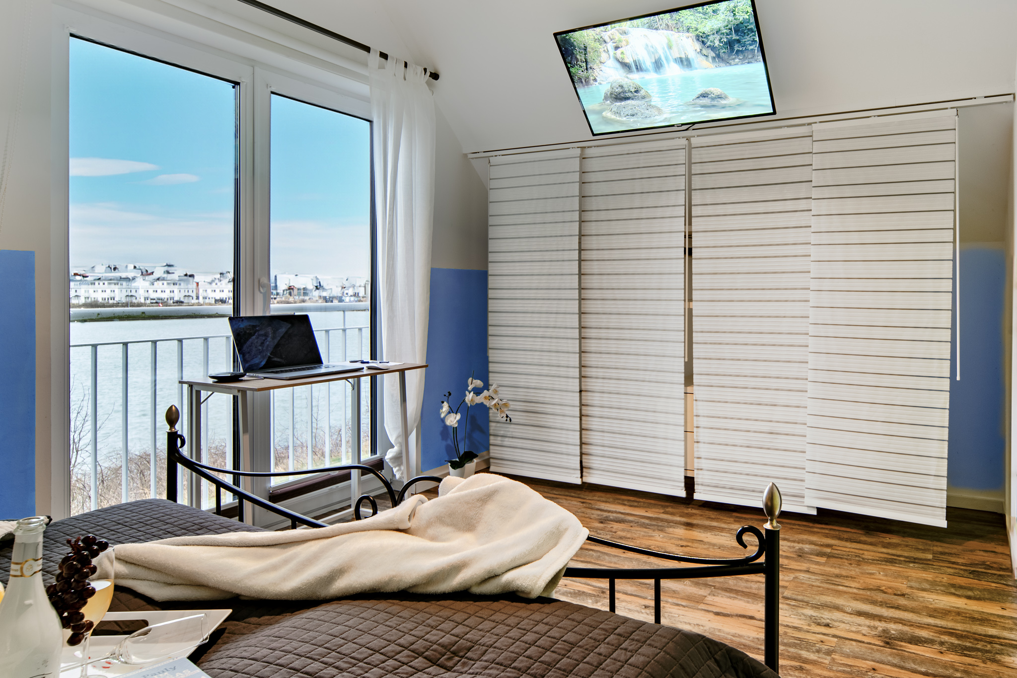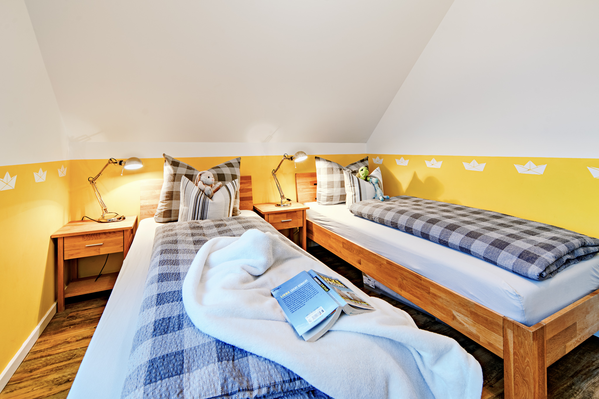 Im Obergeschoss des Ferienhauses finden Sie zwei Schlafzimmer vor, die zum Träumen einladen. Der Masterbedroom verwöhnt Sie mit einem komfortablen Doppelbett und einem atemberaubenden, direkten Wasserblick. Eine Deckenlampe mit Bluetoothfunktion sorgt nicht nur für angenehmes Licht, sondern ermöglicht es unseren Gästen auch, ihre Lieblingsmusik kabellos zu genießen. Ein 42-Zoll Android TV bietet zudem Unterhaltungsmöglichkeiten direkt vom Bett aus.