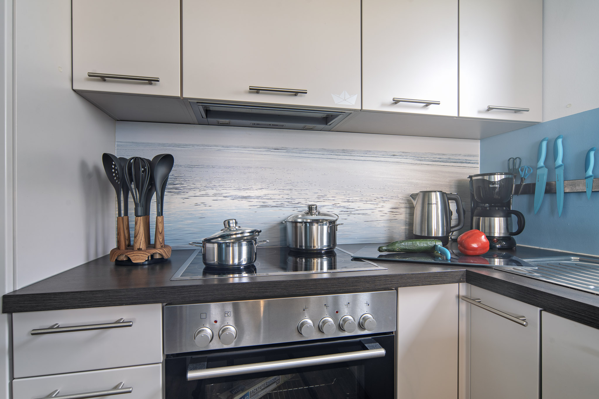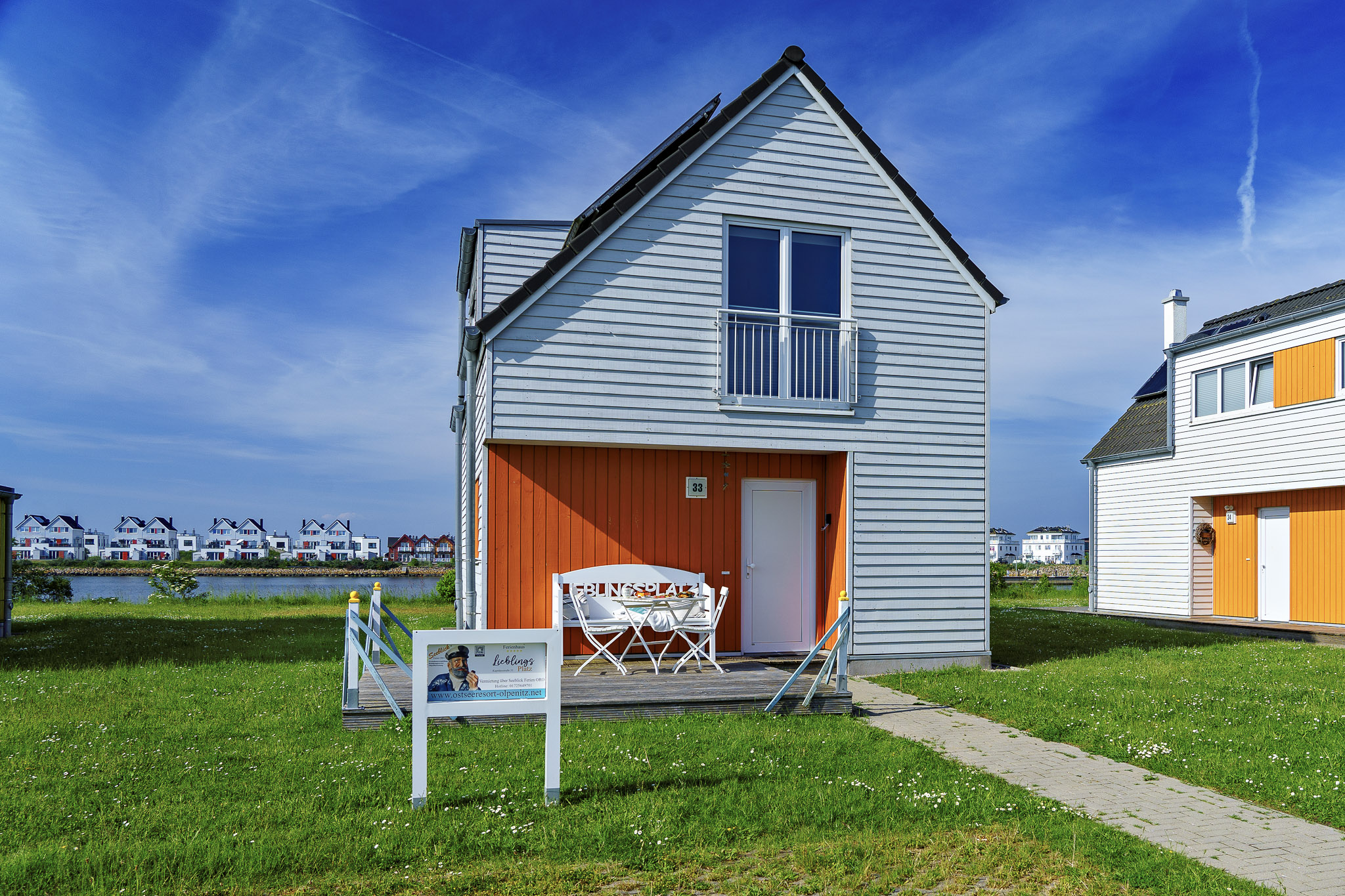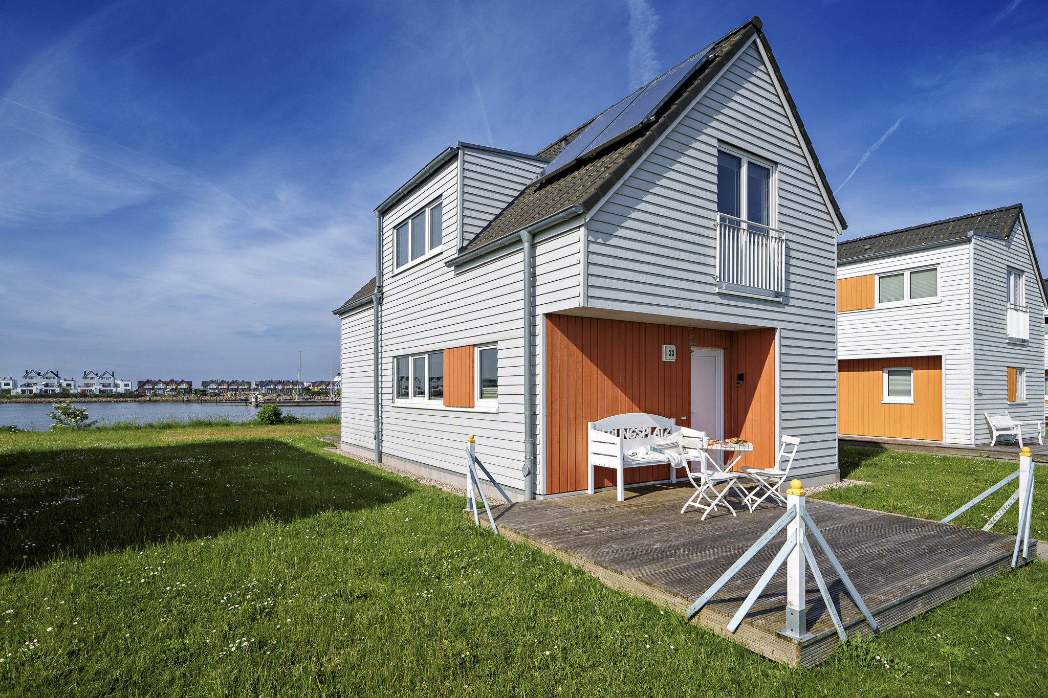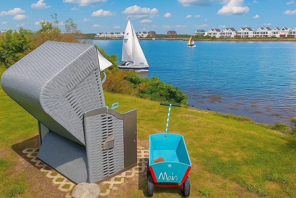 Die angrenzende Terrasse lädt zum Spielen, Toben oder einfach nur Entspannen ein und bietet Ihnen eine große Grünfläche für viele Aktivitäten im Freien mit Blick auf die Marina, nehmen Sie Platz in Ihrem privaten Strandkorb. Die voll ausgestattete Küche lässt keine Wünsche offen und ermöglicht es Ihnen, Ihre Lieblingsmahlzeiten mit einem traumhaften Wasserblick zuzubereiten.