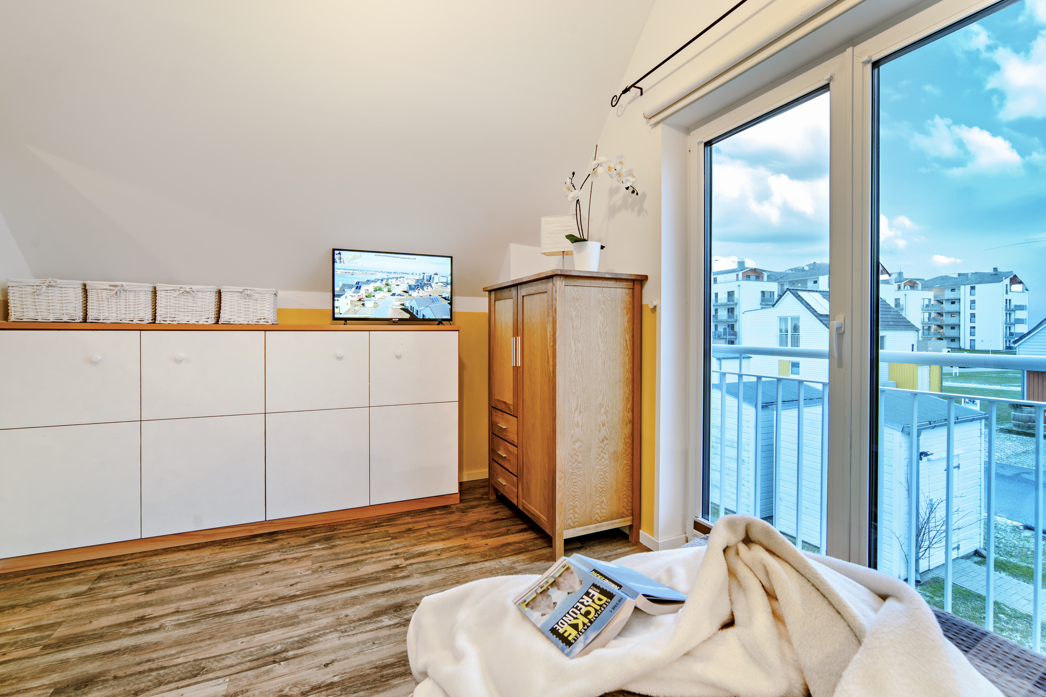 Das zweite Schlafzimmer ist flexibel gestaltet, mit zwei Einzelbetten, die bei Bedarf zu einem gemütlichen Doppelbett umgewandelt werden können. Ein hochwertiges Schrankbett ermöglicht zusätzlichen Komfort und Raumoptimierung. Hier steht ebenfalls ein 32-Zoll Android TV zur Verfügung, um den Gästen weitere Unterhaltungsoptionen zu bieten.