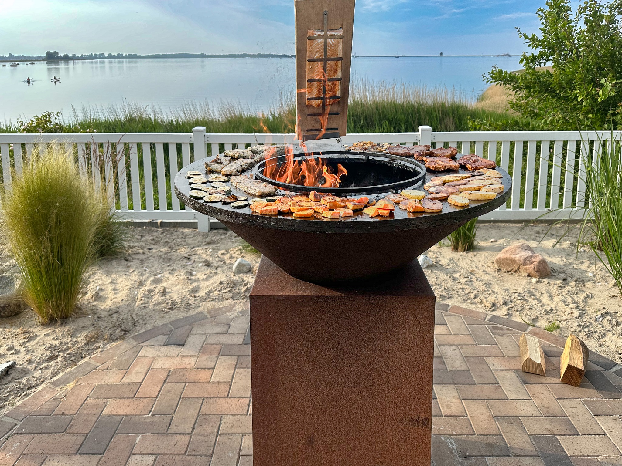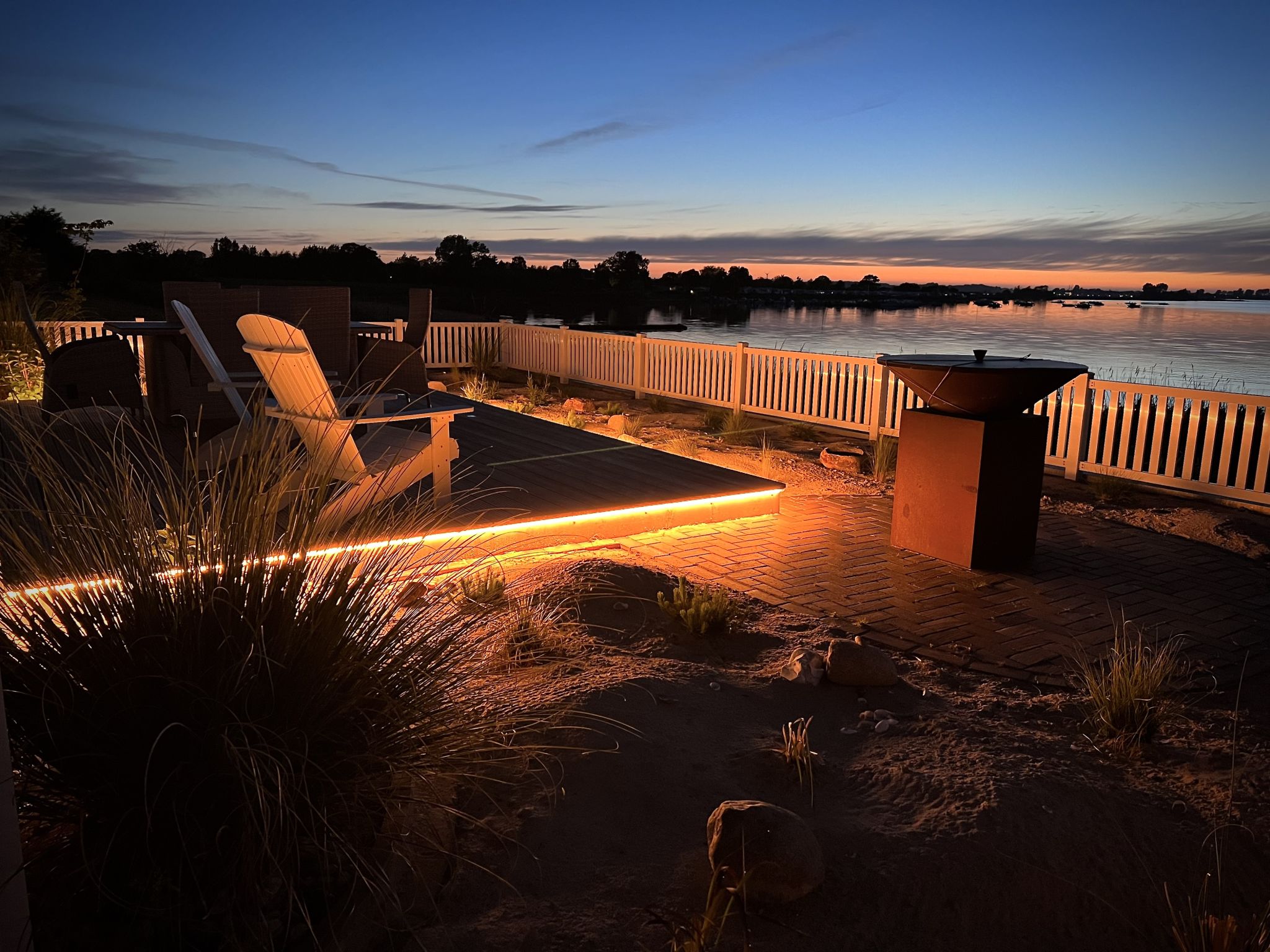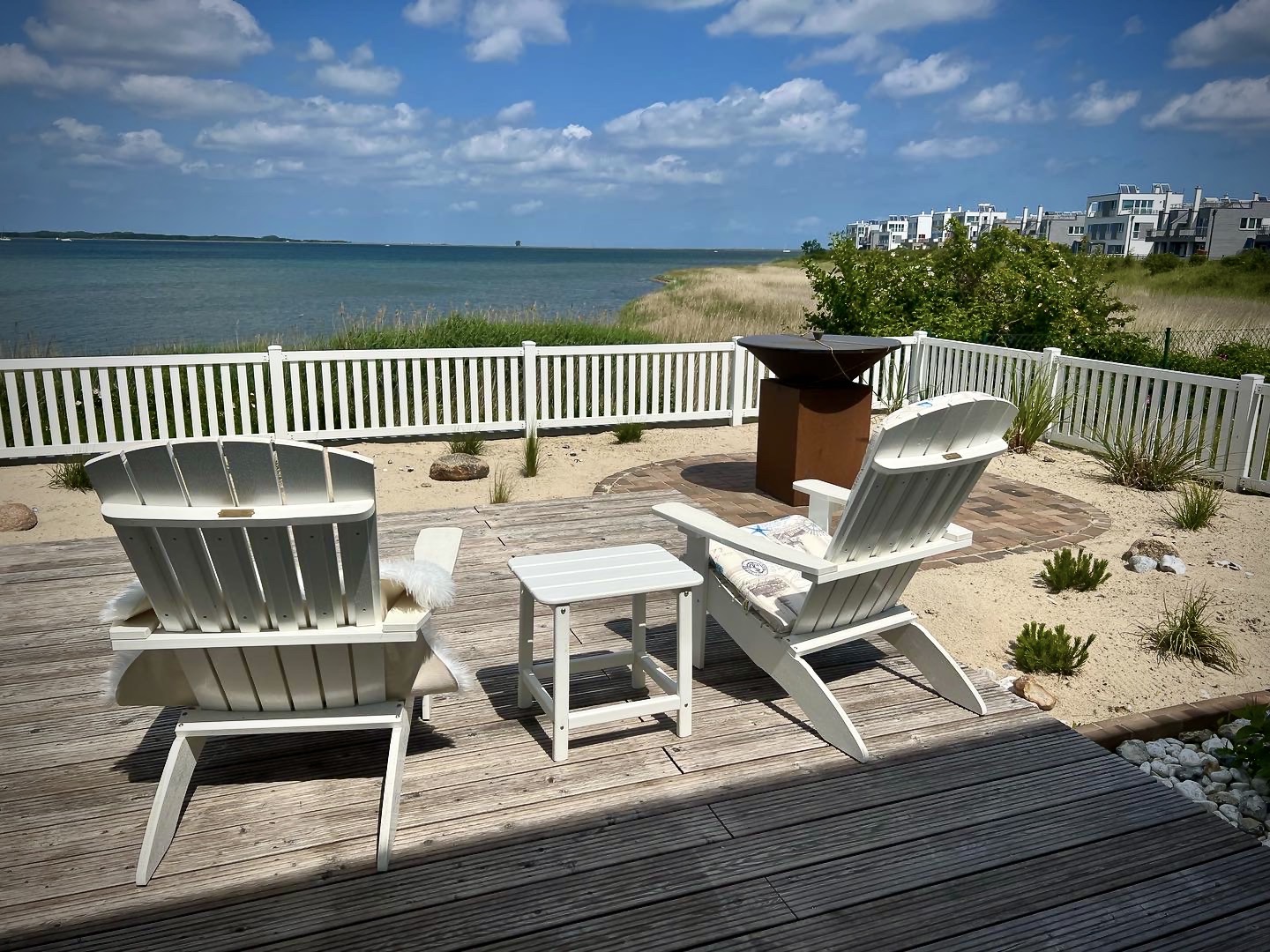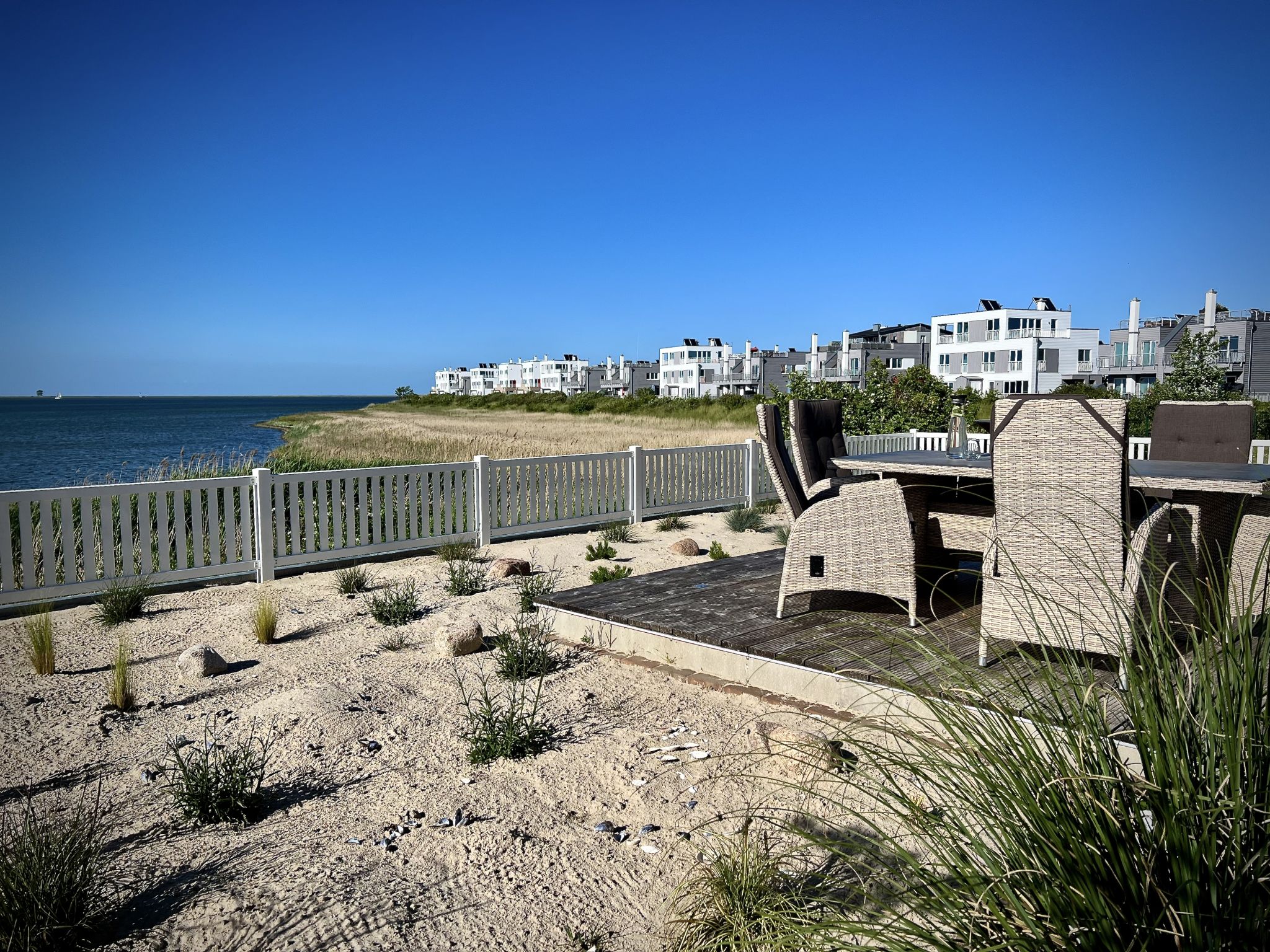 Die um das ganze Haus verlaufene Veranda bietet die Möglichkeit immer ein windgeschütztes Plätzchen zu finden und die Zeit am Meer zu genießen. Der im Anschluss an die Terrasse in Richtung Wasser umzäunte Garten mit kleinem Strandabschnitt ist das Highlight und definitiv einzigartig. Ein Strandkorb, Gartenmöbel und zwei Adirondack-Stühle mit Tisch und Fußteil stehen zur Verfügung. Der Blick fällt hier auf die atemberaubende Wasserkulisse der Schlei. Unvergessliche Sonnenuntergänge mit vorbeifahrenden Segelschiffen, Möwen in der Luft und die umgebende Ostseebrise ist ein Naturschauspiel, von dem man nicht müde wird, zuzuschauen. Das ist Urlaub mit „Seeblick Ferien ORO“ in diesem Traumhaus „Sliminde“.