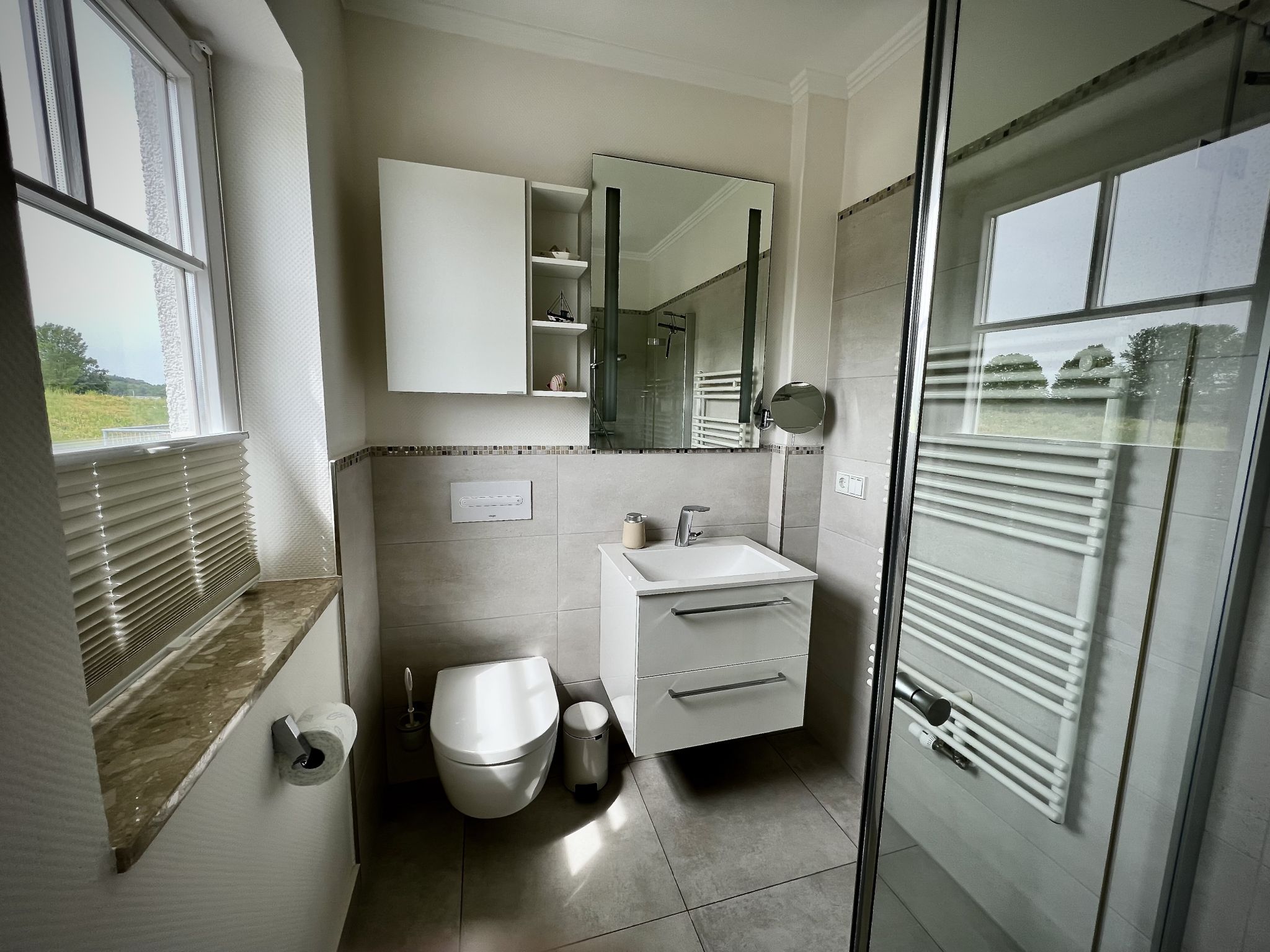 Das voll ausgestattete Badezimmer im Obergeschoss, mit bodengleicher Dusche, bietet maritime Wellness-Momente. In der separaten finnischen Sauna lässt es sich zu jeder Jahreszeit tiefenentspannen.