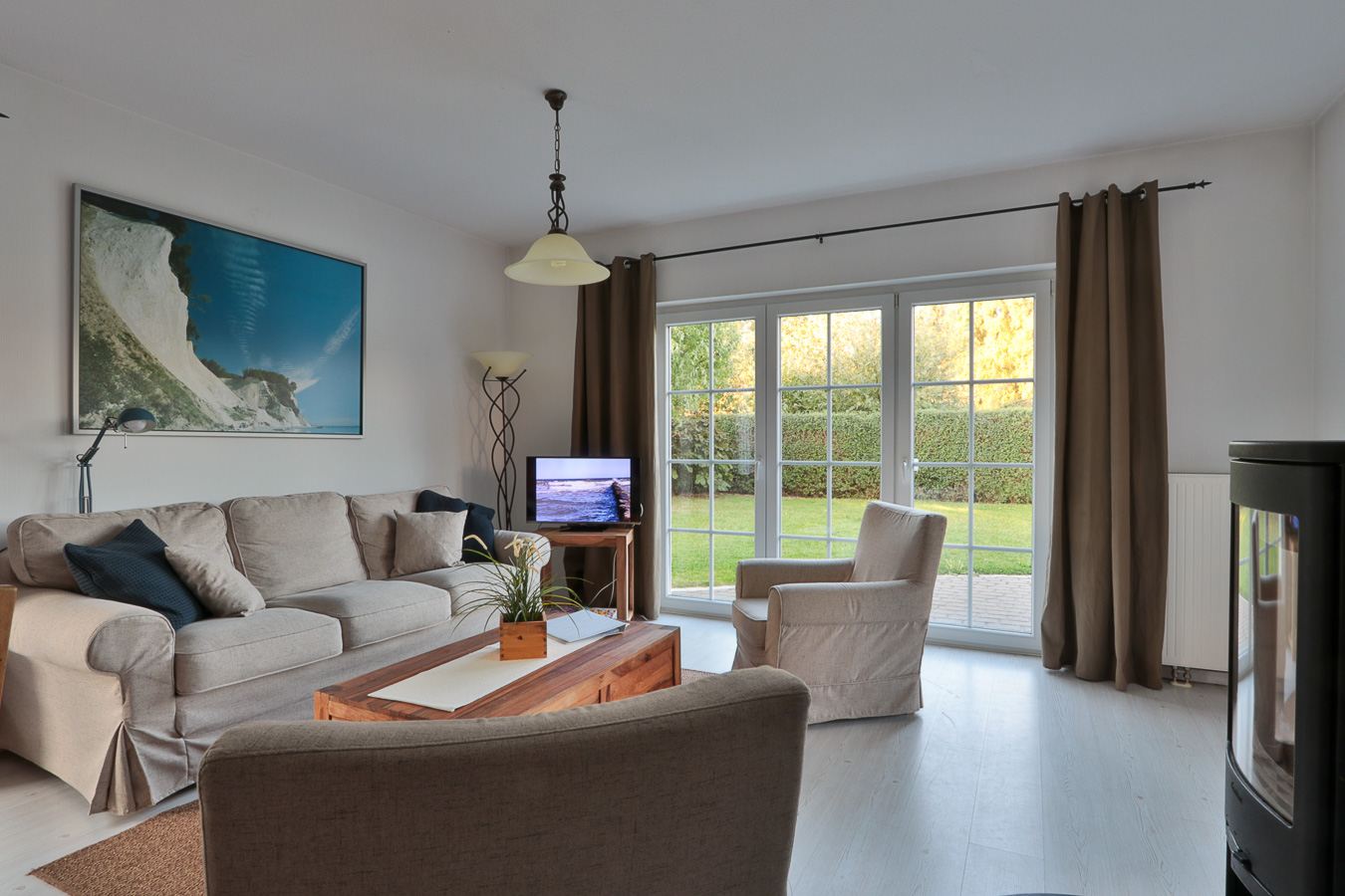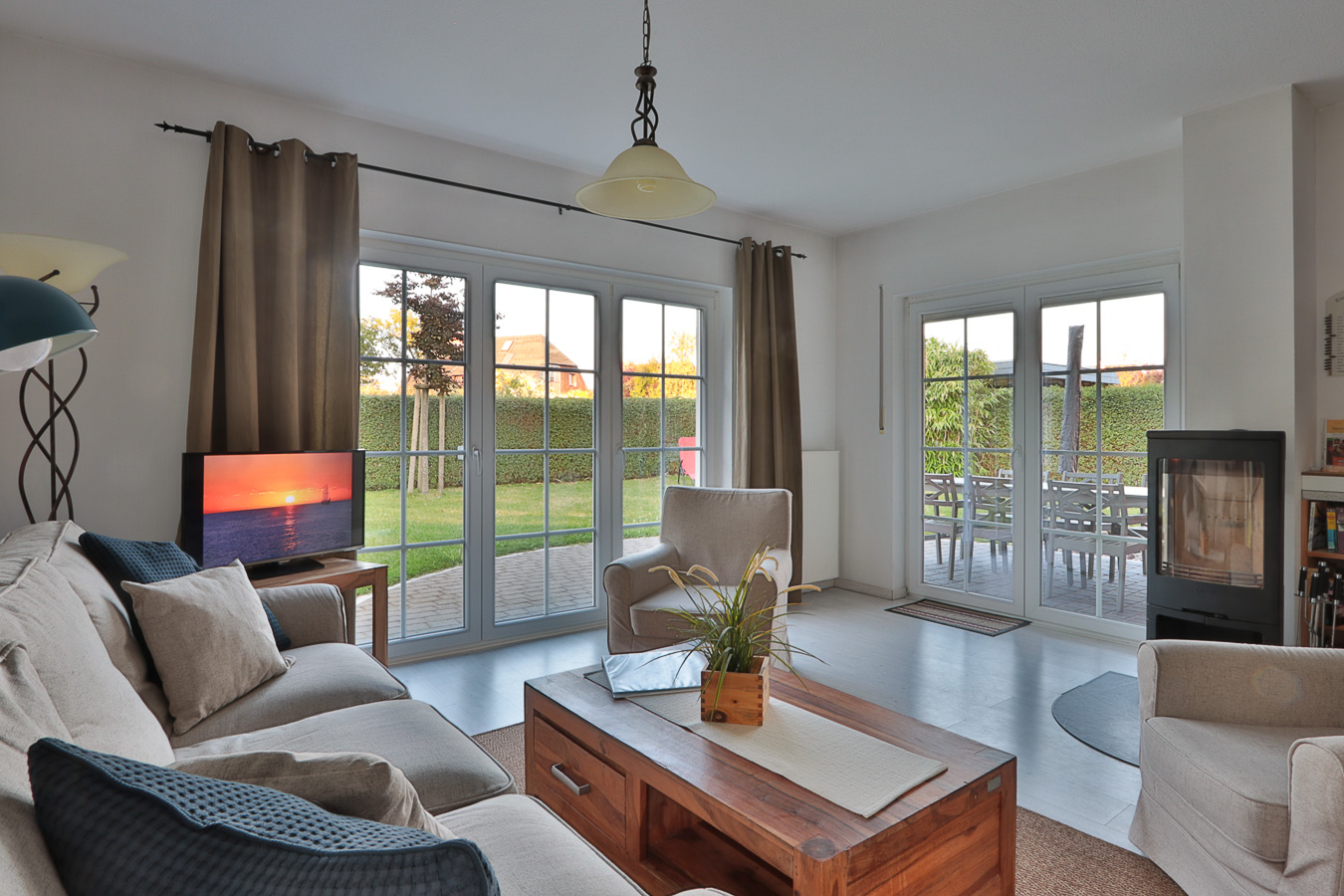 Im geschmackvoll und liebevoll eingerichteten Ferienhaus "Piratennest" finden Sie ein großzügiges Wohnzimmer mit Kaminofen. Der gemütliche Wohnbereich verfügt über eine Couch. Die angrenzende offene Küche ist komplett mit allen modernen Geräten ausgestattet und lässt keine Wünsche offen, natürlich gibt es hier auch einen Esstisch mit 6 Stühlen. In den 2 Schlafzimmern stehen Doppelbetten zur Verfügung sowie je 1 Kleiderschrank. Außerdem sind 2 Duschbäder vorhanden. Die Terrasse ist teilweise überdacht. Direkt auf dem Grundstück stehen 2 PKW-Stellplätze zur Verfügung.