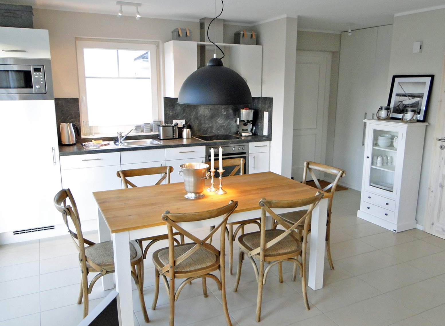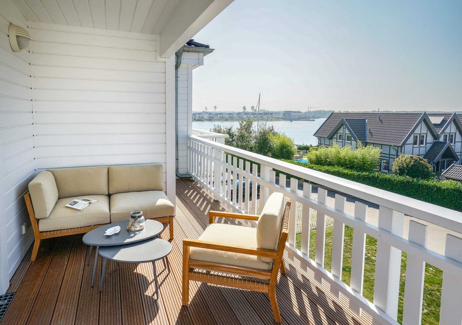 Der Wohnraum verfügt über eine gemütliche Couchgarnitur und eine angrenzende offene Küche, in der schmackhafte Mahlzeiten zubereitet und in geselliger Runde am großen Esstisch eingenommen werden können. Von hier aus hat man direkten Zugang zur Terrasse des Erdgeschosses, die nach Westen ausgerichtet ist, sodass man am Abend die erlebnisreichen Urlaubstage bei einem Glas Wein wunderbar ausklingen lassen kann. Oder Sie machen es sich auf der Dachterrasse gemütlich – hier können Sie den Blick auf den Hafen des Resorts und die Schlei genießen und dabei den Sonnenuntergang beobachten. Sollte das Wetter einmal nicht so perfekt sein, können Sie es sich im Ferienhaus so richtig gut gehen lassen und die Seele bei einem Sprudelbad in der Whirlpoolwanne und einem ausgiebigen Saunagang baumeln lassen.