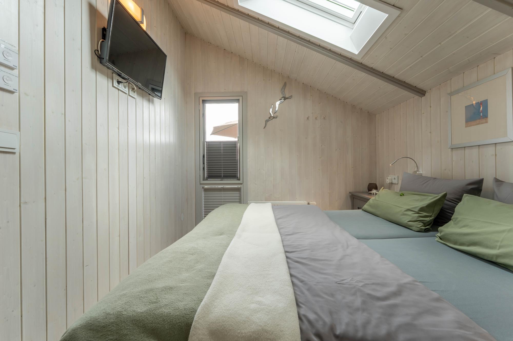 Schlafzimmer 1: Laminatboden, Hauptschlafzimmer mit einem Doppelbett (180x200 cm), hochwertige Viskosematratzen und elektrisch verstellbare Lattenroste, Oberbetten von Schlafmond, Kopfkissen 80x80 cm und Kopfkissen 40x80 cm, Bettdecken 155x220 cm, Flachbildschirm mit Internetanschluss, Radiowecker, Wandspiegel, Seeblick, Fliegengitter, Verdunklungsplissee, Rauchmelder, Kinderreisebett mit Oberbett und Kinderhochstuhl nur auf Anfrage