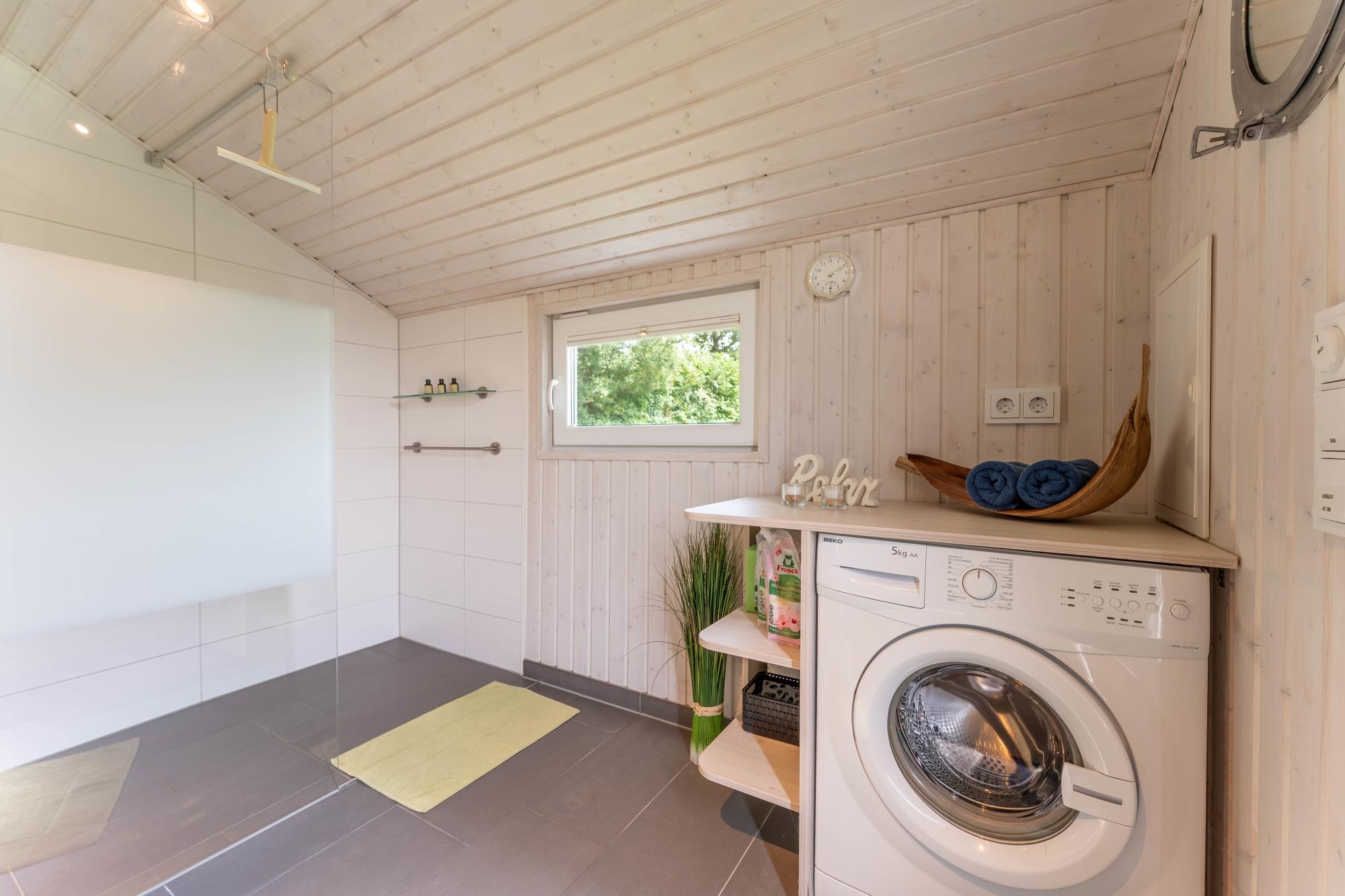 Anbau/Außensauna: Steinfliesen, Fußbodenheizung, Handtuchwärmer, ebenerdige Rainshowerdusche, Schwalldusche mit Kaltwasseranschluss, Massageduschbrause, Sauna, Aufgusseimer mit Schöpfkelle, CD-Radio mit USB-Anschluss und Bluetooth, Relax-CDs, Waschmaschine, Sitzbank, Fliegengitter, Plissee