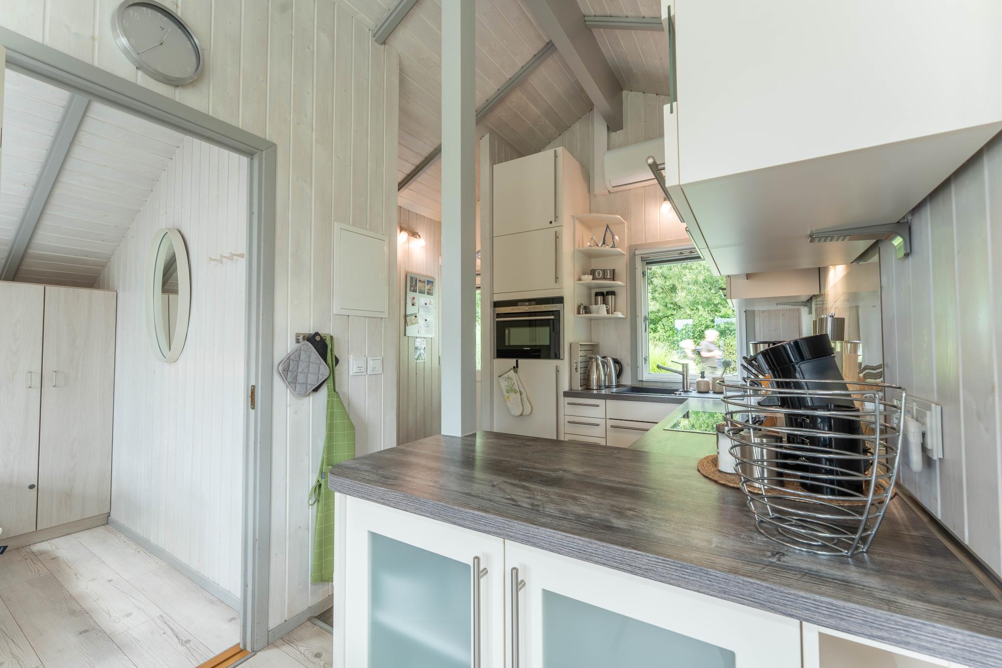 Die maßgefertigte Designküche integriert sich perfekt in den offen gehaltenen Wohnbereich und ist das Schmuckstück dieses besonderen Ferienhauses. Ein exklusiver Küchentraum der mit erstklassigem Kochgeschirr zum zaubern leckerer Gerichte einlädt und jeden Hobbykoch begeistern wird.