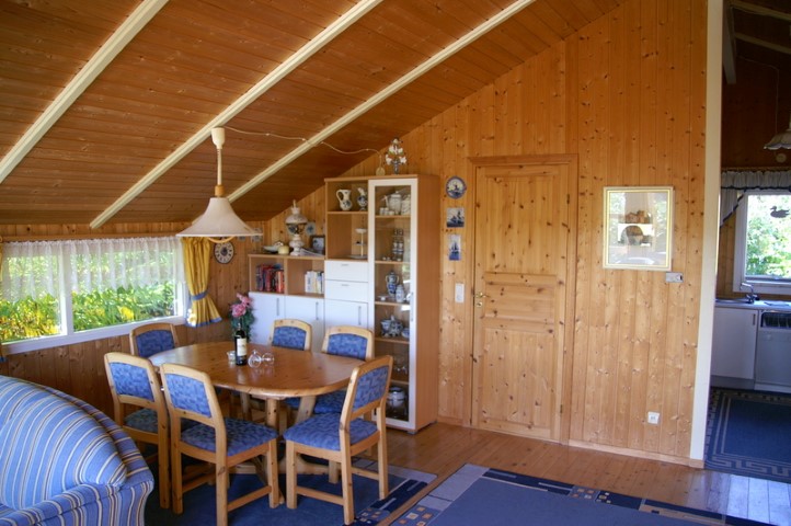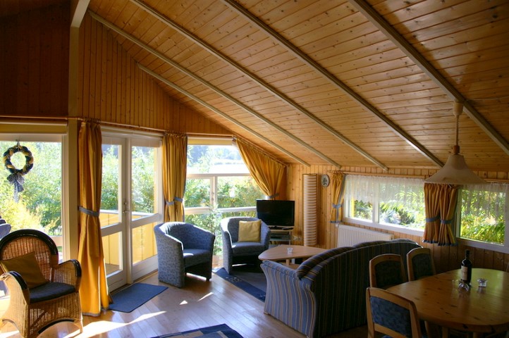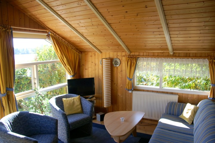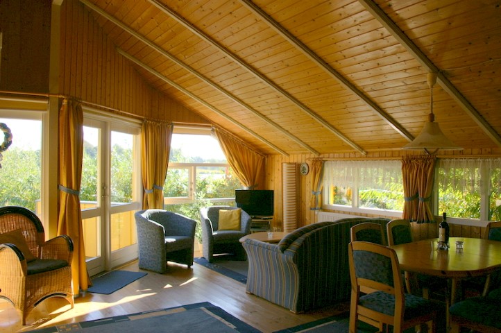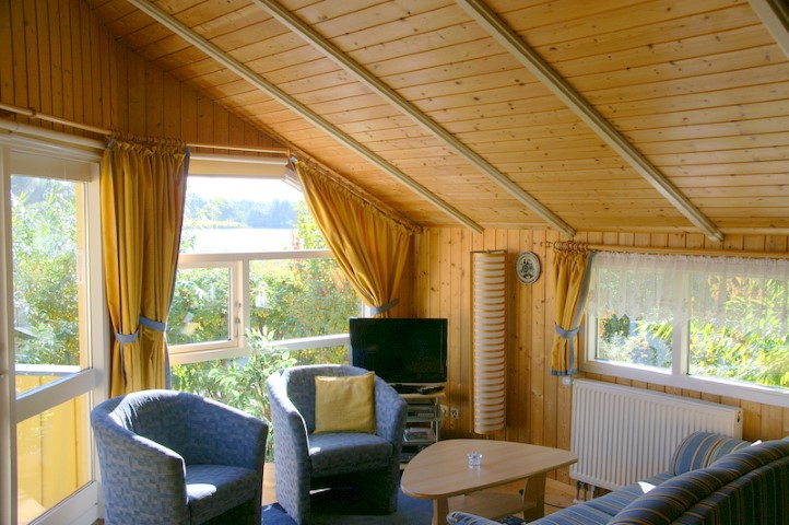 Der offen gehaltene Wohnraum bildet mit der sich anschließenden Küche den zentralen Mittelpunkt dieses Ferienhauses. Die Terrasse mit Gartenmöbeln ist von Ihrem Wohnzimmer zugänglich und geht zum See raus. Zu diesem Haus gehört eine weitere kleine Terrasse die sich im Eingangsbereich befindet. Dieses Haus ist ebenerdig und barrierefrei auch im Außenbereich.