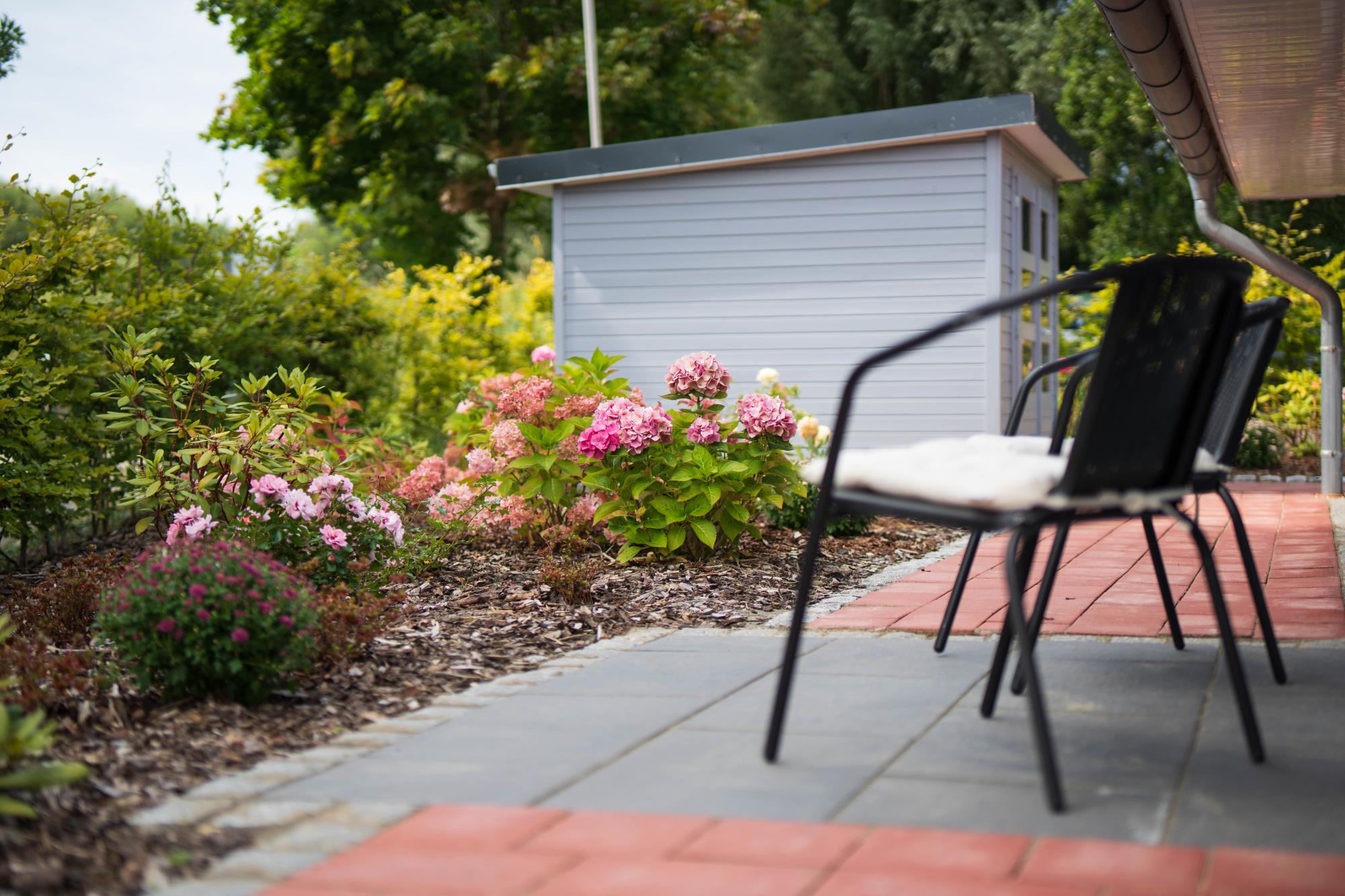 Außenbereich: Gartengrundstück mit teilüberdachter Terrasse mit Gartenmöbeln und Auflagen, Sonnenliegen, Sonnenschirm