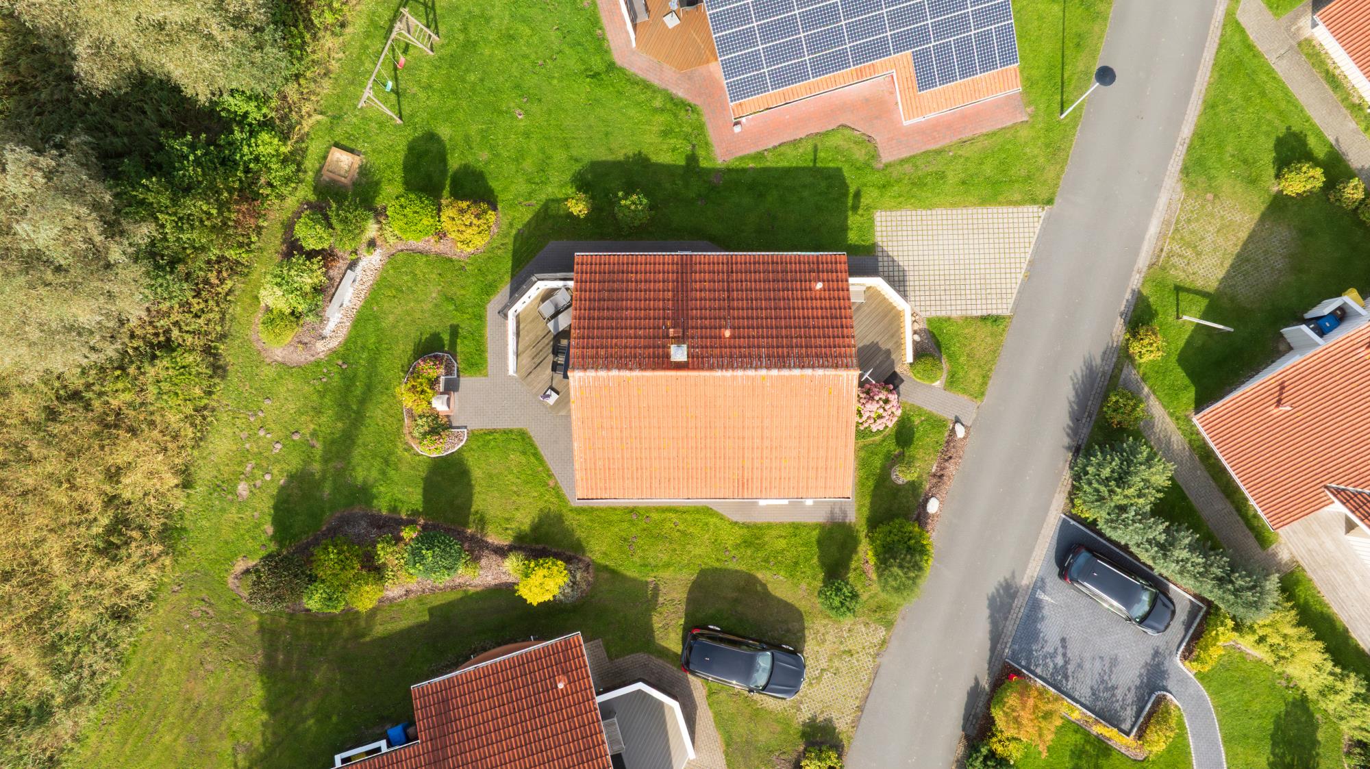 Die Außenanlage wurde 2021 neugestaltet, mit Pflasterflächen rund ums Haus.