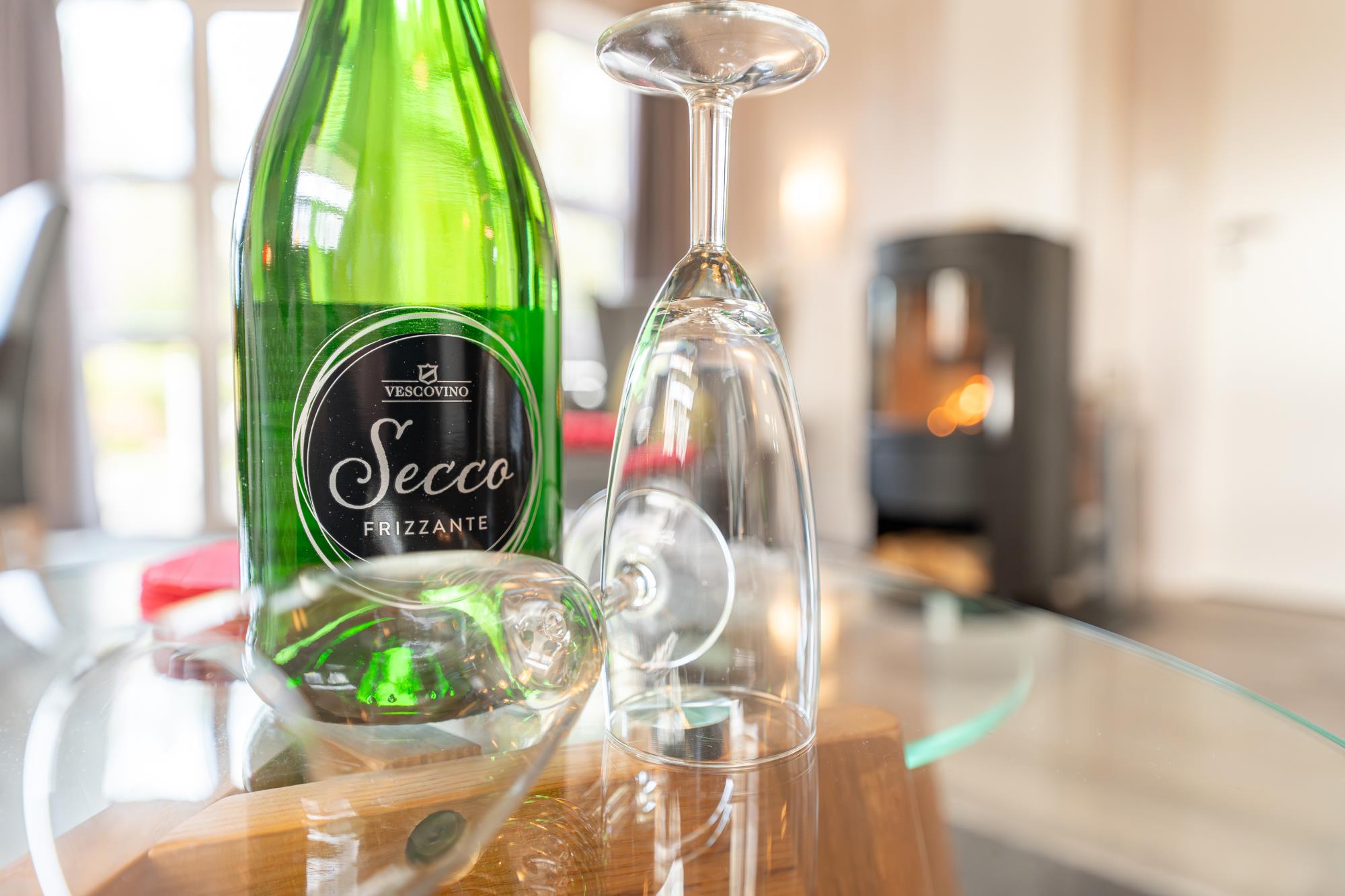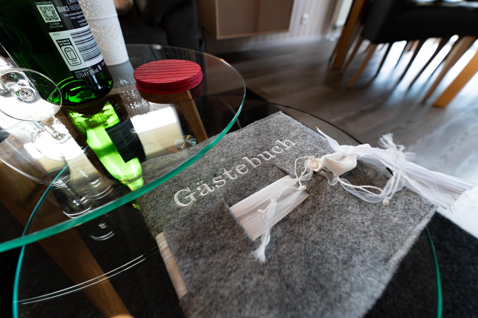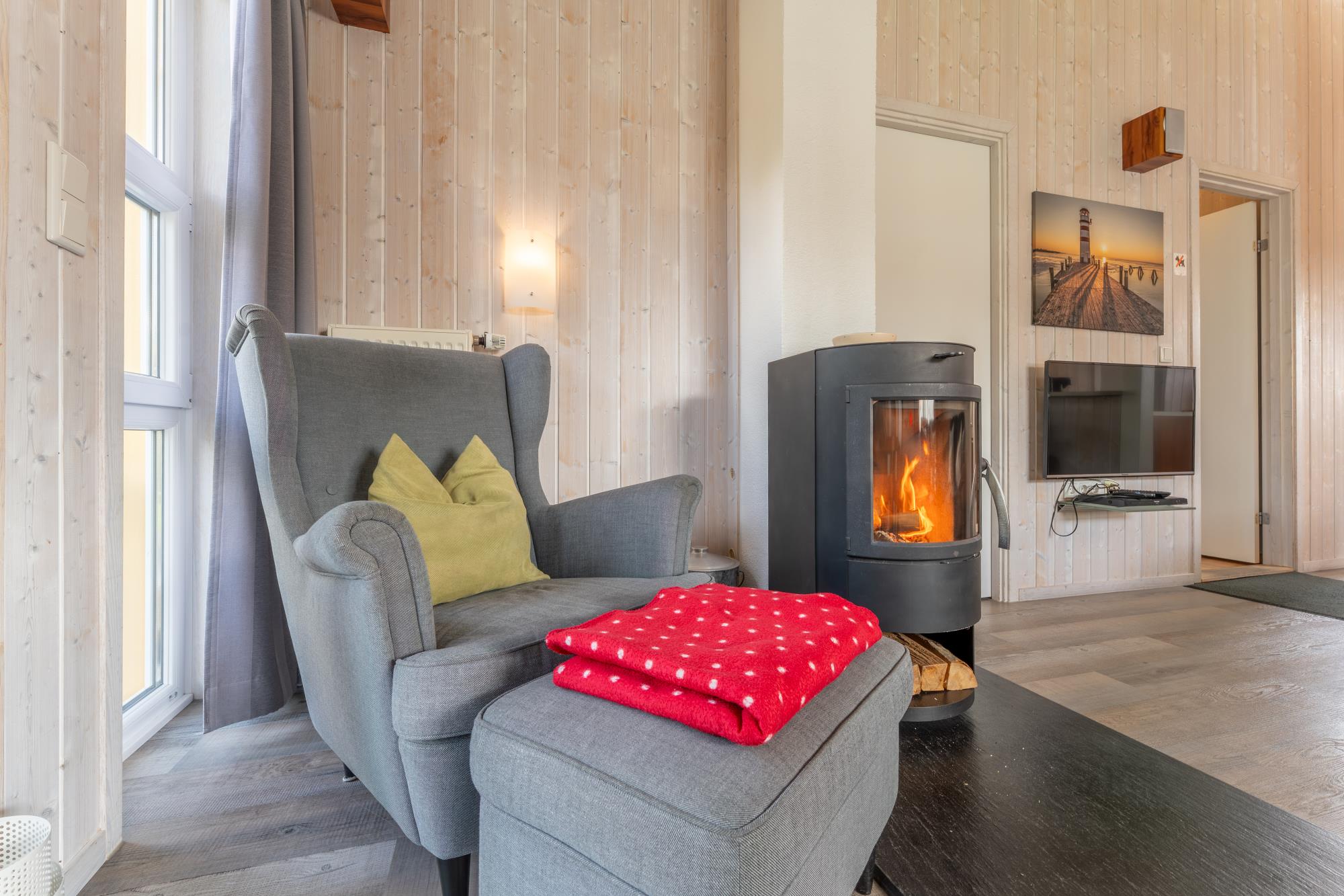 Es erwartet Sie ein modernes und freundliches Wohnzimmer mit Kaminofen.