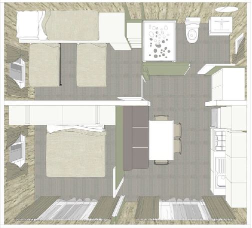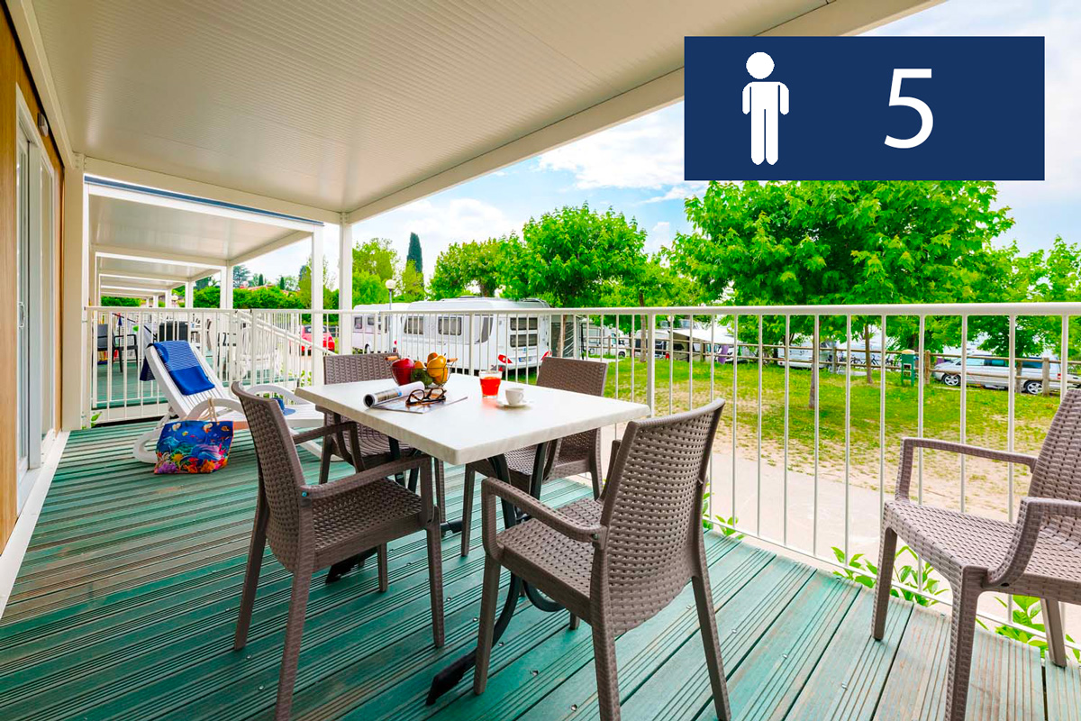 Das Mobilehome Prestige bietet Platz für maximal 5 Personen (davon mindestens 1 Kind unter 12 Jahren/60kg). Die Unterkunft verfügt über ein Schlafzimmer mit einem Doppelbett (190 cm x 160 cm) sowie ein zweites Schlafzimmer mit zwei Einzelbetten und einem Hochbett (jeweils 190 cm x 70 cm). Der Wohn- und Essbereich ist ausgestattet mit einem TV, einer Klimaanlage und einer Kochnische, die über einen Induktionsherd, Geschirr, Besteck, Töpfe, Pfannen sowie einen Kühlschrank mit Eisfach verfügt. Das Badezimmer umfasst ein Waschbecken, ein WC, eine Dusche und einen Haartrockner. Die überdachte Terrasse mit Tisch, Stühlen und einem Liegestuhl lädt zum entspannten Verweilen ein, während die Kinder sich auf dem Spielplatz oder im Pool austoben können. Fahrzeit ab ital. Grenze ca. 2h. Hinweis: Wenn Sie mehr als eine Unterkunft benötigen, ist dies bei uns in der Regel möglich, da wir über mehrere Objekte des gleichen Haustyps verfügen.