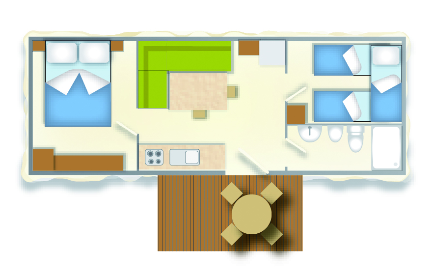 Das Mobilehome Blu Romantic bietet Platz für max. 5 Personen. Es verfügt über ein Schlafzimmer mit einem Doppelbett und einem weiteren Zimmer mit zwei Einzelbetten und einem Hochbett für ein Kind (unter 12 Jahren). Das Wohnzimmer verfügt über eine gemütliche Essecke mit SAT-TV. Die Küche ist im Wohnraum integriert und verfügt über einen Herd, Töpfe, Geschirr, Besteck und einen Kühlschrank mit Eisfach. Das Badezimmer besteht aus einer Dusche, WC und einem Waschbecken. Der überdachte Sitzplatz mit Tisch und Stühlen lädt zum gemütlichen Entspannen ein, während die Kinder sich auf dem Spielplatz austoben können. Hinweis: Wenn Sie mehr als eine Unterkunft benötigen, ist dies bei uns in der Regel möglich, da wir über mehrere Objekte des gleichen Haustyps verfügen.