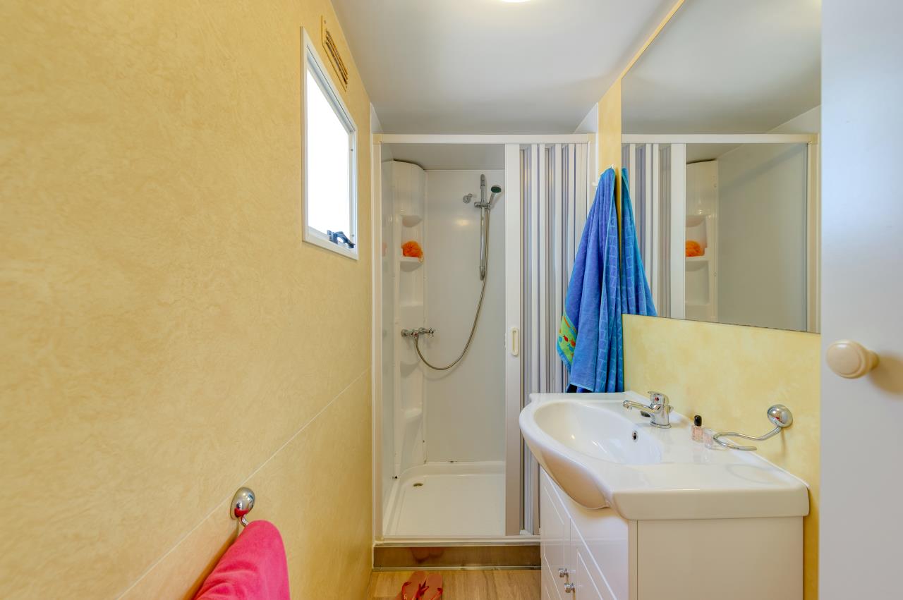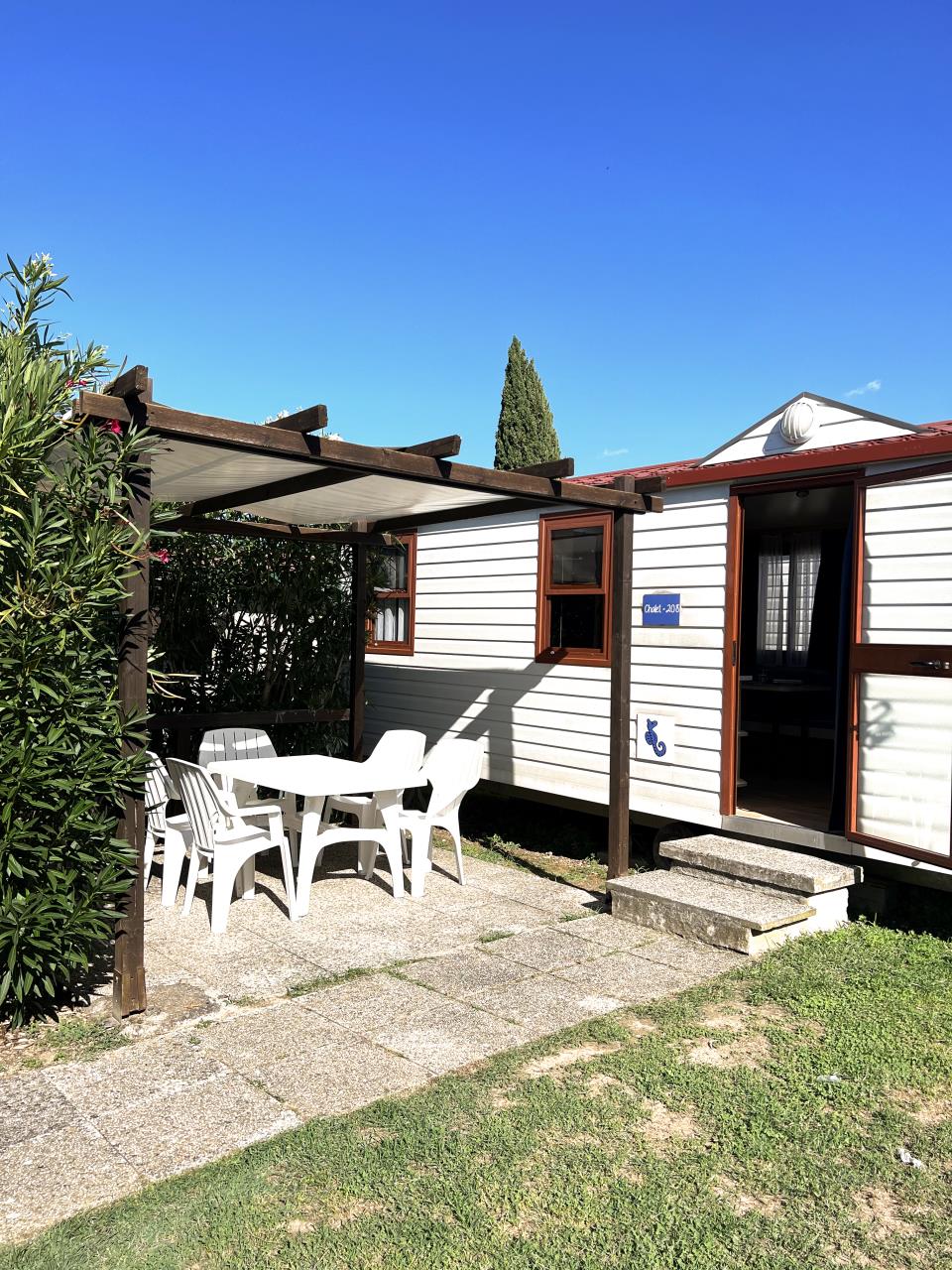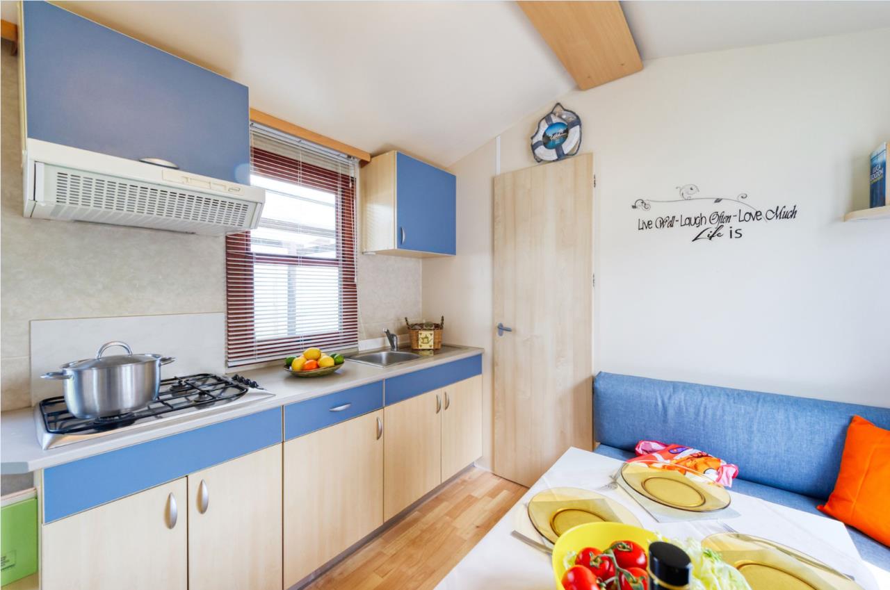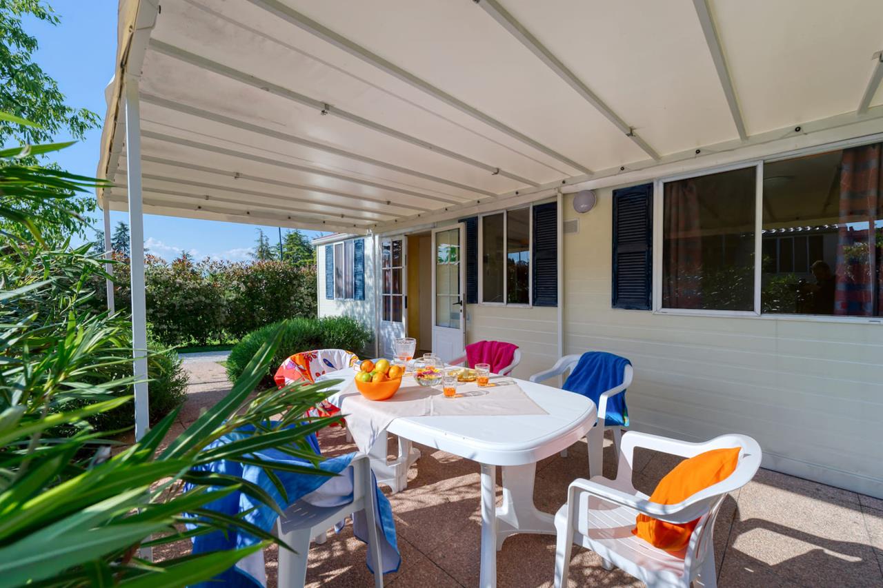 Das Mobilehome Chalet Thaiti bietet Platz für bis zu 4 Personen. Es verfügt über zwei Schlafzimmer: ein Schlafzimmer mit einem Doppelbett (190cm x 140cm) und ein Kinderzimmer mit zwei Einzelbetten (190cm x 70cm). Die gut eingerichtete Küchenzeile im kombinierten Wohn- und Essbereich ist mit einem Gasherd, Geschirr, Besteck, Töpfen, einer typisch italienischen Espressokanne und einem Kühlschrank ausgestattet. Das Badezimmer verfügt über eine Dusche, ein Waschbecken und ein WC. Der überdachte und möblierte Sitzplatz lädt zum gemeinsamen Entspannen und Verweilen ein, während sich die Kinder im Garten austoben können. Grillen ist mit einem Elektrogrill oder an der öffentlichen Grillstelle erlaubt. Hinweis: Wenn Sie mehr als eine Unterkunft benötigen, ist dies bei uns in der Regel möglich, da wir über mehrere Objekte des gleichen Haustyps verfügen. Fahrzeit ab italienischer Grenze beträgt etwa 2 Stunden.