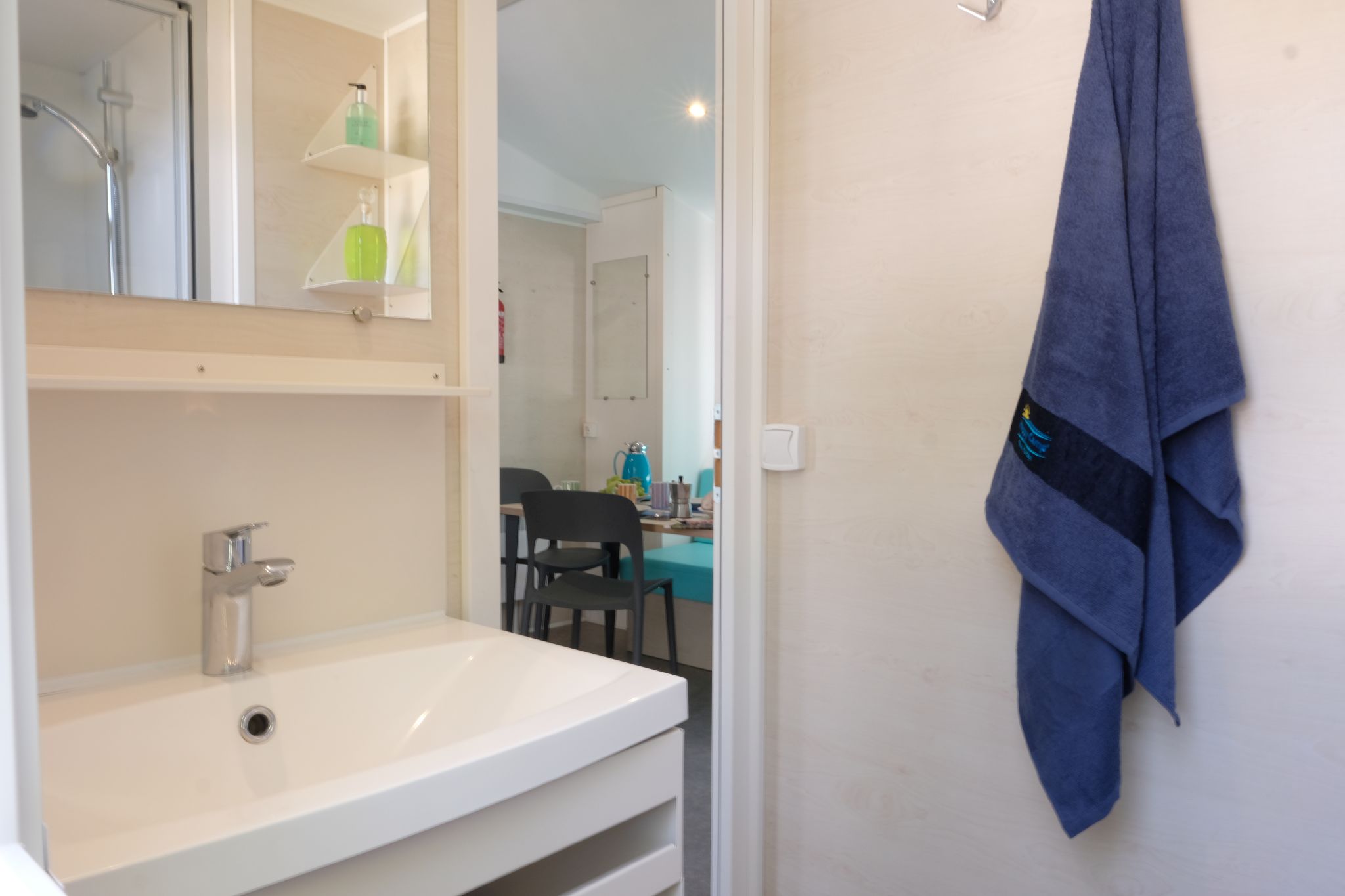 Das Mobilehome Happy Premium ist modern, hell und bequem. Es hat drei Schlafzimmer und bietet bis zu 7 Schlafmöglichkeiten. Die Küchenzeile ist ausgestattet mit Kühlschrank (kleines Gefrierfach), 4-Flammen-Gasherd, Spüle, Besteck, Geschirr und italienischer Espressokanne. Im Wohnraum befindet sich eine Schlafcouch. Ein Schlafzimmer ist mit einem Doppelbett ausgestattet, 2 Schlafzimmer mit je zwei Einzelbetten. Bad mit Dusche, WC und Waschbecken. Für draussen gibt es Gartenmöbel mit Tisch, Stühlen, 2 Liegen/Liegestühle und eine elektrische Grillplatte. Dieses Mobilheim hat eine halbüberdachte Holzterrasse. Hinweis Wenn Sie mehr als eine Unterkunft benötigen, ist dies bei uns in der Regel möglich, da wir über mehrere Objekte des gleichen Haustyps verfügen.