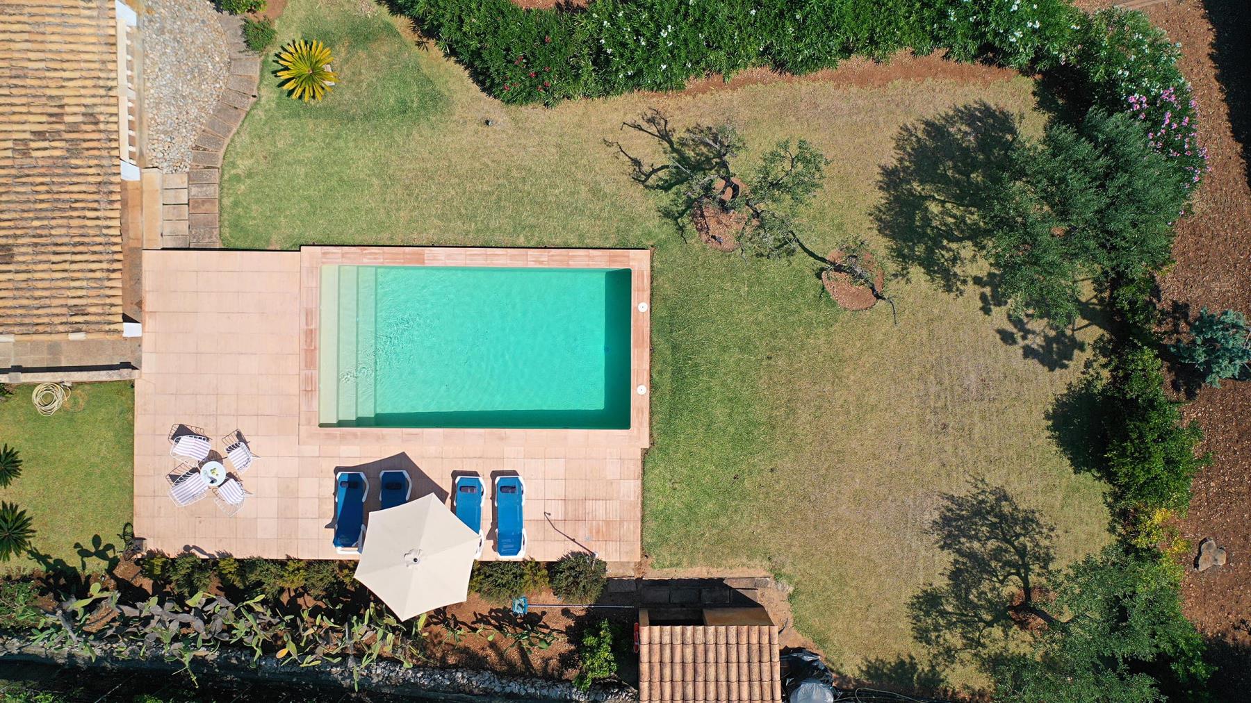 Direkt vom Wohnbereich gelangen Sie hinaus zu Ihrer sonnenverwöhnten Essterrasse und dem Pool, umgeben von einer großen Rasenfläche, die zum Sonnenbaden einlädt. Für entspannte Stunden in der kühleren Brise sorgt eine überdachte Terrasse. Und für unvergessliche Abende im Freien steht Ihnen Ihr eigener mobiler Grill für ein rustikales Barbecue nach spanischer Art zur Verfügung.