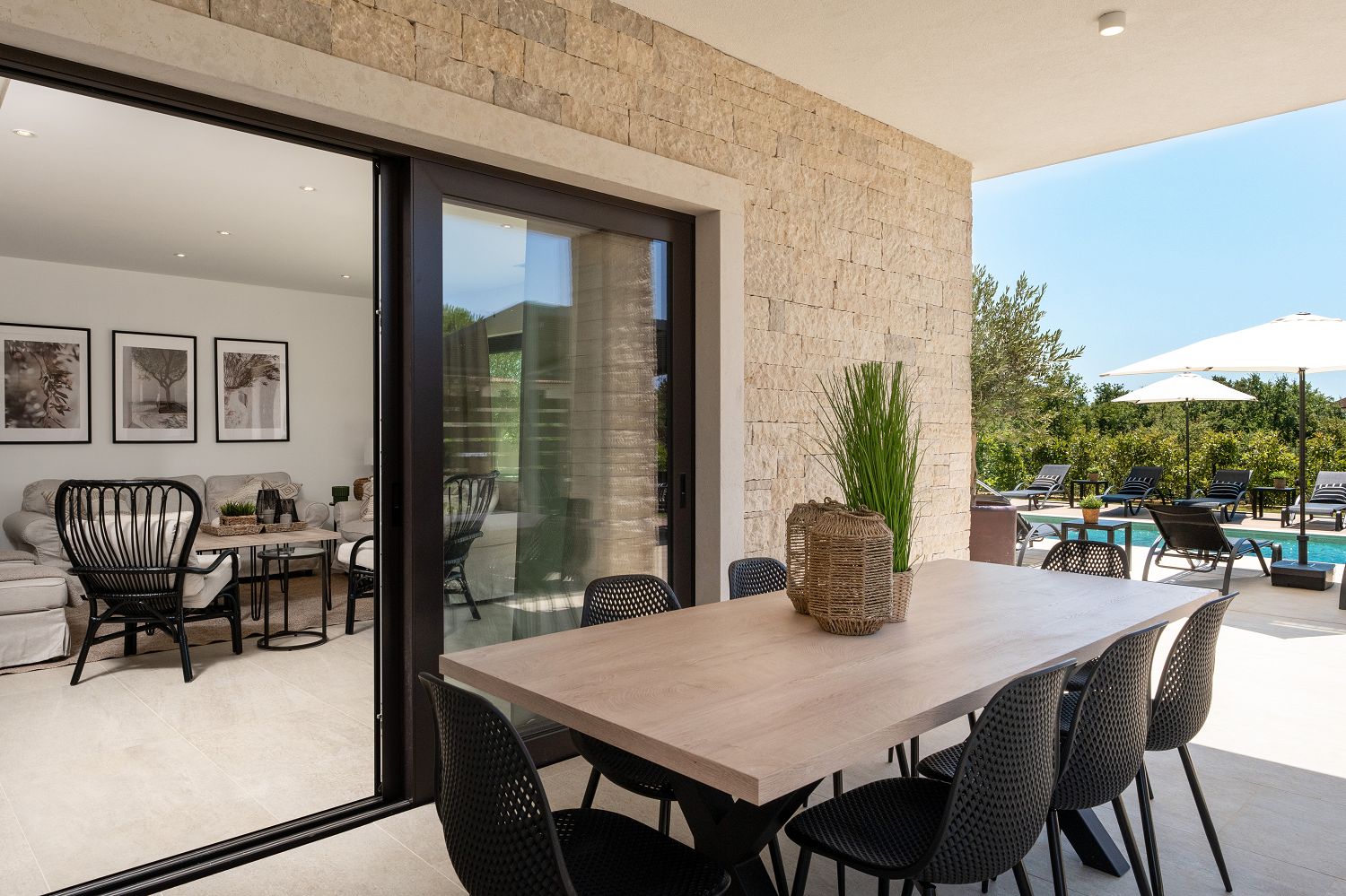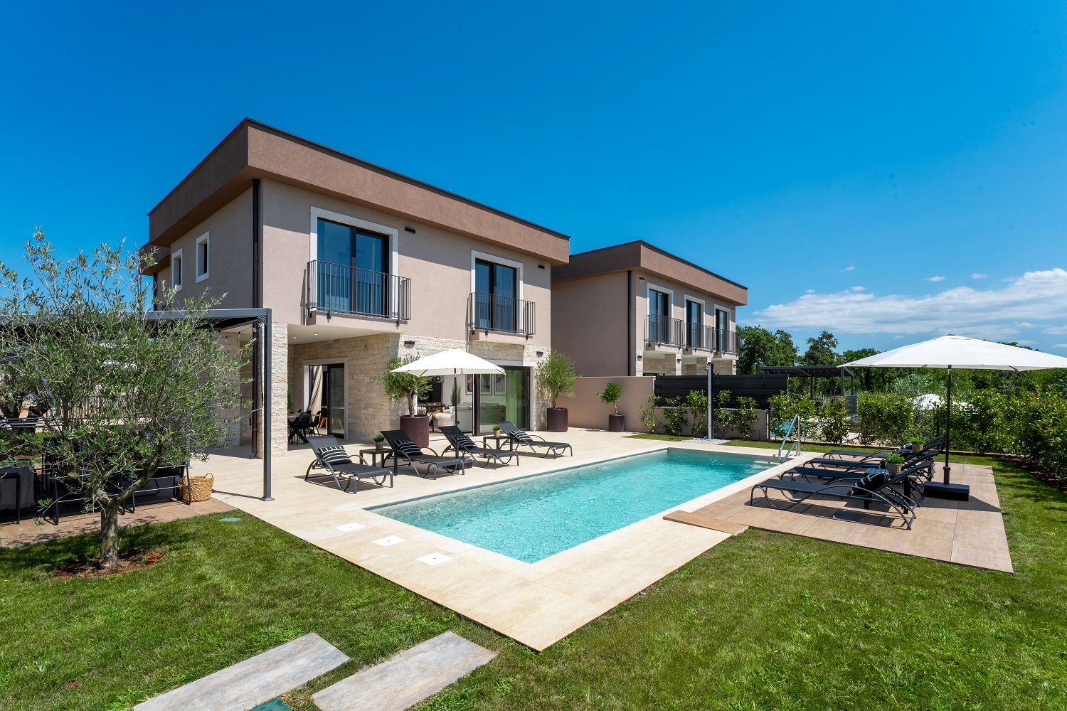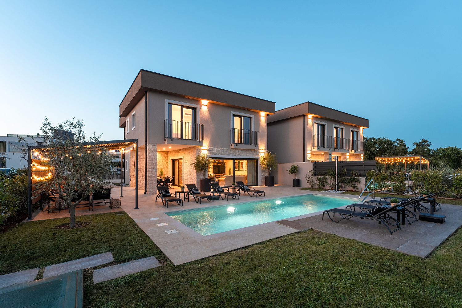 Die neu erbaute Villa mit Pool liegt am Stadtrand von Porec, ca. drei Kilometer vom Meer und fünf Autominuten vom Stadtzentrum entfernt. Das Haus liegt auf einem komplett eingezäunten Gartengrundstück von 700 m² am Rande des Dorfes Vranici und bietet seinen Gästen einen 36 m² großen Pool, eine überdachte Terrasse mit Grill, Sitzgarnitur, Liegestühlen und einem Lounge-Set. Im Hof befinden sich ebenfalls Parkplätze für drei Fahrzeuge. Die moderne Villa für acht Personen erstreckt sich über drei vollklimatisierte Etagen und verfügt über eine Gesamtfläche von 290 m². Im Erdgeschoss befinden sich ein geräumiges Wohnzimmer mit Zugang zur Terrasse und zum Pool, eine voll ausgestattete Küche, ein Esstisch und eine separate Toilette. Im ersten Stock befinden sich vier Schlafzimmer mit Doppelbetten, jeweils mit eigener Dusche/WC und kleinem Balkon mit Blick auf den Pool und die grüne Umgebung. Das Besondere dieser Villa ist der Unterhaltungsraum im Souterrain mit Sofa und Fernseher, Tischfußball, Billard, Heimtrainer und Sauna sowie einer weiteren Dusche. Dank ihrer Lage ist die Villa ein ideales Ferienhaus in Porec, in dem Sie Ruhe und Frieden genießen können, während Sie gleichzeitig weniger als fünf Autominuten vom Strand, Geschäften, Restaurants und zahlreichen anderen Annehmlichkeiten entfernt sind. Jugendgruppen sind nicht gestattet.
