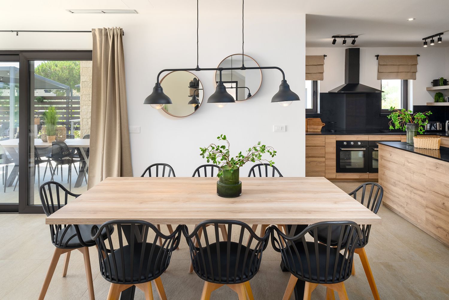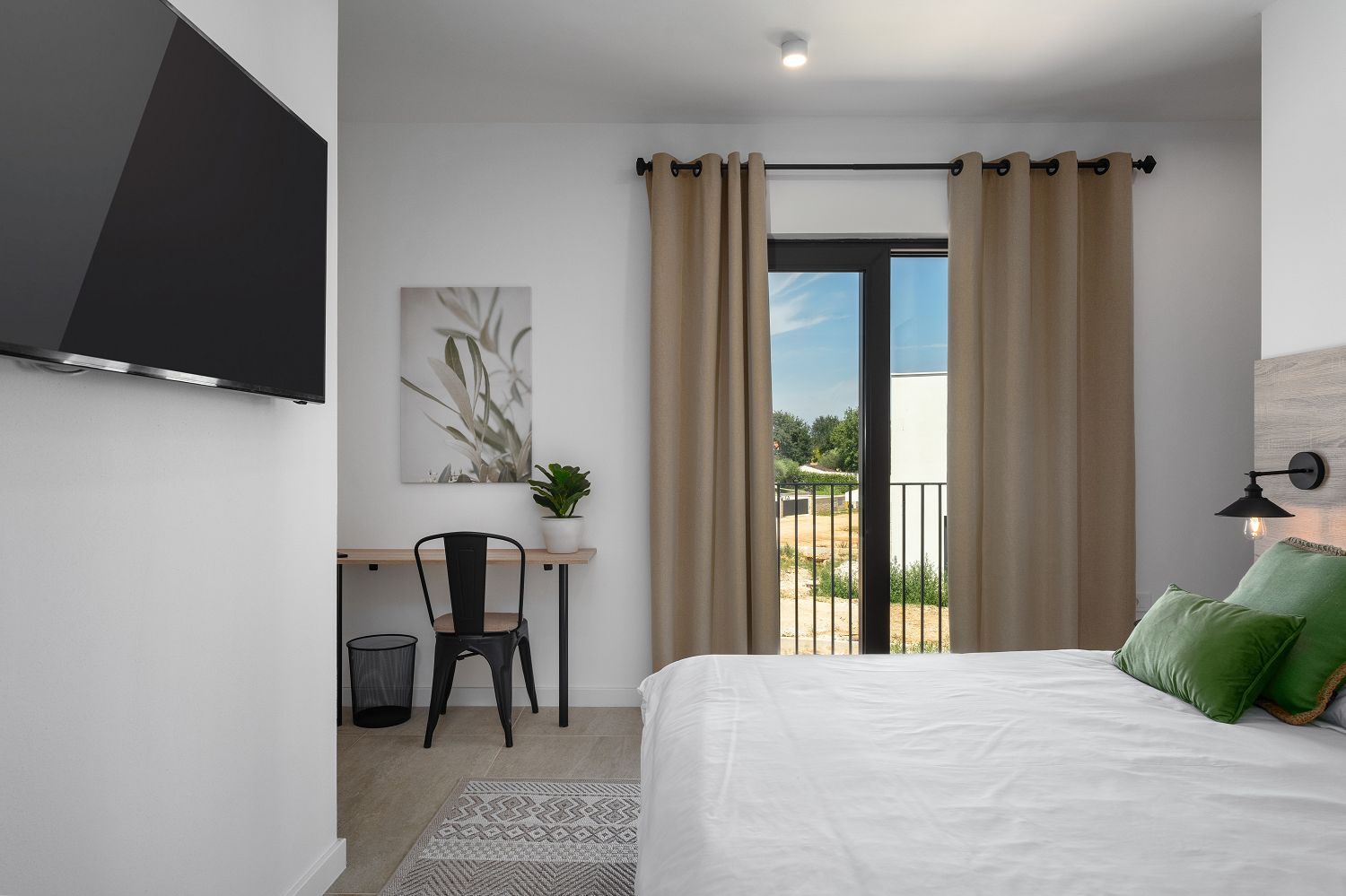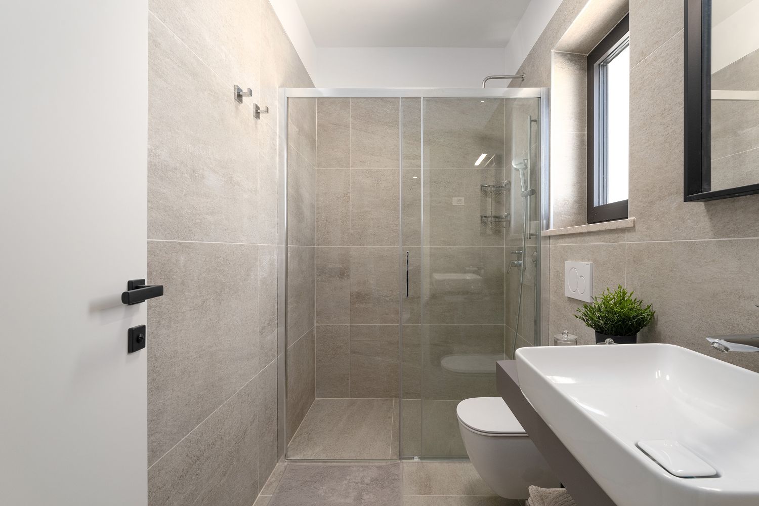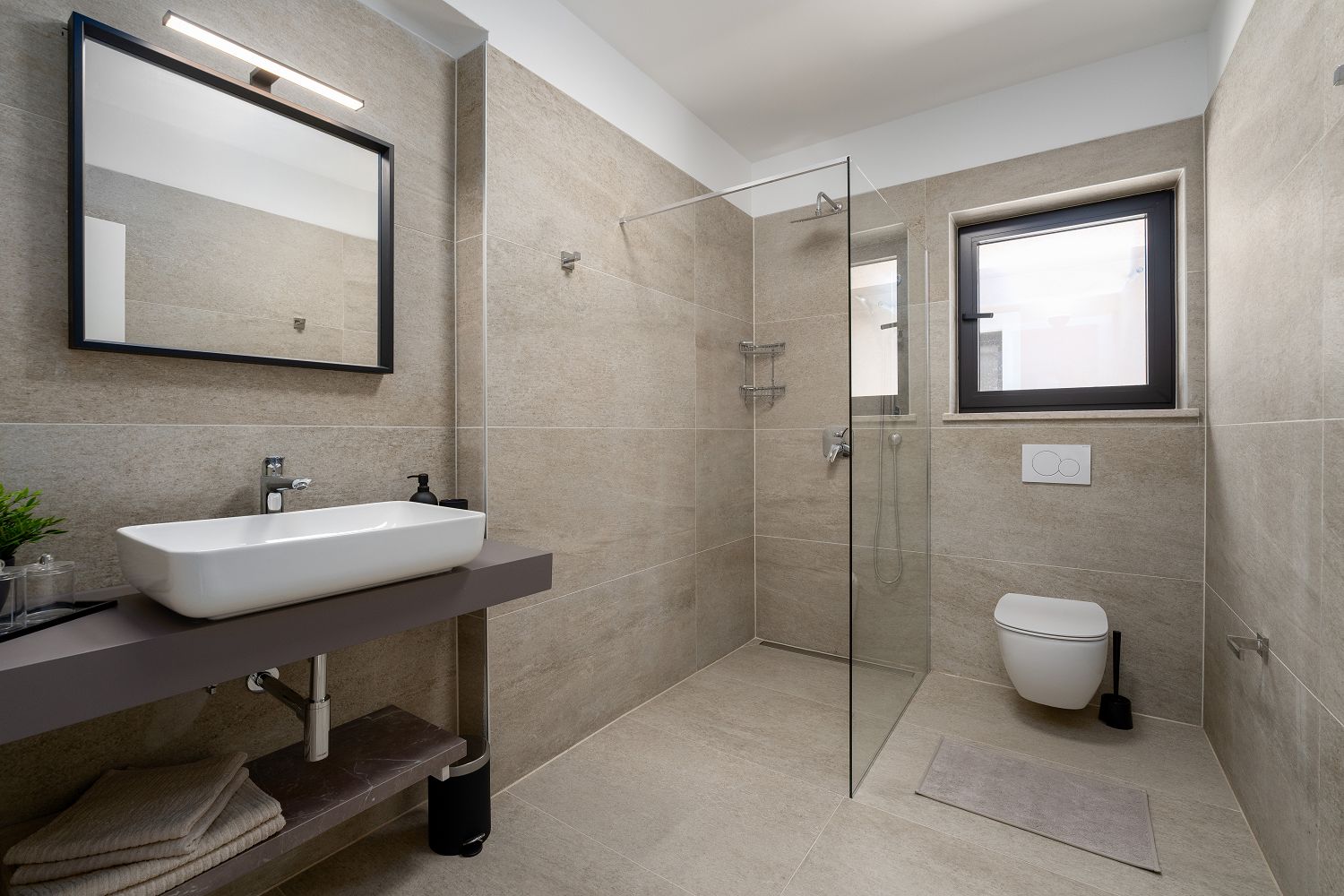 Die neu erbaute Villa mit Pool liegt am Stadtrand von Porec, ca. drei Kilometer vom Meer und fünf Autominuten vom Stadtzentrum entfernt. Das Haus liegt auf einem komplett eingezäunten Gartengrundstück von 700 m² am Rande des Dorfes Vranici und bietet seinen Gästen einen 36 m² großen Pool, eine überdachte Terrasse mit Grill, Sitzgarnitur, Liegestühlen und einem Lounge-Set. Im Hof befinden sich ebenfalls Parkplätze für drei Fahrzeuge. Die moderne Villa für acht Personen erstreckt sich über drei vollklimatisierte Etagen und verfügt über eine Gesamtfläche von 290 m². Im Erdgeschoss befinden sich ein geräumiges Wohnzimmer mit Zugang zur Terrasse und zum Pool, eine voll ausgestattete Küche, ein Esstisch und eine separate Toilette. Im ersten Stock befinden sich vier Schlafzimmer mit Doppelbetten, jeweils mit eigener Dusche/WC und kleinem Balkon mit Blick auf den Pool und die grüne Umgebung. Das Besondere dieser Villa ist der Unterhaltungsraum im Souterrain mit Sofa und Fernseher, Tischfußball, Billard, Heimtrainer und Sauna sowie einer weiteren Dusche. Dank ihrer Lage ist die Villa ein ideales Ferienhaus in Porec, in dem Sie Ruhe und Frieden genießen können, während Sie gleichzeitig weniger als fünf Autominuten vom Strand, Geschäften, Restaurants und zahlreichen anderen Annehmlichkeiten entfernt sind. Jugendgruppen sind nicht gestattet.
