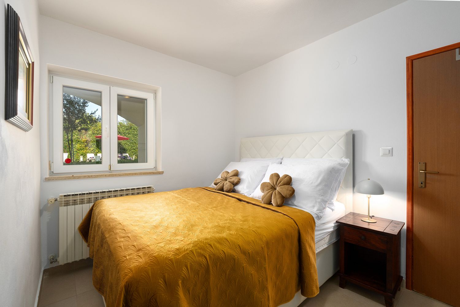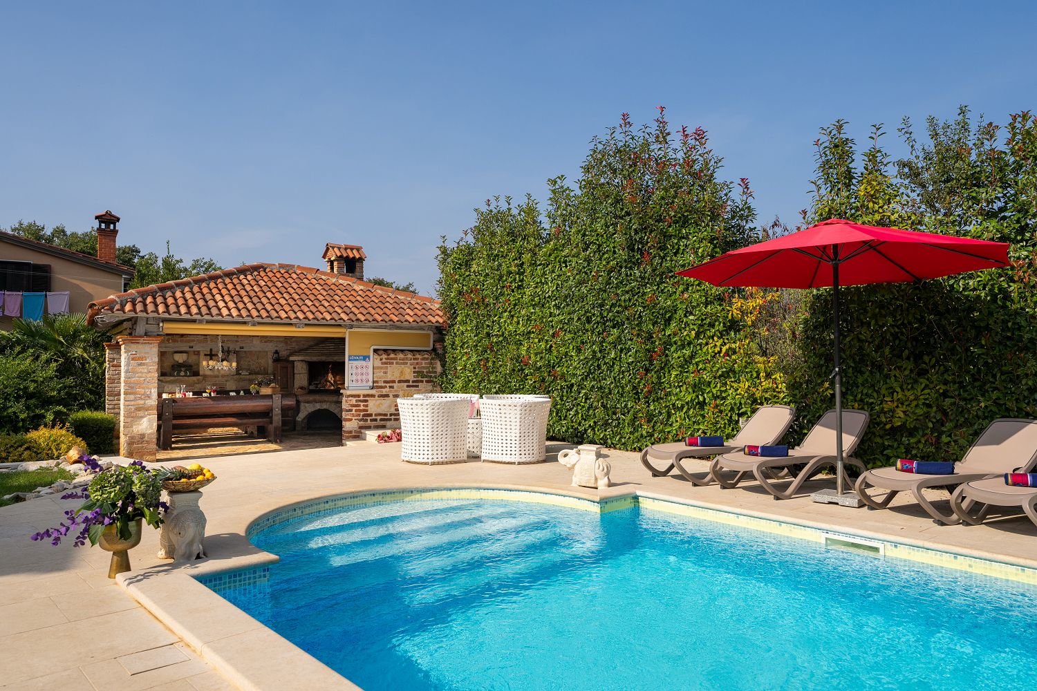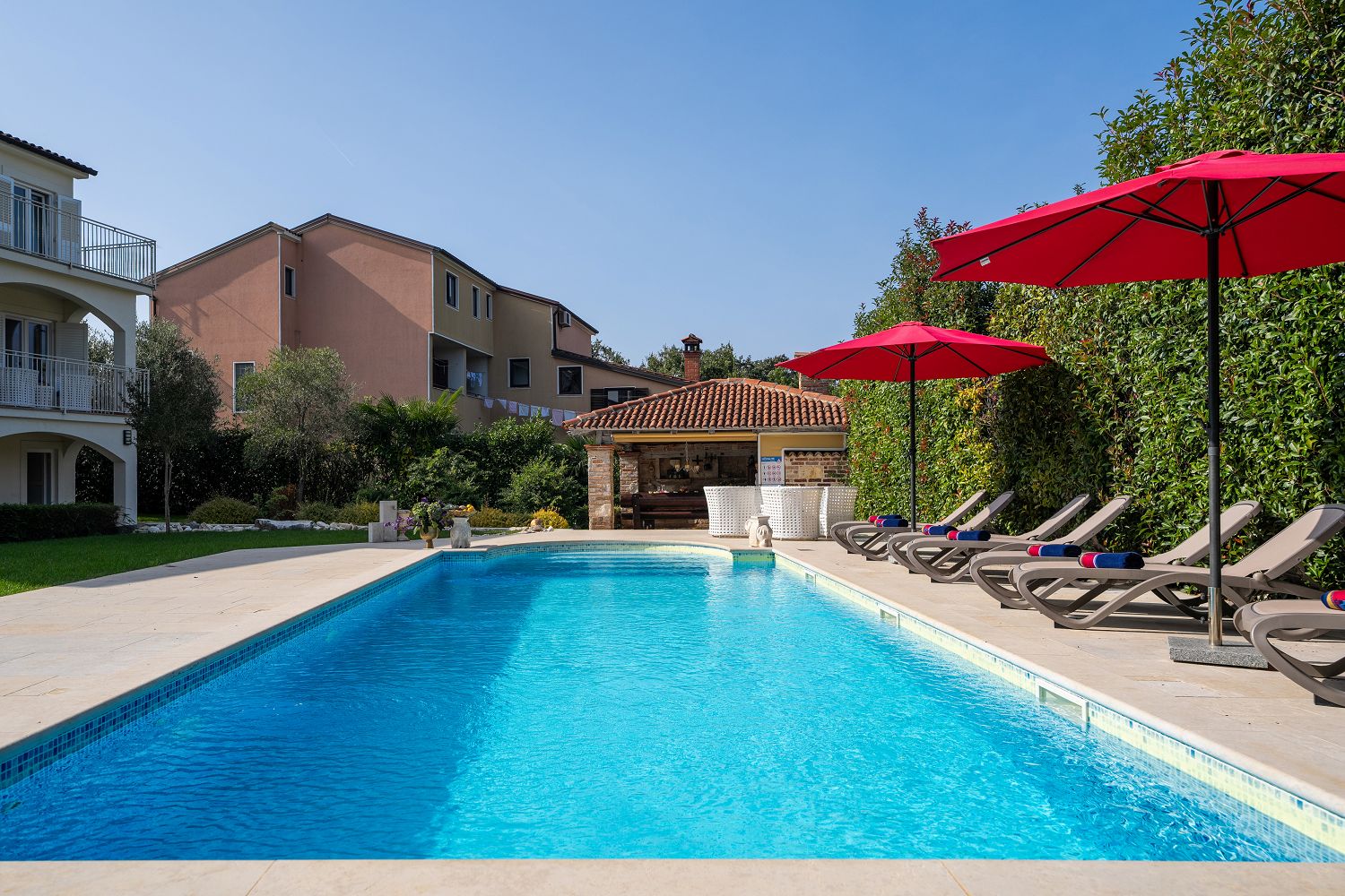 Die Villa ist ein wunderschönes, modern ausgestattetes Ferienhaus im Ortsteil Gornji Špadici. Es liegt nur 1.200 Meter vom Meer und fünf Autominuten vom Zentrum von Porec entfernt. Das Haus liegt in ruhiger Lage auf einem komplett eingezäunten, gepflegten 1.200 m² großen Garten und bietet seinen Gästen Folgendes: Einen 36 m² großen Pool, der von Grün, Liegestühlen und Sitzgelegenheiten umgeben ist, eine Sommerküche mit überdachter Terrasse und Grill sowie mehrere Parkplätze im Hof. Die Villa bietet Platz für bis zu 12 Personen und ist ideal für Familien mit Kindern. Sie verfügt über eine Fläche von 350 m² auf drei vollklimatisierten Etagen mit sechs Schlafzimmern und sechs Badezimmern. Im Erdgeschoss befindet sich ein geräumiges Wohnzimmer mit Zugang zu einer überdachten Terrasse mit Gartenmöbeln sowie eine voll ausgestattete Küche mit Esstisch. Im unteren Teil des Erdgeschosses befindet sich ein Schlafzimmer mit eigener Dusche und WC sowie direktem Zugang zum Garten und Pool. Ein weiteres Badezimmer ist ebenfalls vorhanden. Im ersten Stock befinden sich zwei geräumige Schlafzimmer mit Doppelbetten und Zugang zu einem Balkon mit Blick auf den Garten und den Pool sowie ein Badezimmer mit Badewanne im Flur. Im Zwischengeschoss befindet sich ein 25 m² großes Schlafzimmer mit Doppelbett, Satellitenfernsehen und einem eigenen Badezimmer mit Dusche und WC. Im zweiten Stock befinden sich zwei weitere Doppelzimmer mit jeweils eigenem Bad und Zugang zu einem Balkon mit herrlichem Panoramablick auf das Meer und die grüne Umgebung. Haustiere sind willkommen. Jugendgruppen sind nicht gestattet.