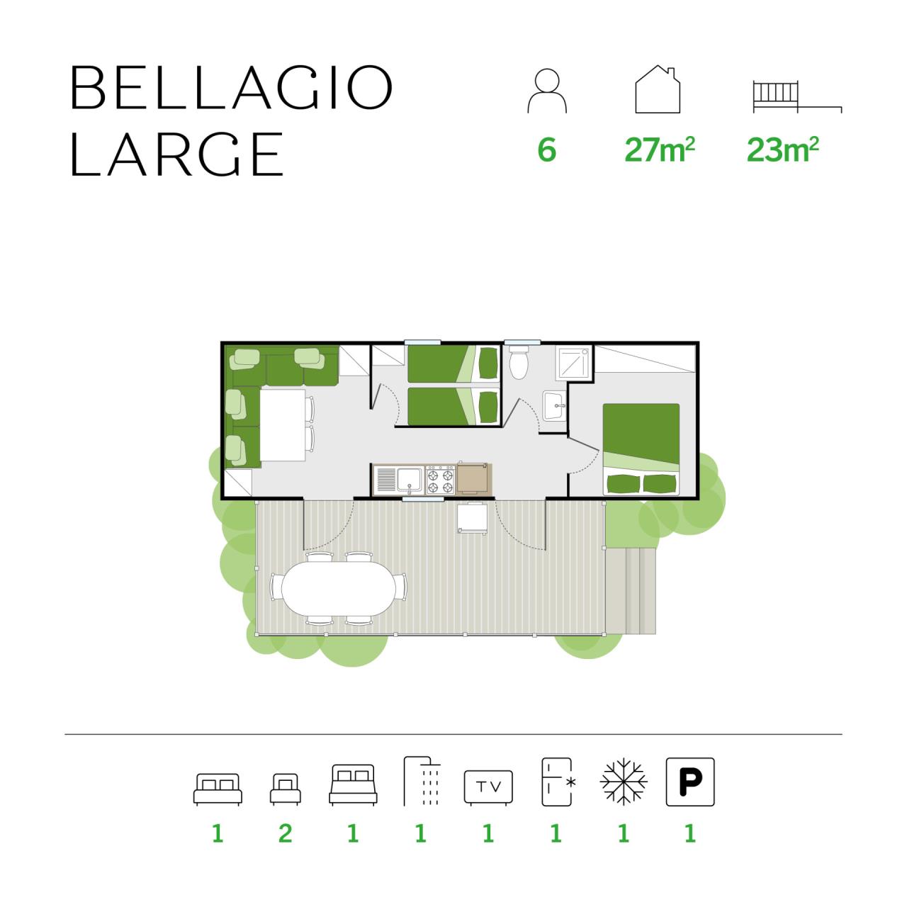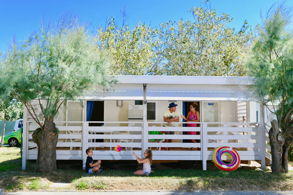 Das Mobilehome ist 27qm gross, befindet sich nur wenige Meter vom Wasserpark entfernt und bietet Platz für bis zu 6 Personen. Es gibt ein Schlafzimmer mit Doppelbett, sowie ein Schlafzimmer mit zwei Einzelbetten. Im Wohnbereich gibt es zusätzlich ein Schlafsofa für bis zu 2 Personen. Ebenfalls im Wohnbereich befindet sich eine gut ausgestattete Küchenzeile mit einem Gasherd, Geschirr, Besteck, Töpfen, Pfannen und einem Kühlschrank mit integriertem Gefrierfach. Das Badezimmer verfügt über eine Dusche, ein Waschbecken und ein WC. Die 23qm grosse, überdachte Terrasse mit Tisch und Stühlen lädt zum gemütlichen Entspannen ein, während die Kinder sich auf dem Spielplatz oder am Pool austoben können. Ein TV ist in der Unterkunft vorhanden. Grillen ist in dieser Anlage erlaubt. Die Fahrzeit ab der ital. Grenze beträgt ca. 3.5h. Hinweis: Wenn Sie mehr als eine Unterkunft benötigen, ist dies bei uns in der Regel möglich, da wir über mehrere Objekte des gleichen Haustyps verfügen.