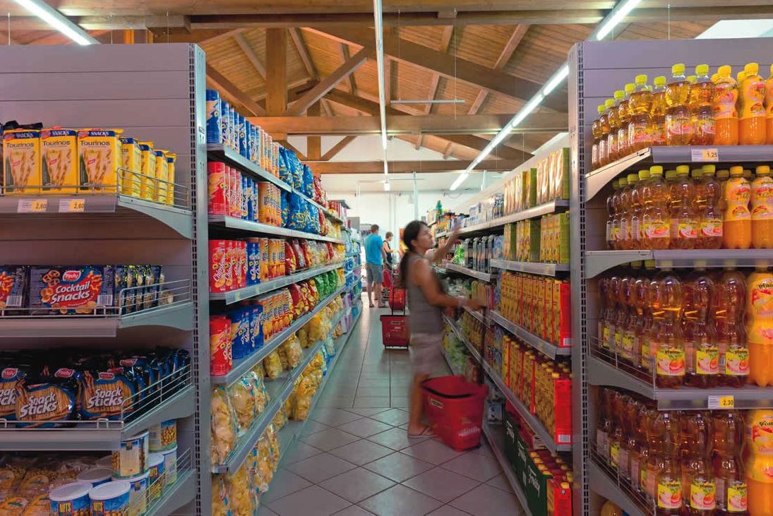 EINKAUFENIm Supermarkt des Ferienparks bekommt man frisches Obst und Gemüse, Brot, Aufschnitt, Käse und weitere Lebensmittel. Die Anlage verfügt auch über einen Bazar mit Tabakwaren, Zeitungen, Kinderspielzeug, Strandkleidung, Souvenirs und Campingartikeln.